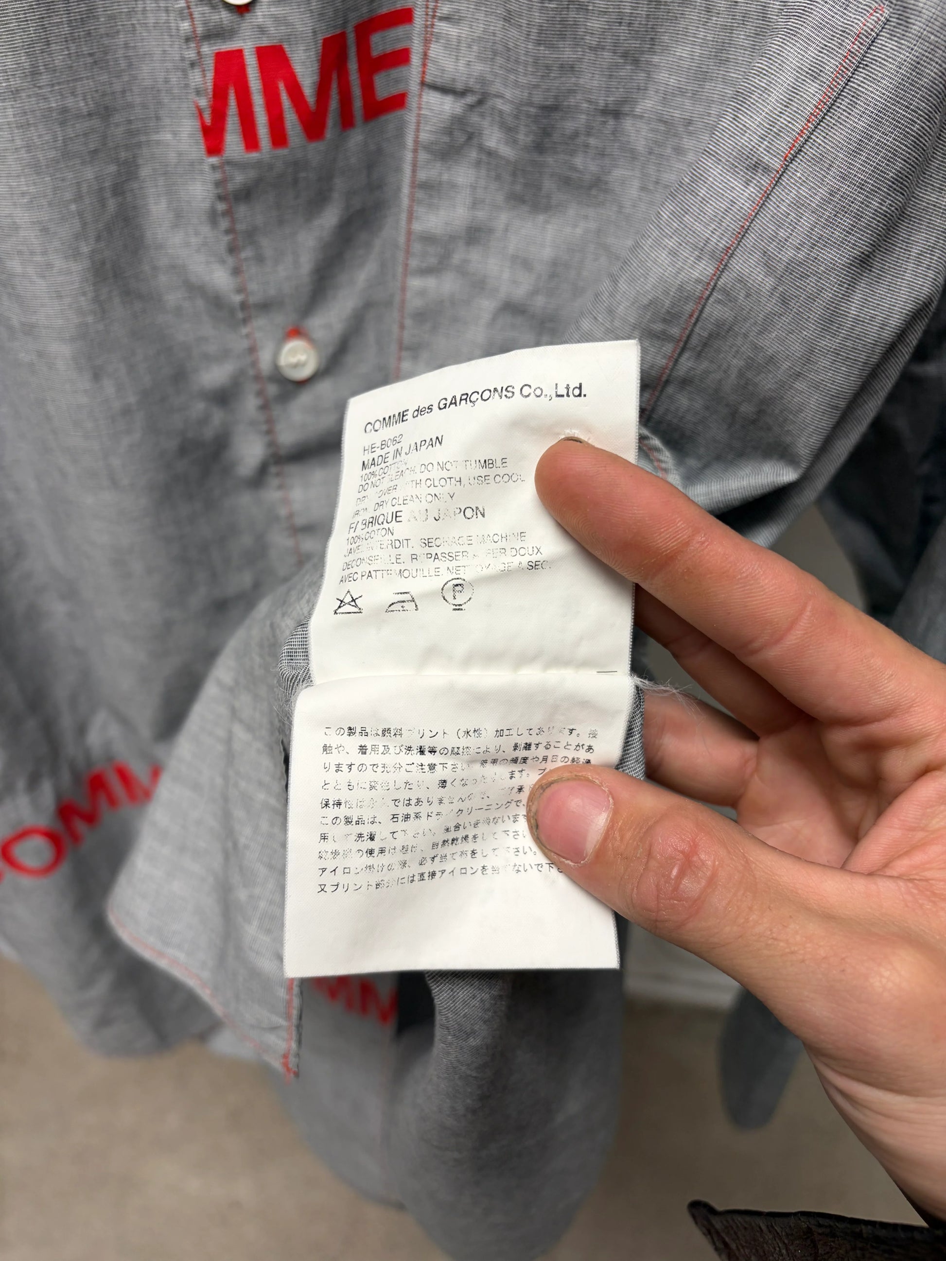 For sale is a 2001 Comme Des Garçons Homme ‘Split Logo’ Red/Grey Button Up Shirt