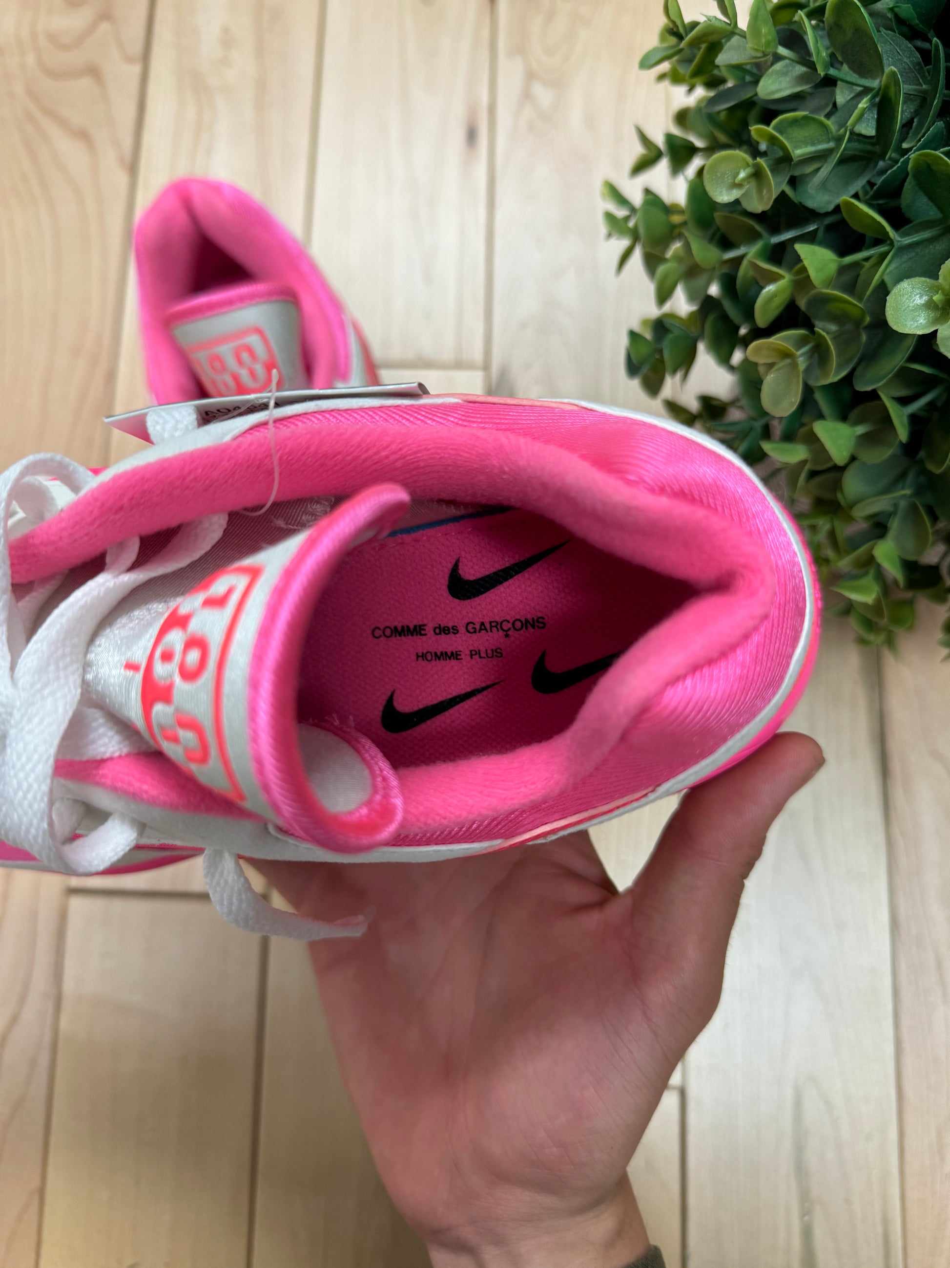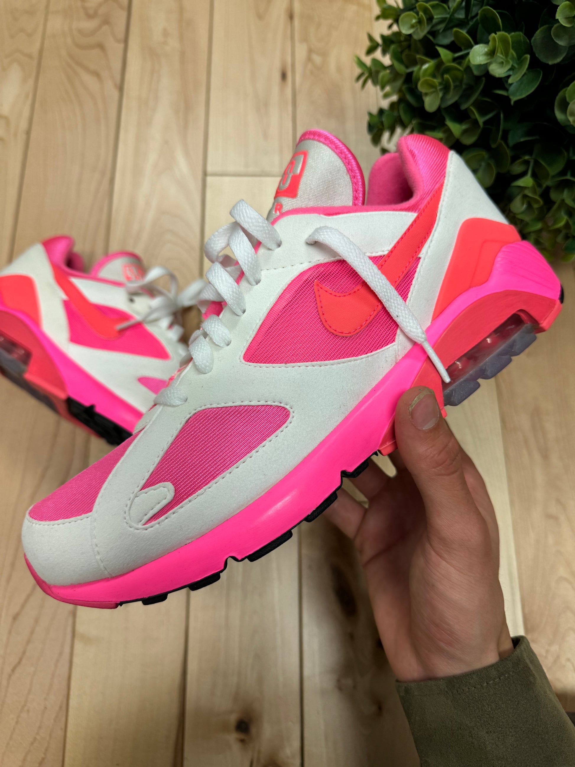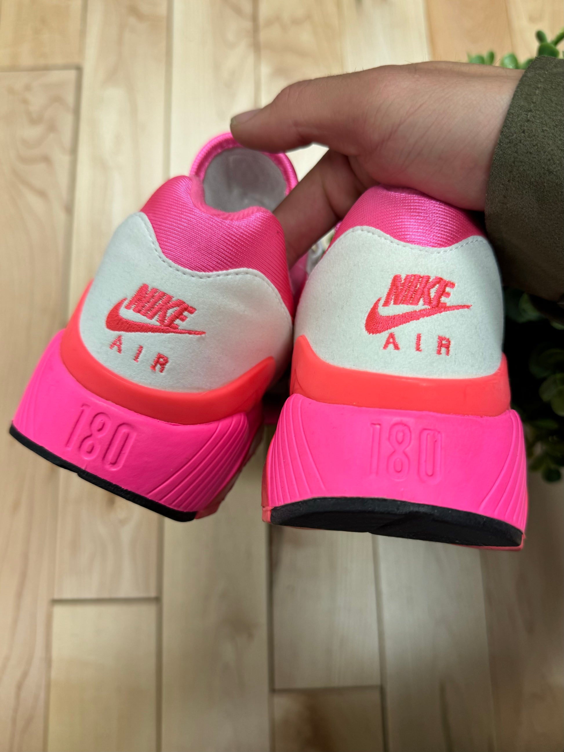For sale is a pair of brand new with tags 2018 Comme Des Garçons x ‘Nike Air Max 180’ Low Top Sneakers. Coming in a crisp pink and white colorway, these sneakers are a size US 8 (EU 41). Here is the opportunity to purchase a gorgeous pair of Comme Des Garçons Homme Plus x Nike Air Max 180 sneakers for a fantastic price.