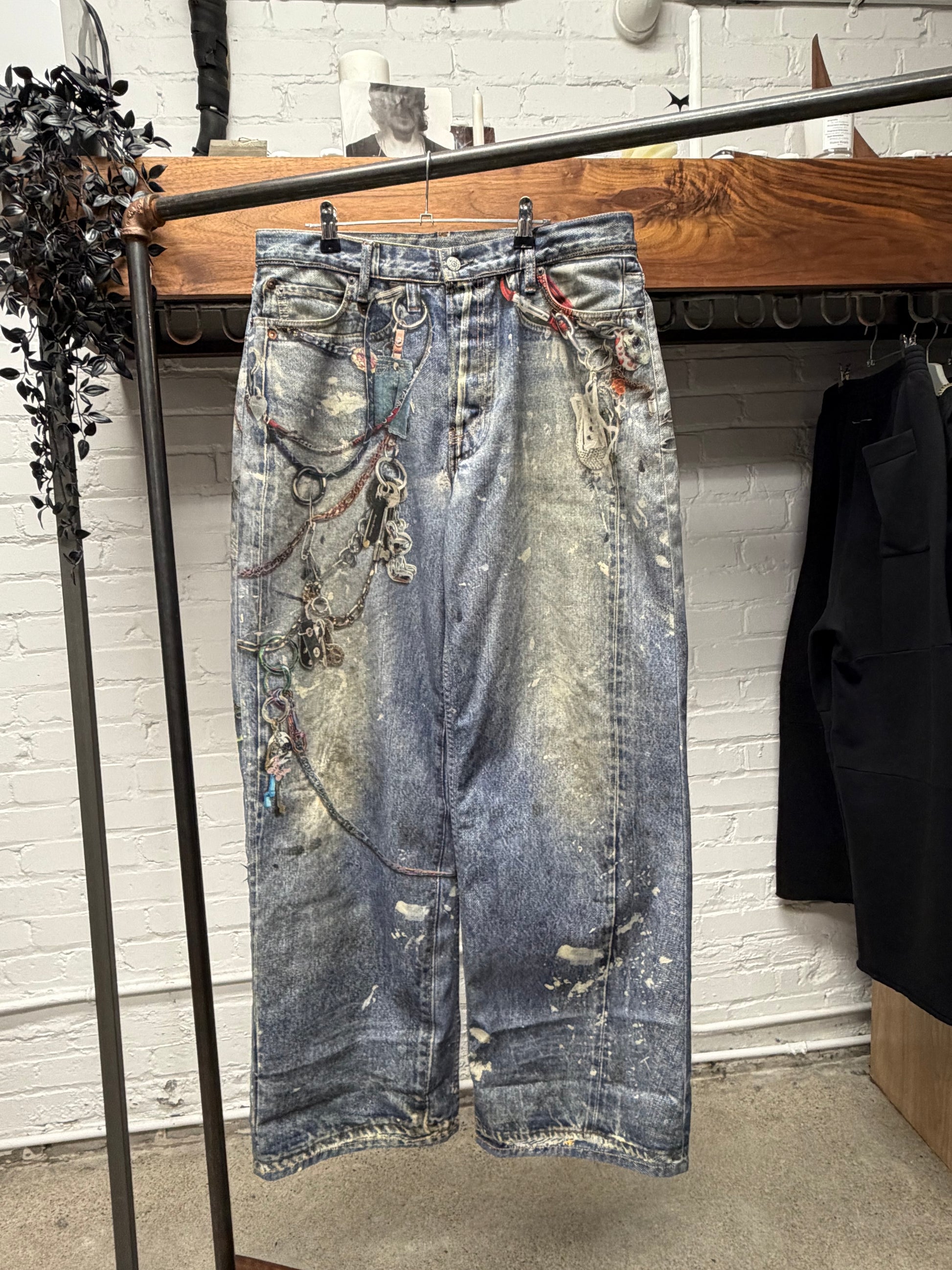 -most popular pair of Acne Studios ‘Trompe L’œil’ denim, featuring a wallet chain illusion and other assorted clip on items that are printed onto the jeans