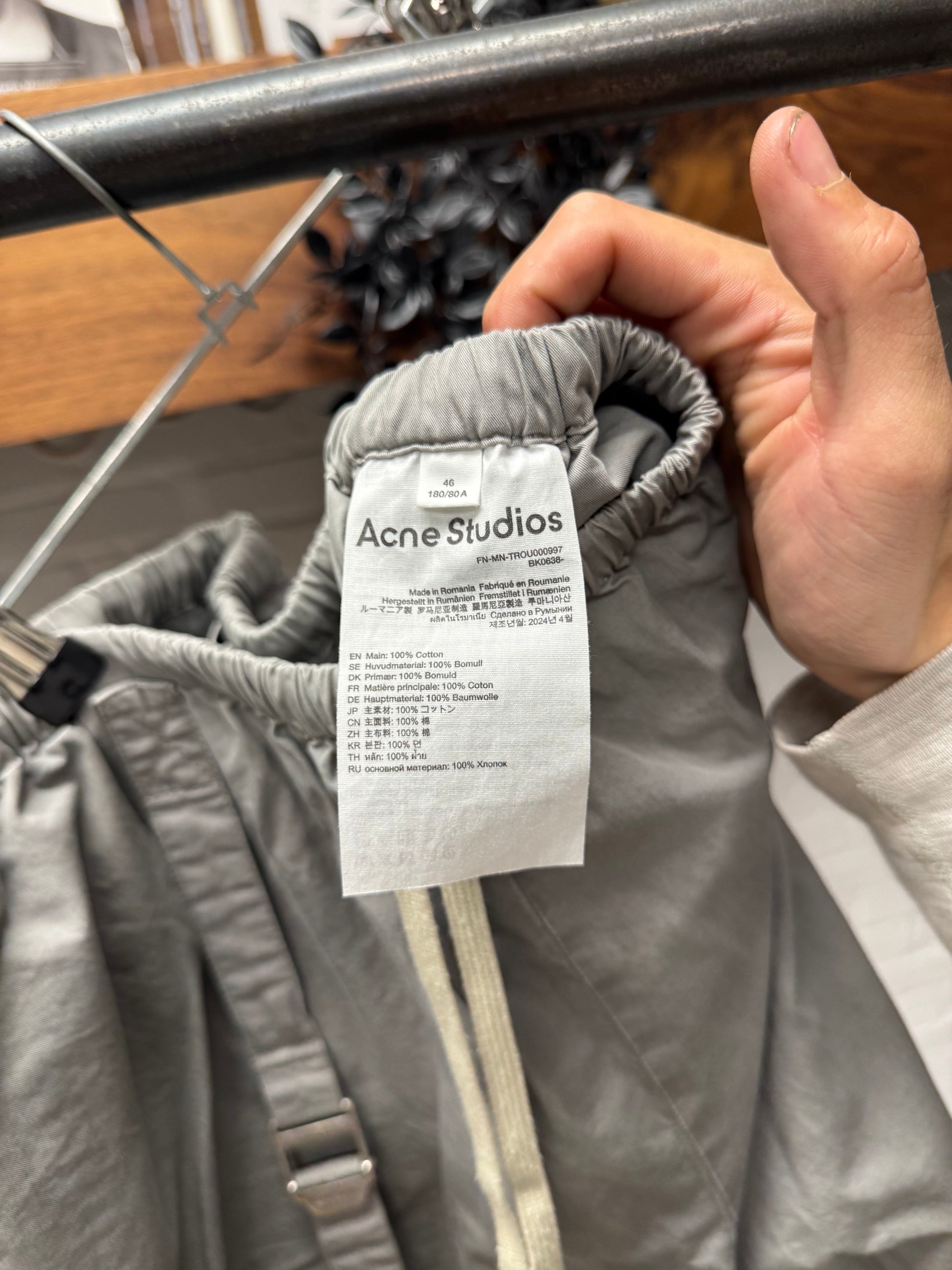 For sale is a pair of Acne Studios ‘Bondage Strap’ Grey Wide Leg Cargo Pants