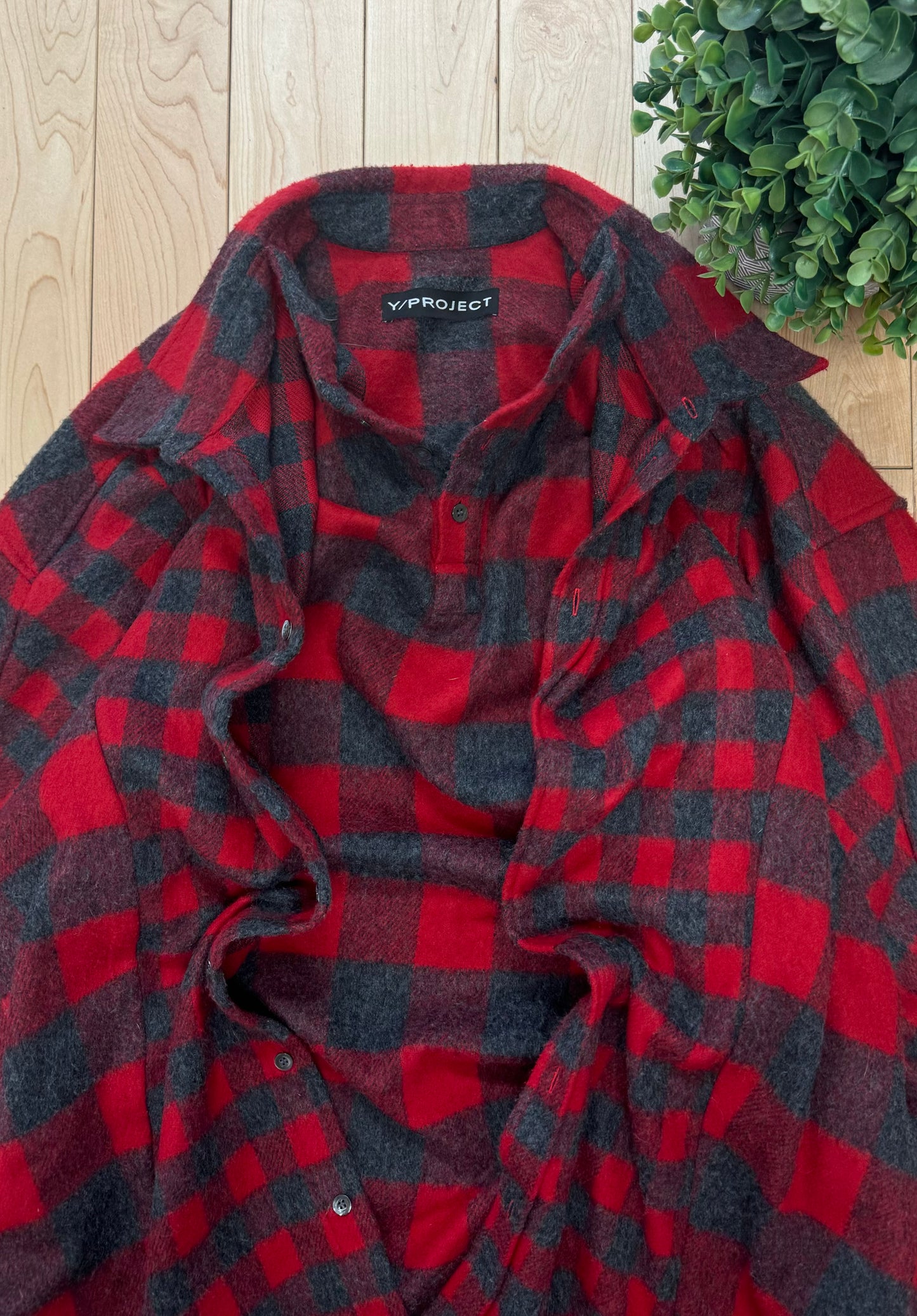 For sale is an Autumn Winter 2018 Y Project Double Layered Plaid Flannel. Capable of being worn as either a pullover or as a flannel with the mandarin collar tucked behind, this shirt has an oversized fit best suited for a size extra large. In great overall condition with no flaws.