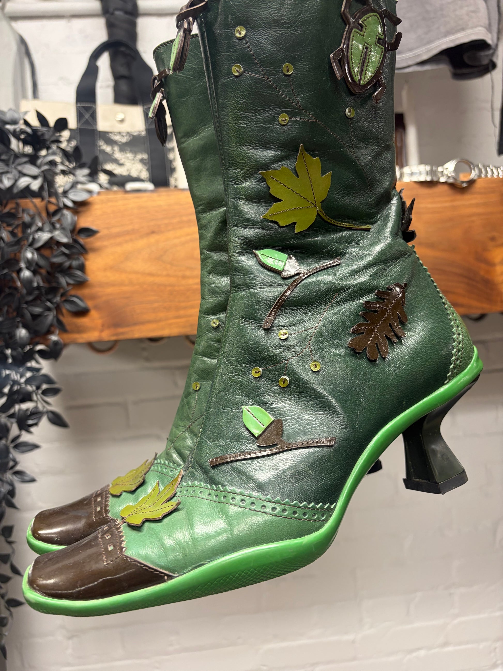 For sale is a pair of AW1999 Prada Green Calfskin Leather Leaf Appliqué Ankle Boots