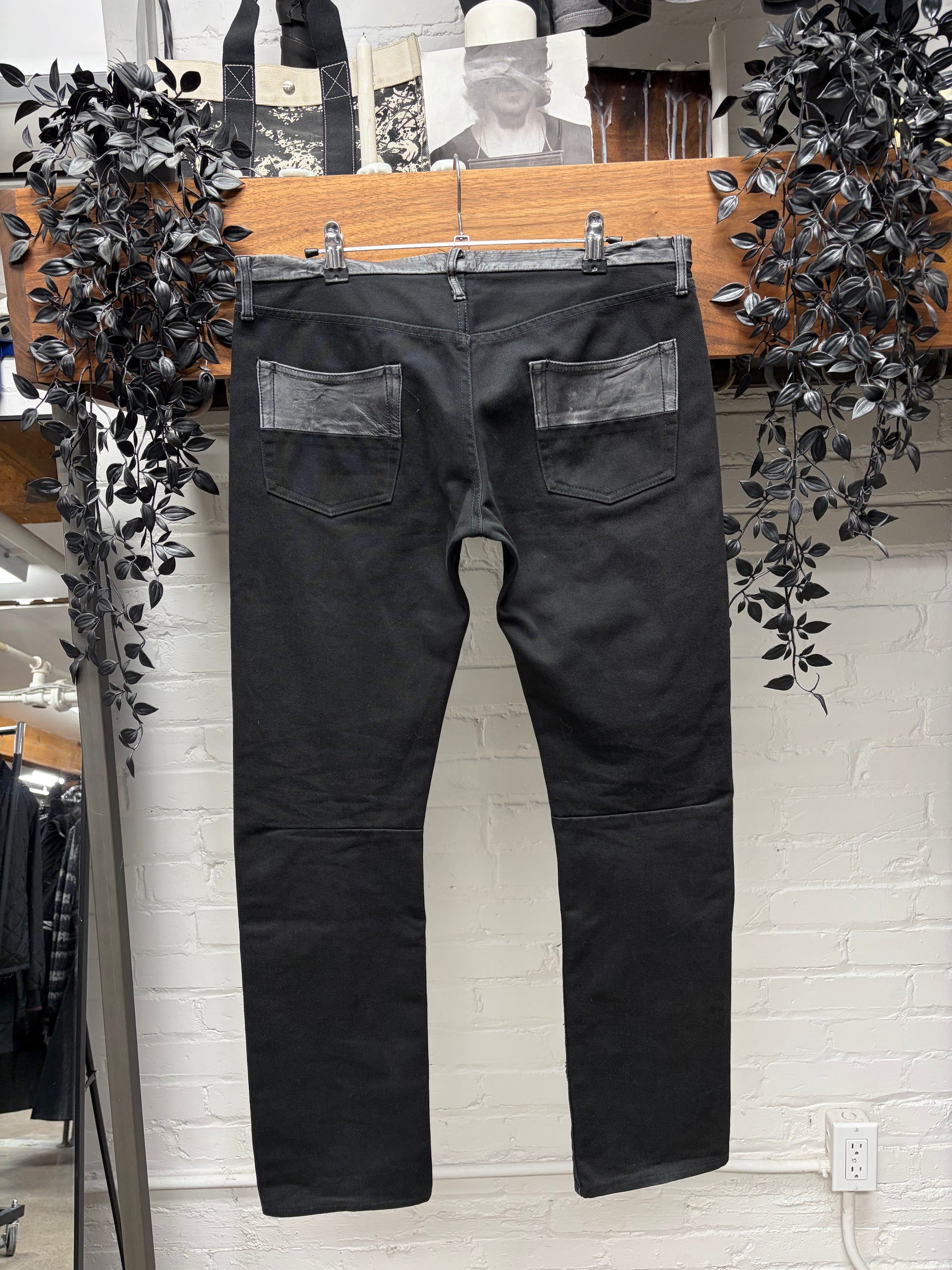 -leather waistband, with matching leather trim on the upper half of the back pockets. Signature Patti Smith bolt emblem on the knee.