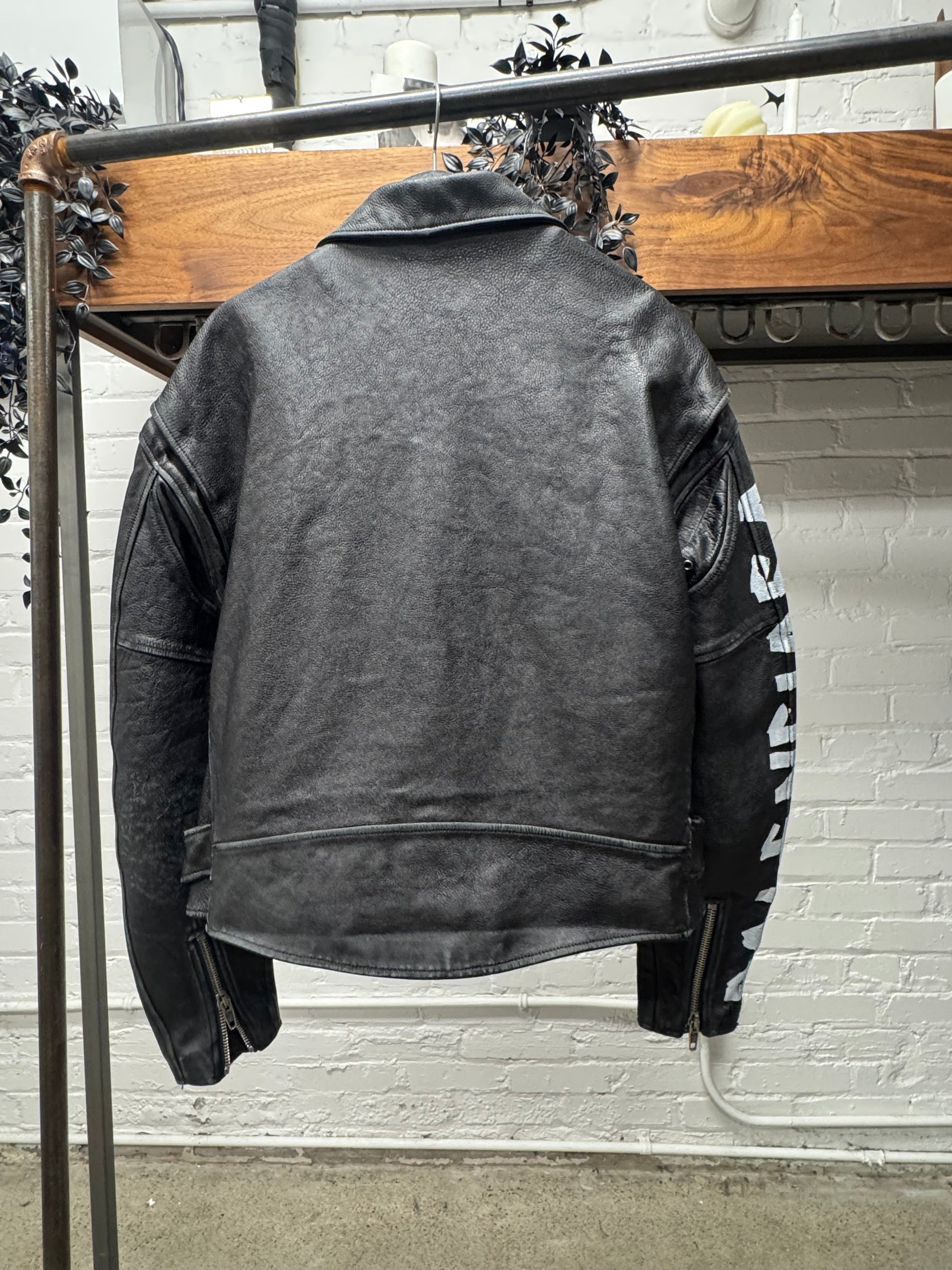 -Demna era leather jacket with intentional distressing on the leather, giving the piece a more worn in appearance. Balenciaga logo spray painted down the side of the arm