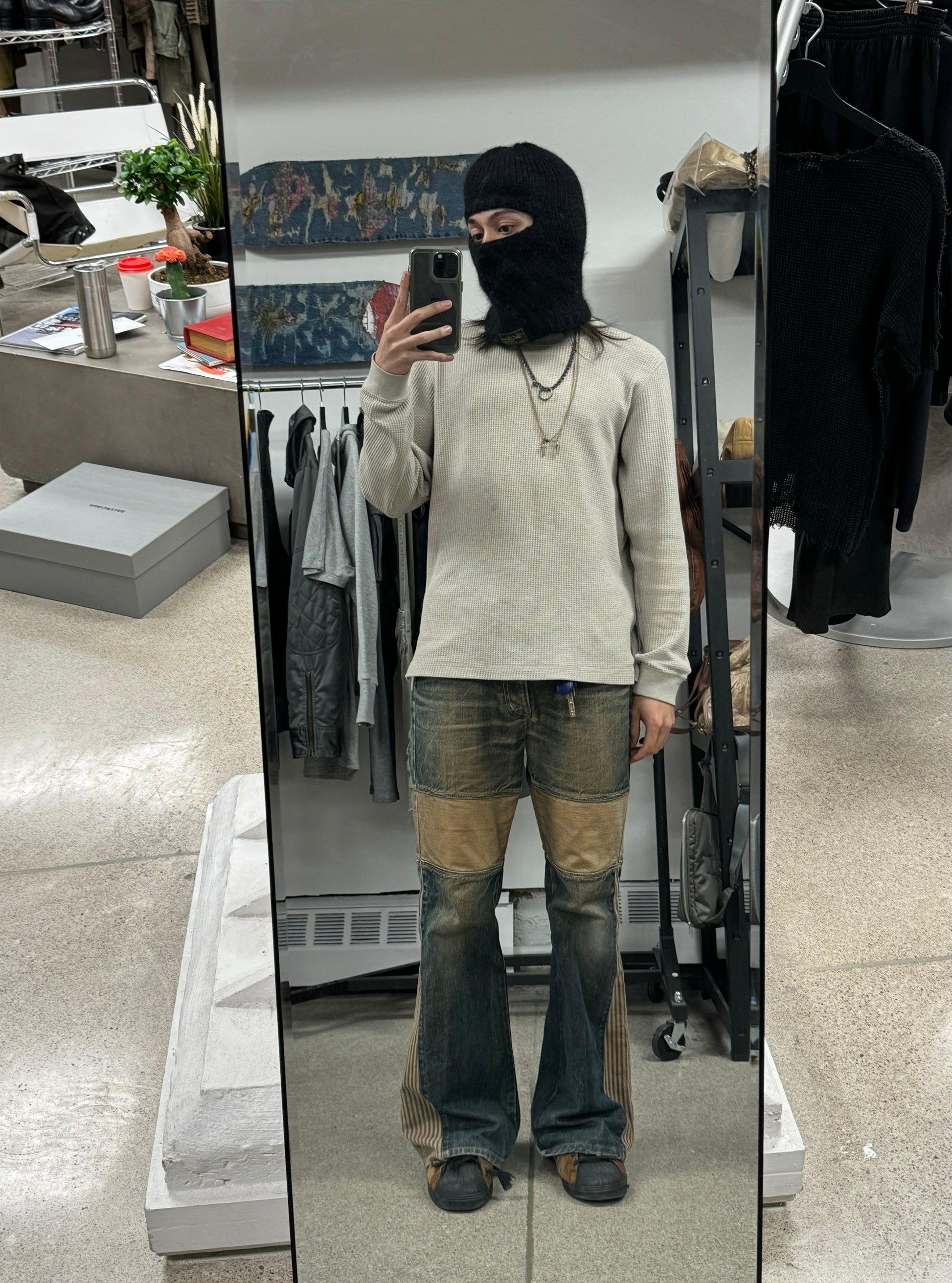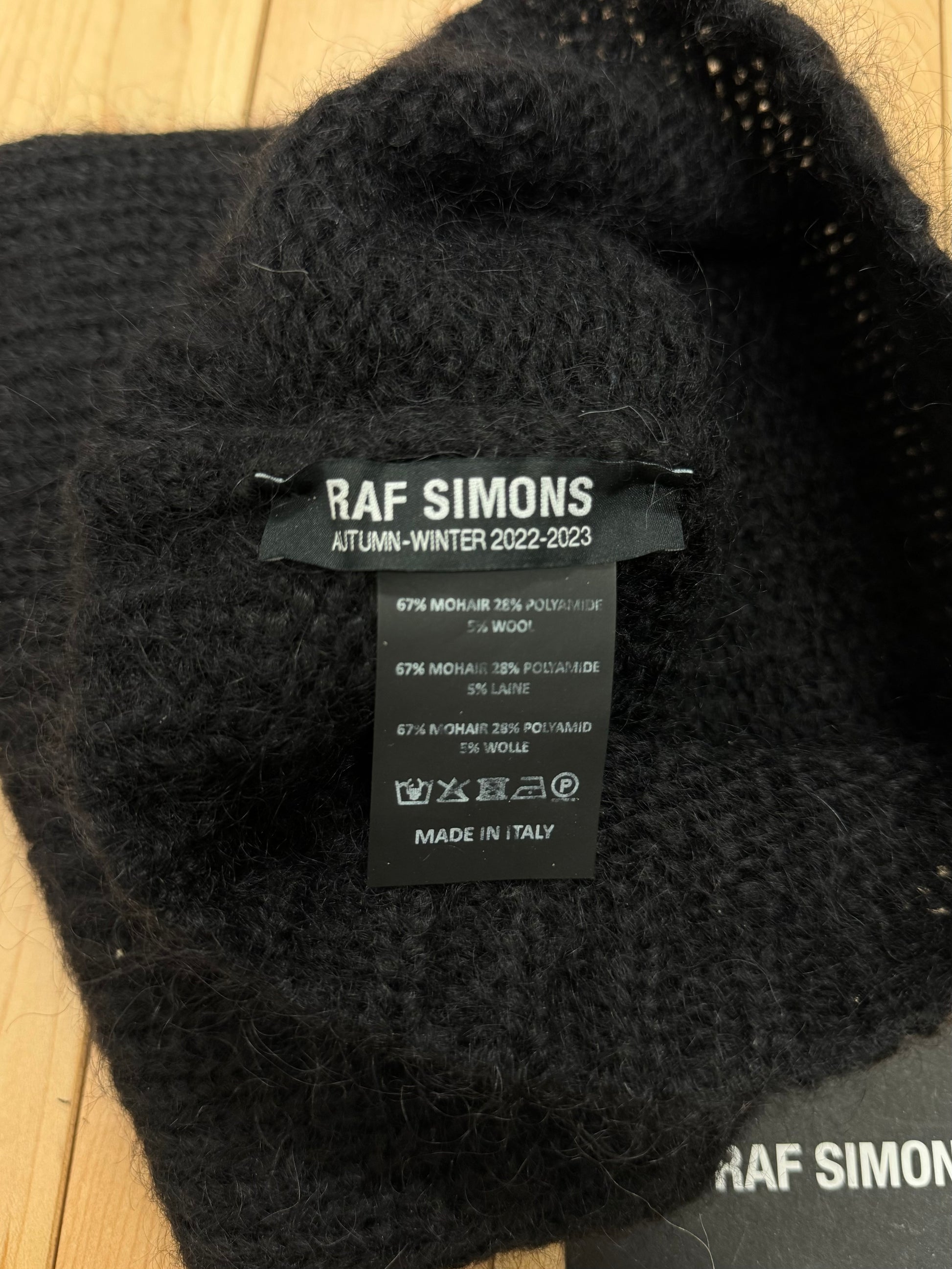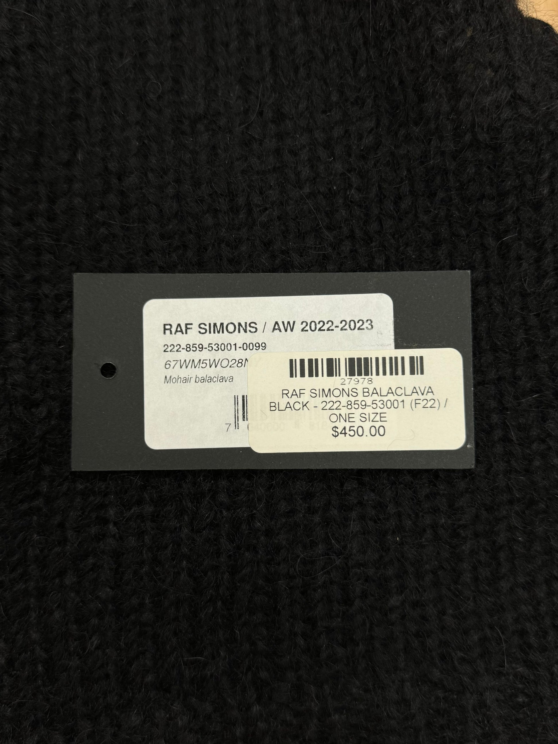 For sale is a timeless Autumn Winter 2022 Raf Simons Black Mohair Balaclava. With a loose gauge knit style, this wool and mohair composition beanie features a Raf Simons ‘Antwerp’ cursive branded patch that sits at the neck when worn. Coming brand new with tags attached, this piece can be flipped upwards to create a beanie as well. Retail price $450.00 USD, grab it here for a steal.