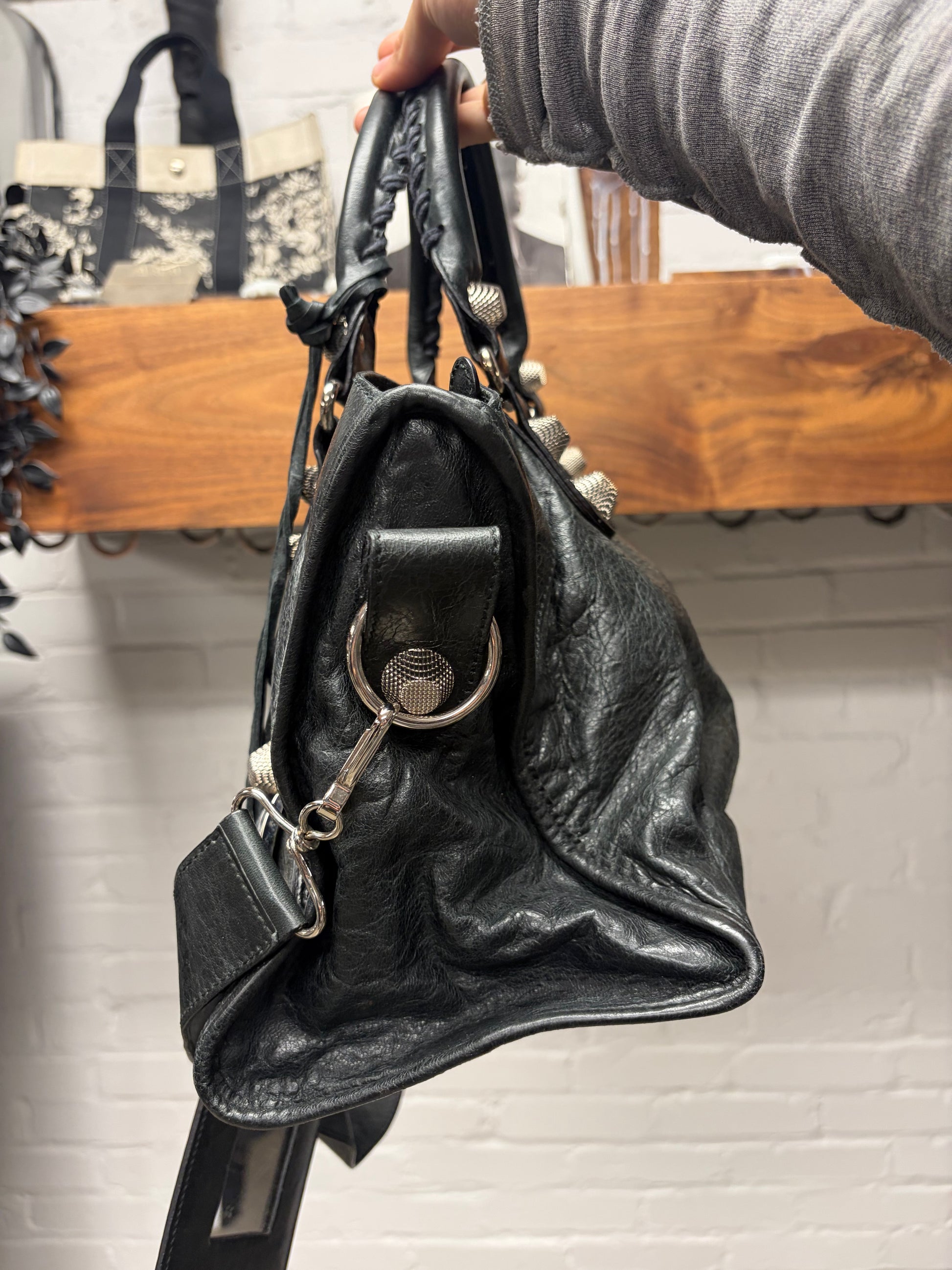 Balenciaga Black Leather ‘Giant City Bag’ with Silver Hardware and Crossbody Strap