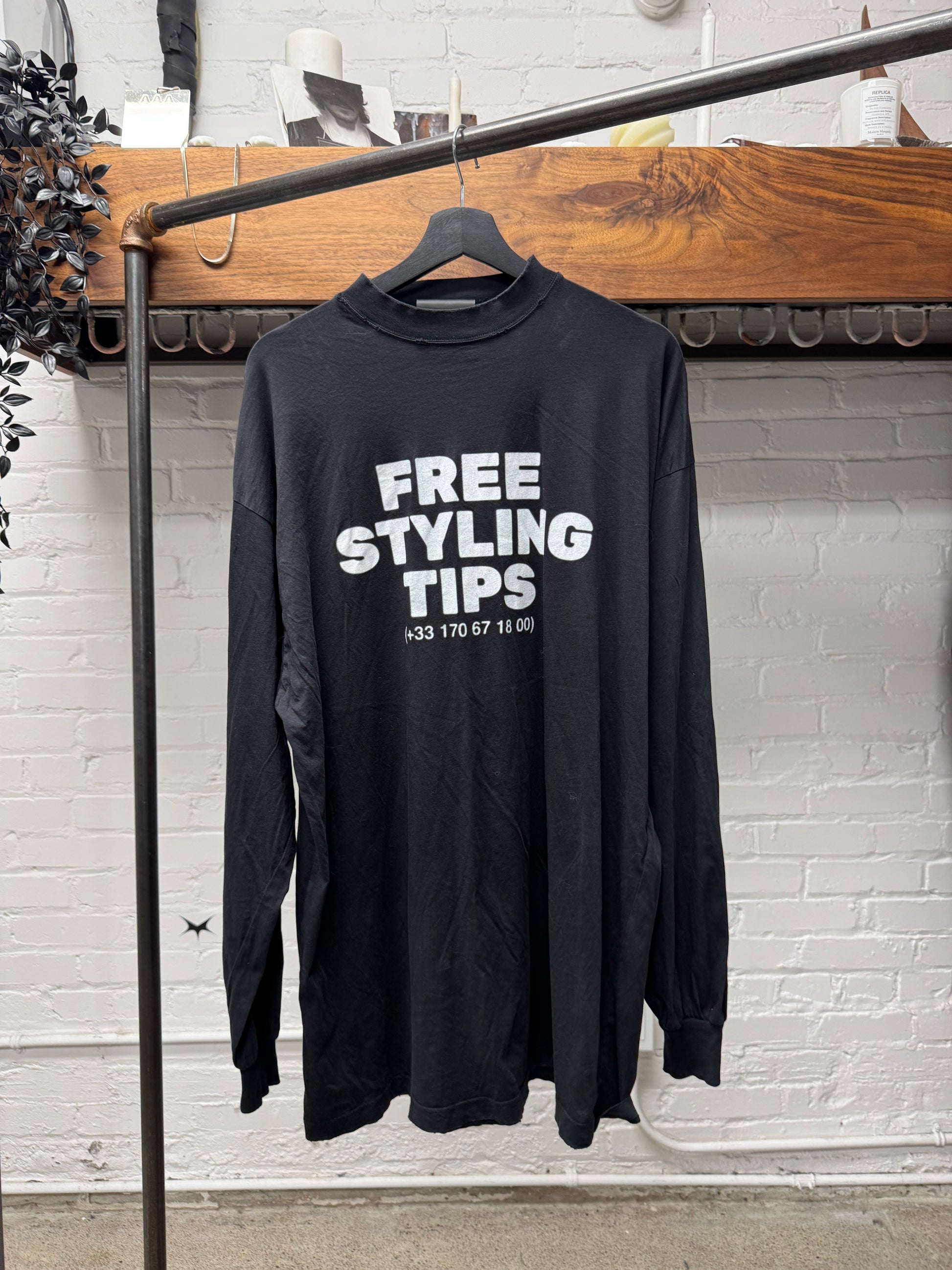 For sale is a SS2023 Balenciaga ‘Free Styling Tips’ Distressed Black Long Sleeve Shirt