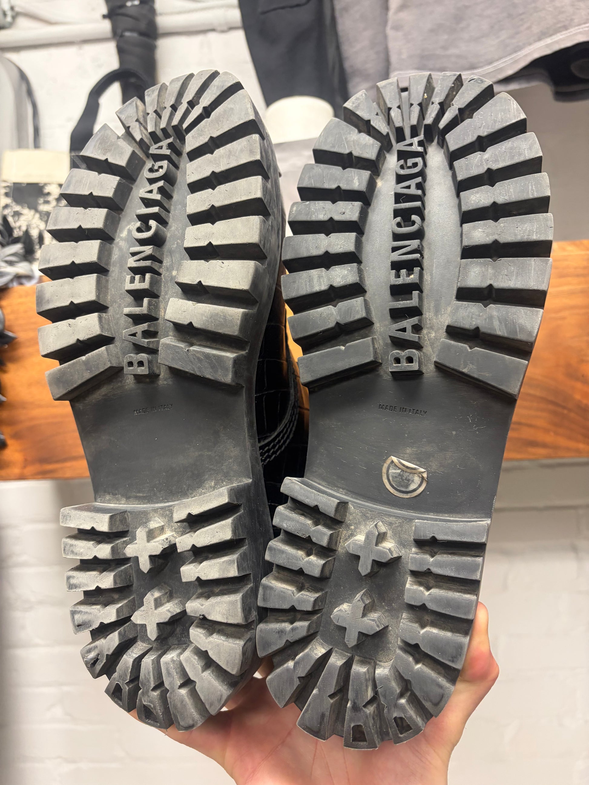 For sale is a Balenciaga Croc Embossed ‘Strike’ Black Patent Leather Combat Boots