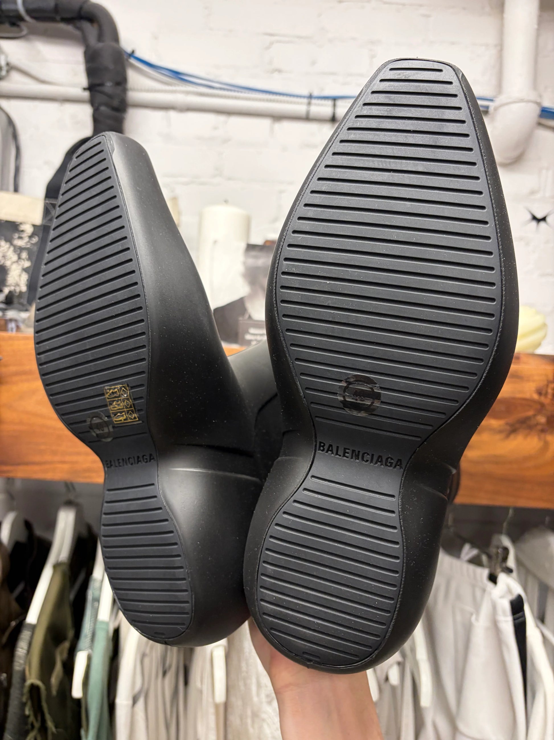 For sale is a pair of Balenciaga ‘Excavator’ Pointed Toe Black Rubber Boots