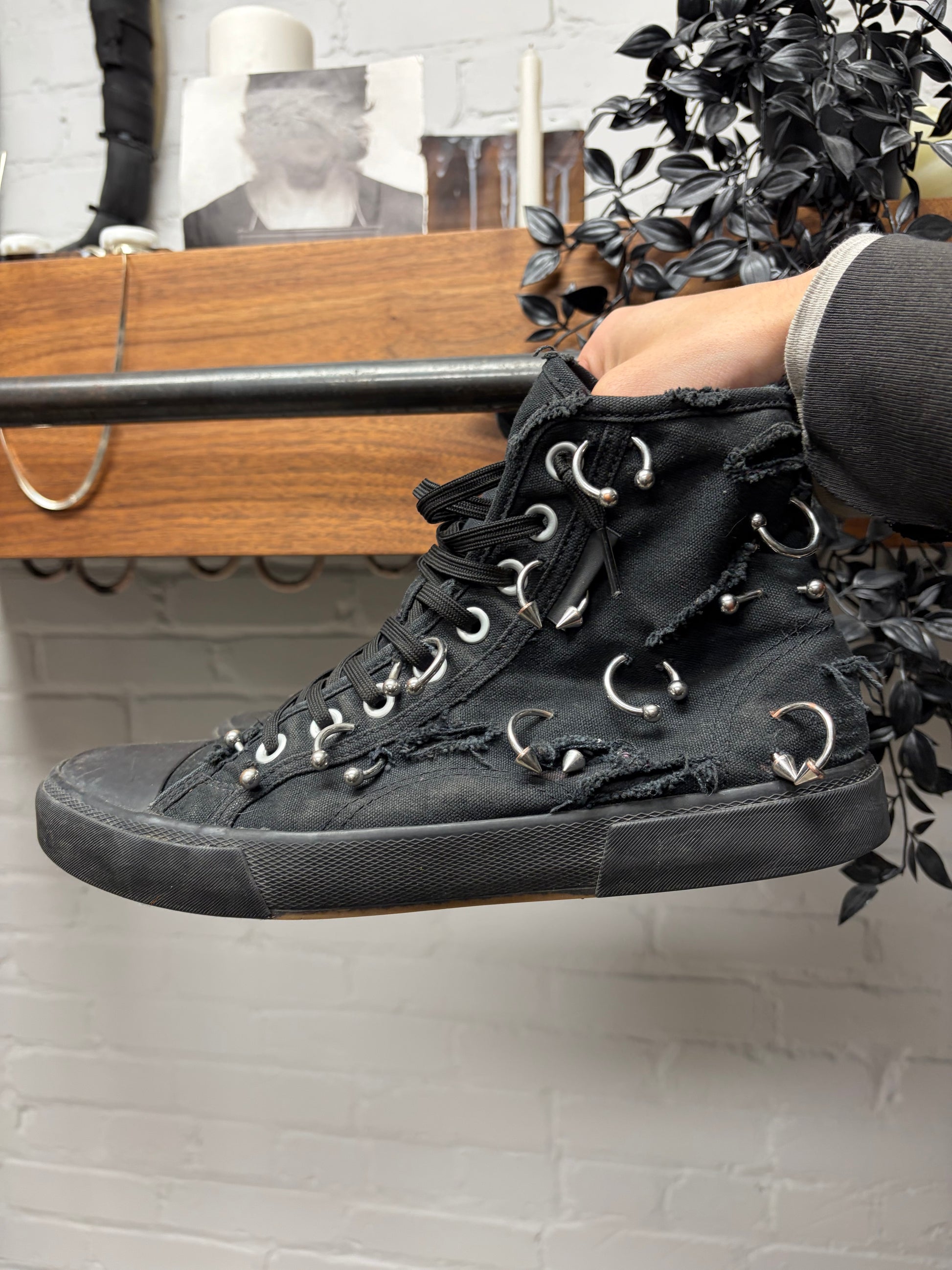 For sale is a pair of Balenciaga ‘Piercing’ Paris Black Canvas High Top Sneakers