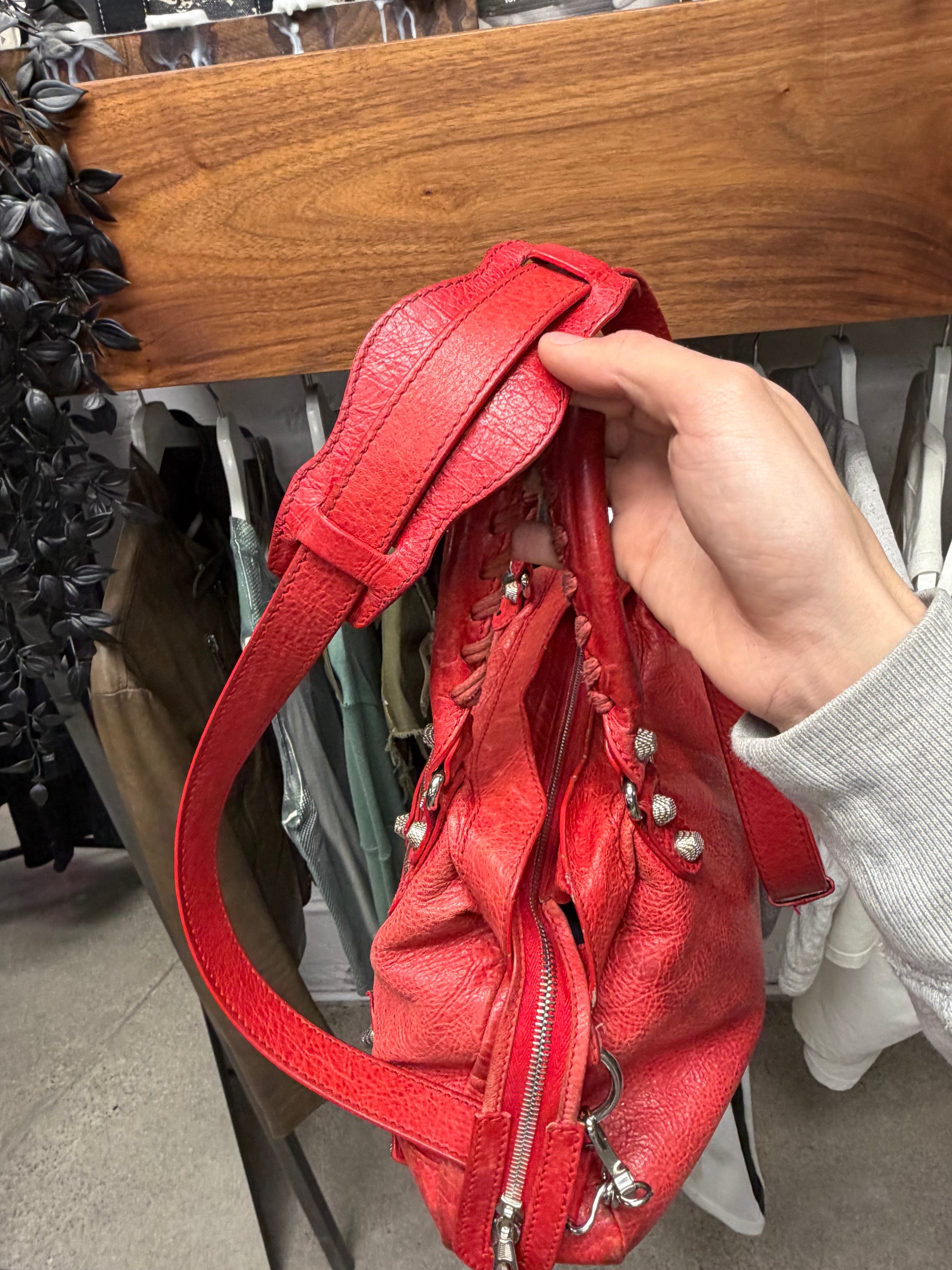 Balenciaga ‘Town’ Red Leather Bag with Silver Toned Hardware and Crossbody Strap