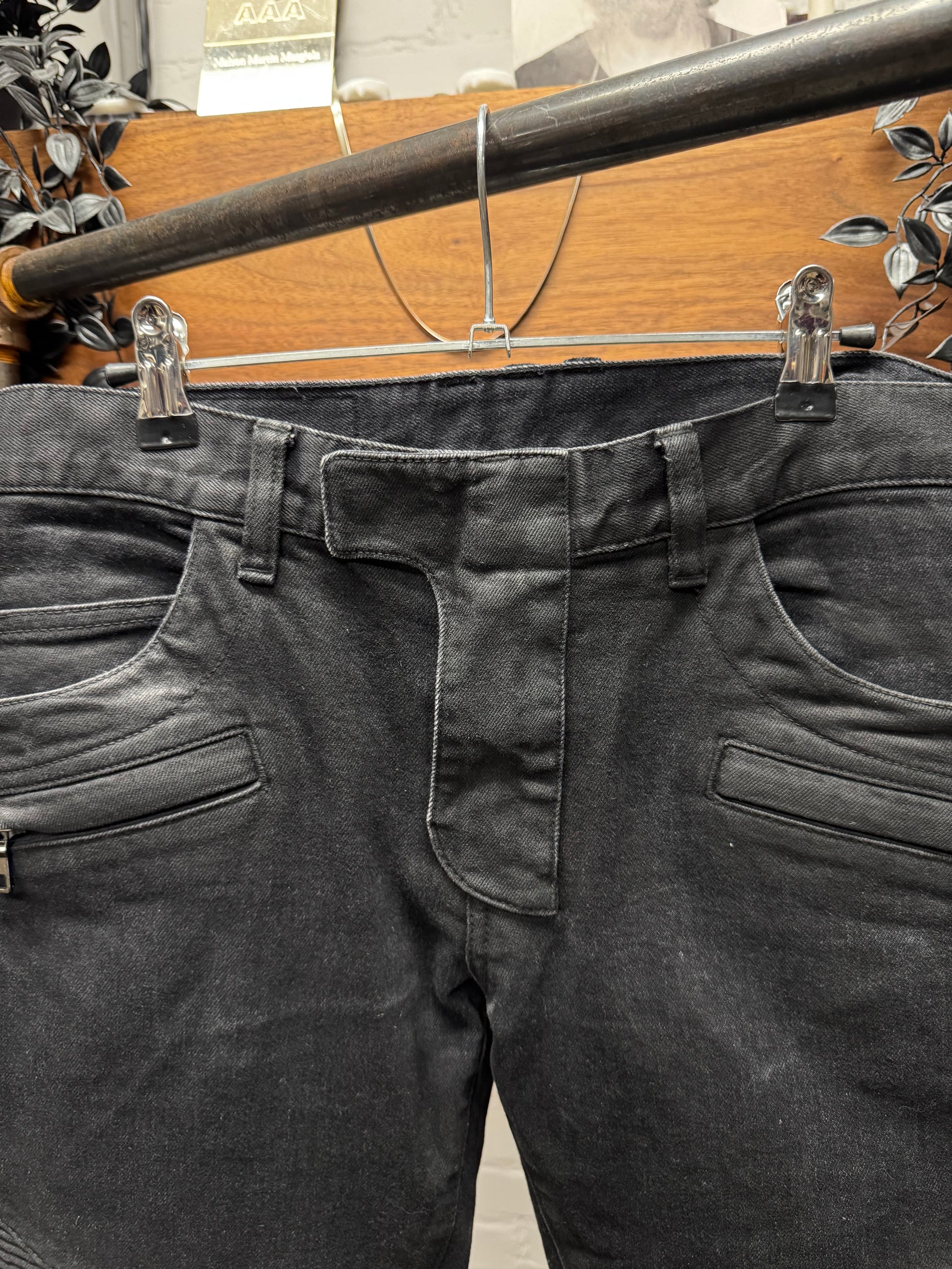 -classic and best variant. Waxed black classic Balmain biker denim with pleated biker knee inserts.
