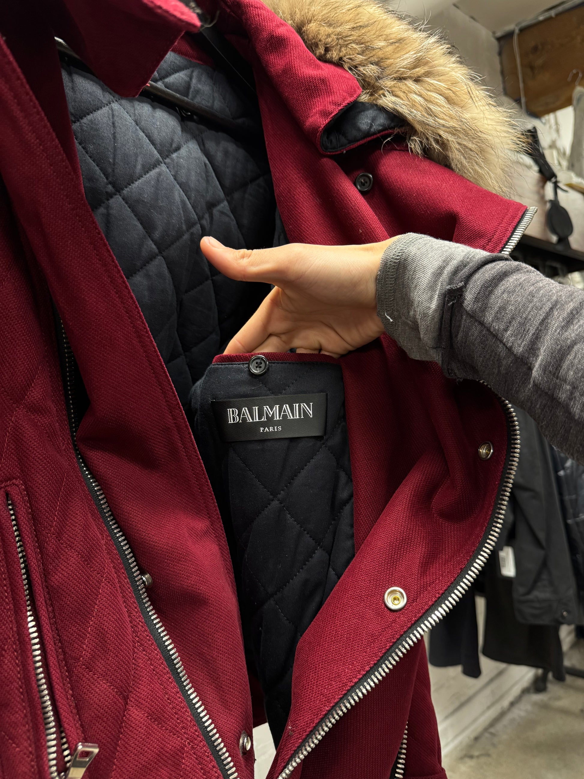 -insane grail from early Rousteig era at Balmain. Lot of celebrity flicks of your favorites wearing both this colorway and the navy blue too. Full raccoon fur hood in an excessively oversized and flamboyant manner. Quilted liner for winter ready insulation. No shortage of attention to detail and quality.