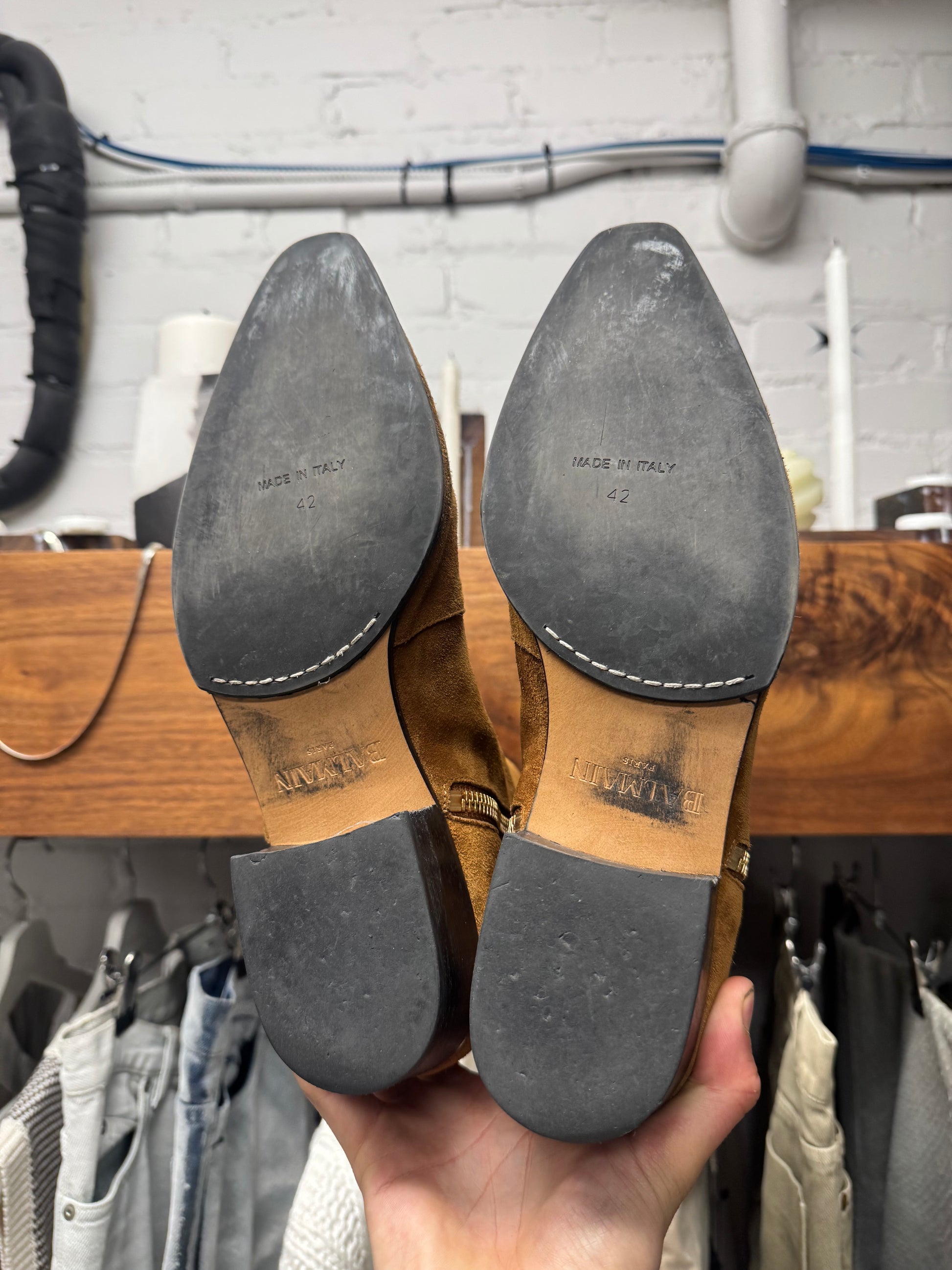 For sale is a pair of Balmain ‘Anthos’ Suede Double Side Zip Brown Pointed Toe Boots