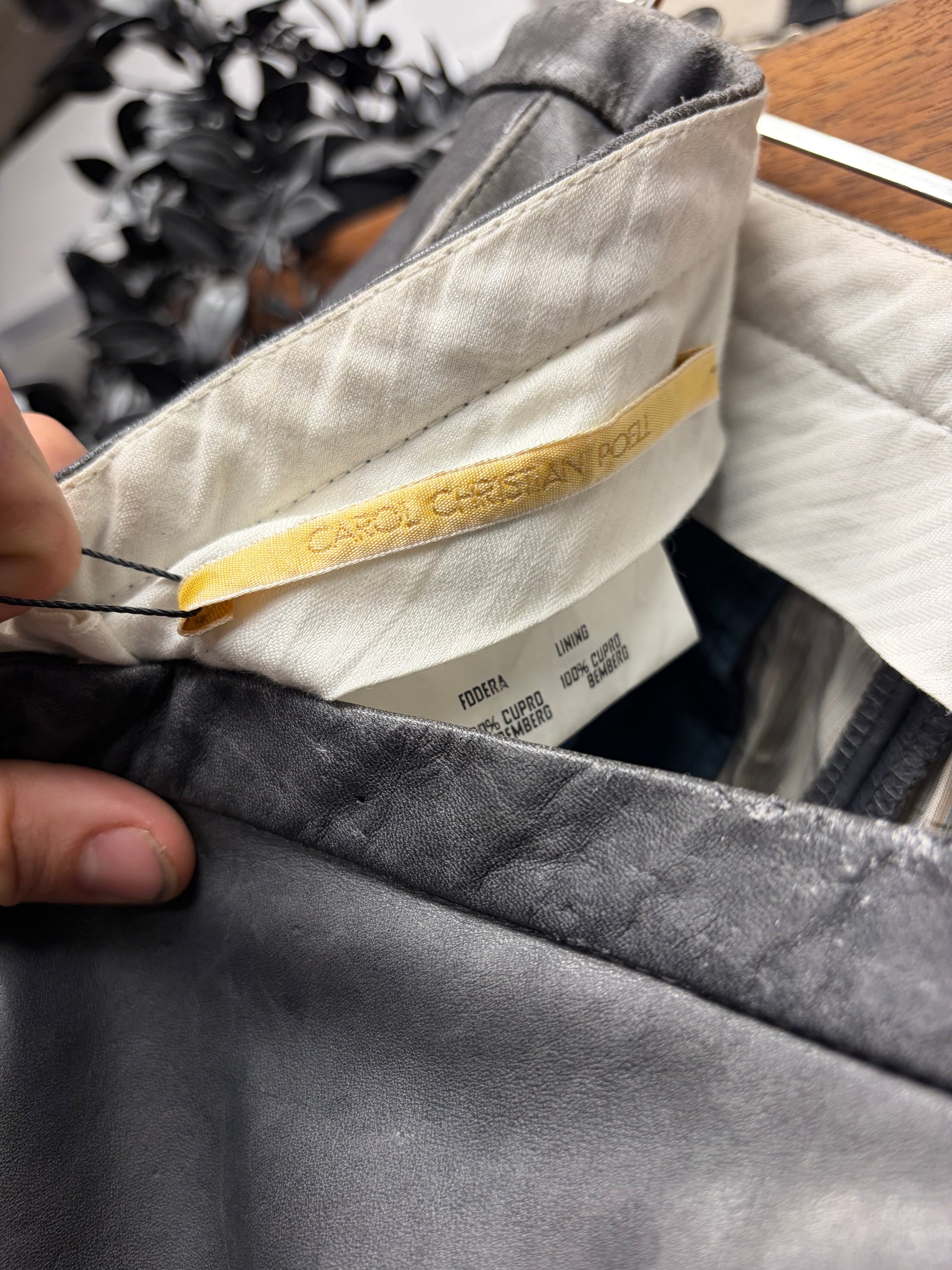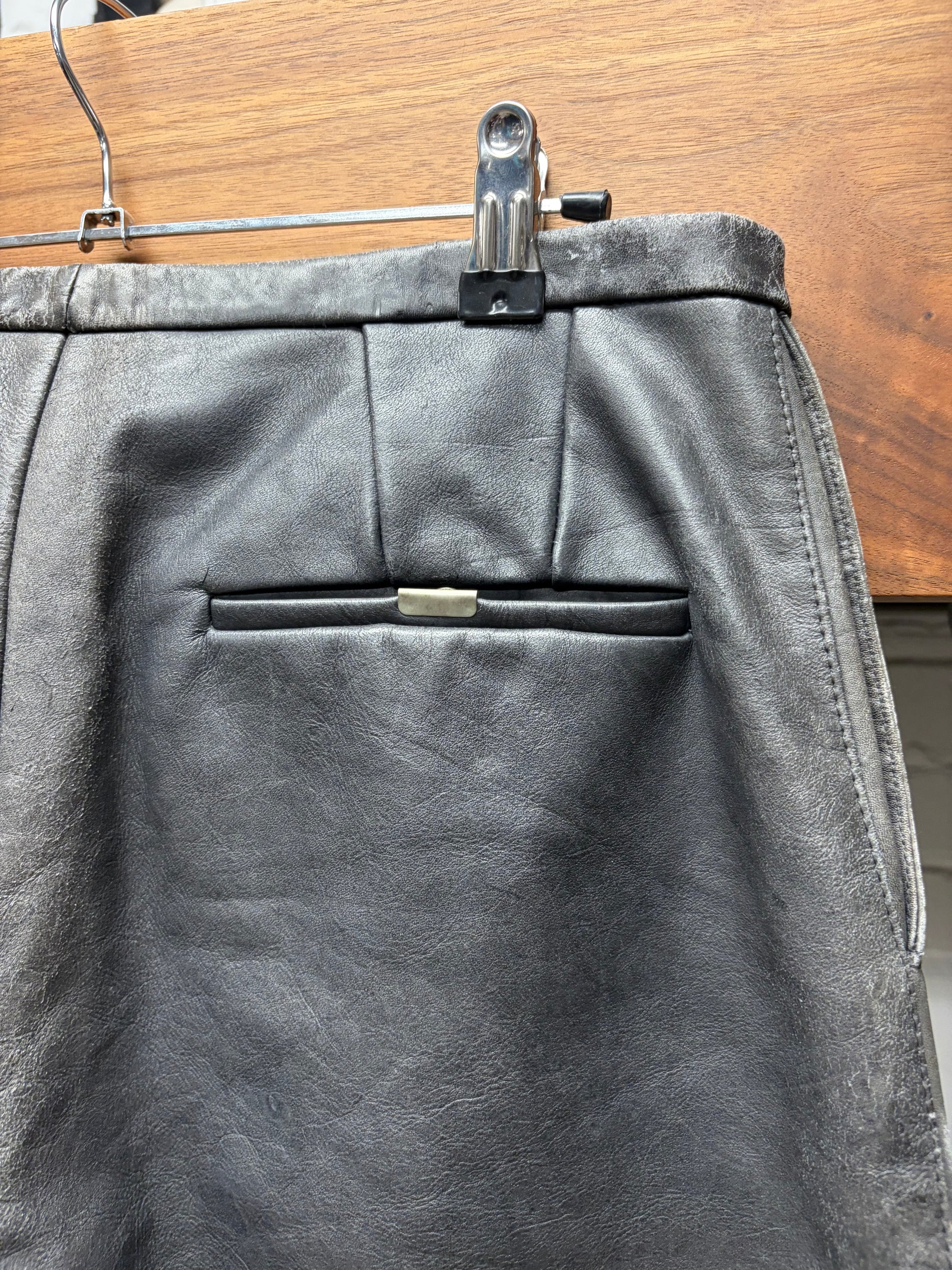 -straight cut grey leather trousers with silver tone hardware detailing. Beautiful aged look to the leather with a natural patina formed from over 20 years of wear.