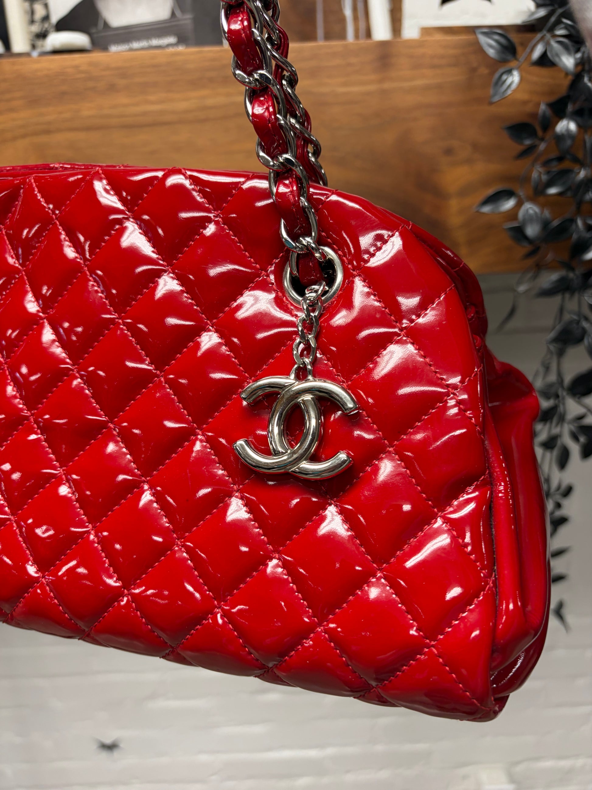 -glossy red quilted patent leather paired with silver tone CC interlock logo charm on chain.