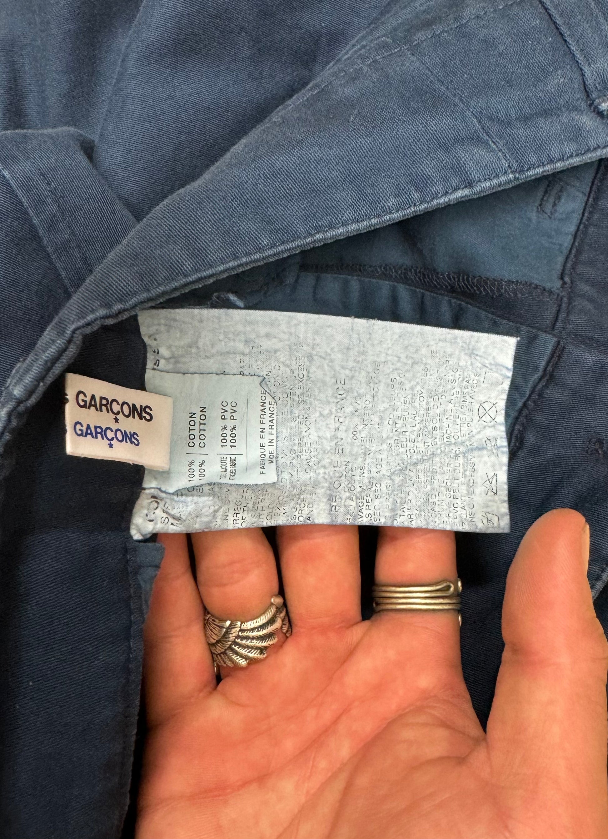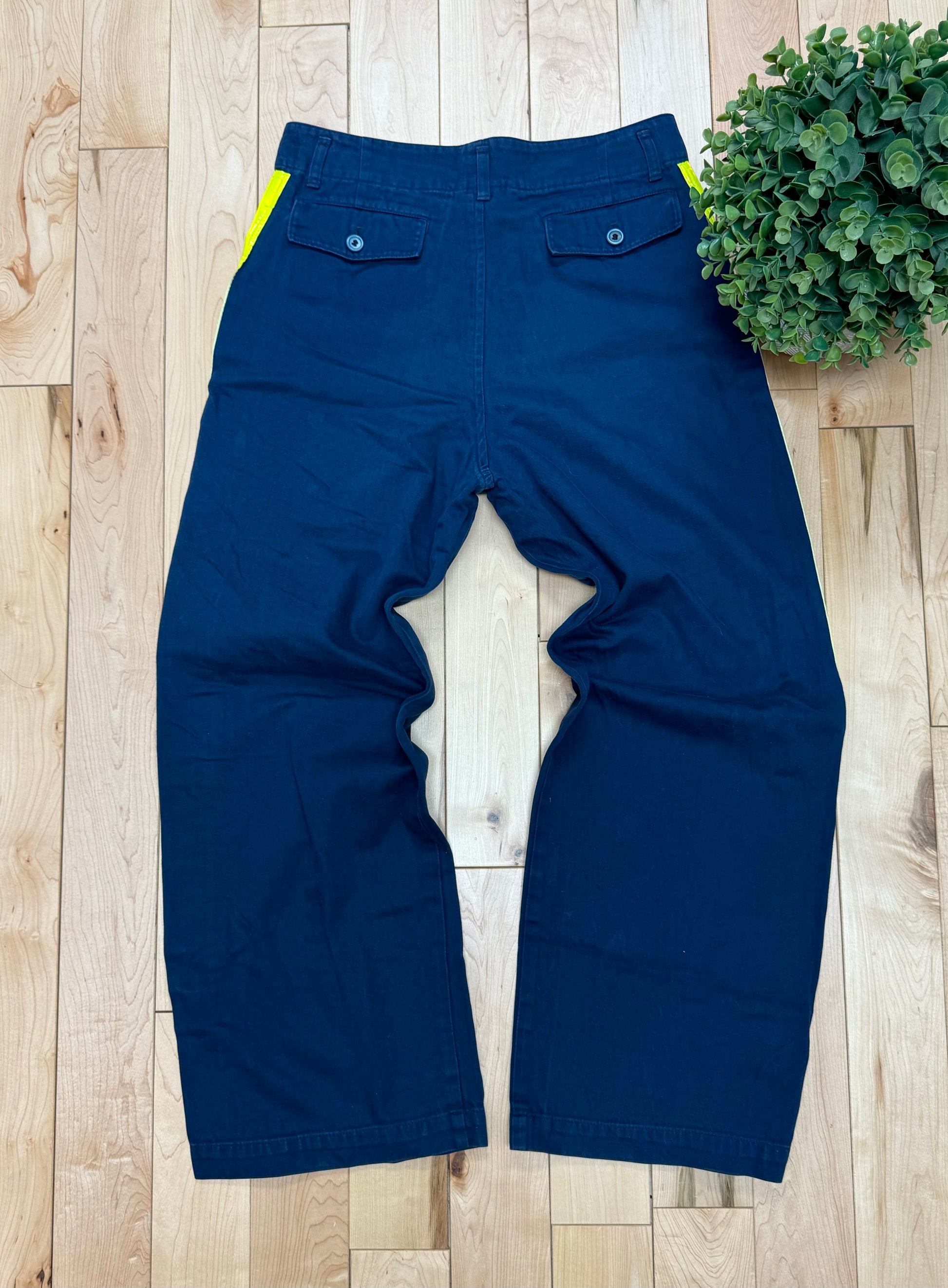 For sale is a sick pair of Comme Des Garçons ‘High Vis’ Wide Leg Work Pants. Coming in a navy blue; these trousers feature high visibility strips running down the side of the leg on both sides. Here is the opportunity to purchase a sweet pair of Comme Des Garçons work pants for an outstanding price.