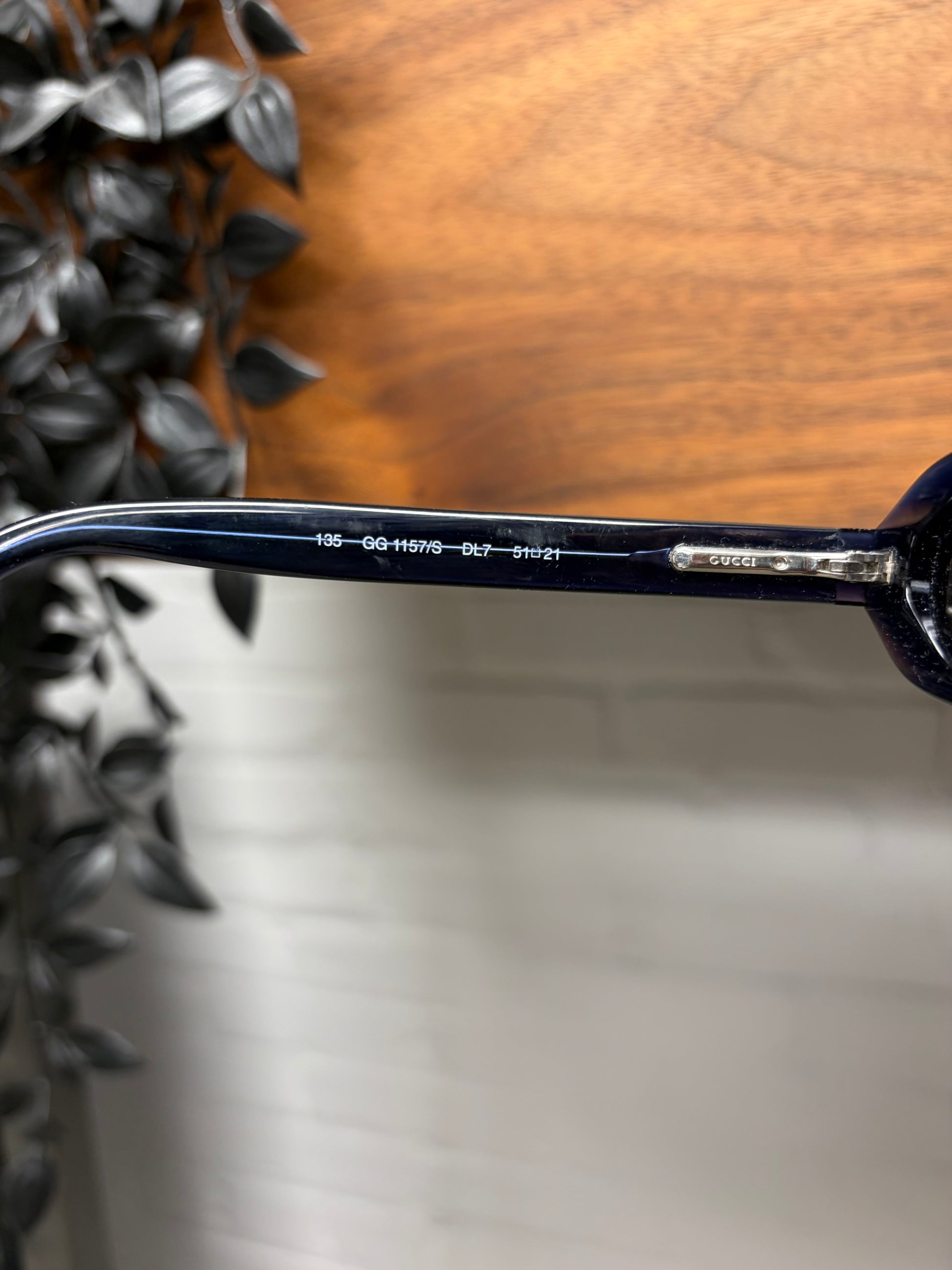 -iconic shape used by Gucci through the 90s called the ‘Moda’ sunglasses. Done in a deep blue finish with black tinted lenses.
