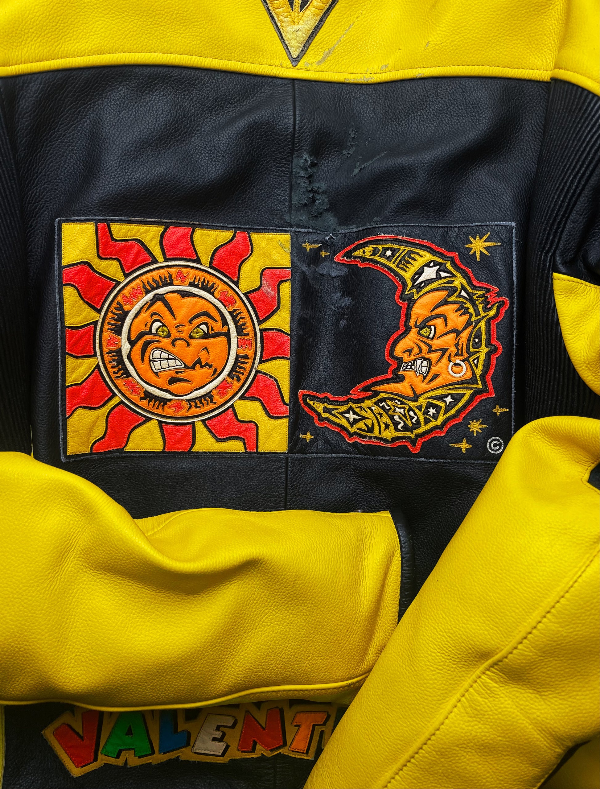 A customized pro model for Italian motorcyclist Valentino Rossi, this jacket was produced in extremely limited quantities for the nine time Grand Prix world champion. With signature number 46 across the front, the jacket features Dainese leather branding on the hips and sleeves. With a sun and moon back graphic, the piece has inevitably been scuffed by wear and real use on a bike. Coming in a size large, here is the opportunity to purchase an incredible piece from Dainese Leather’s high end protective motorcycle gear company.