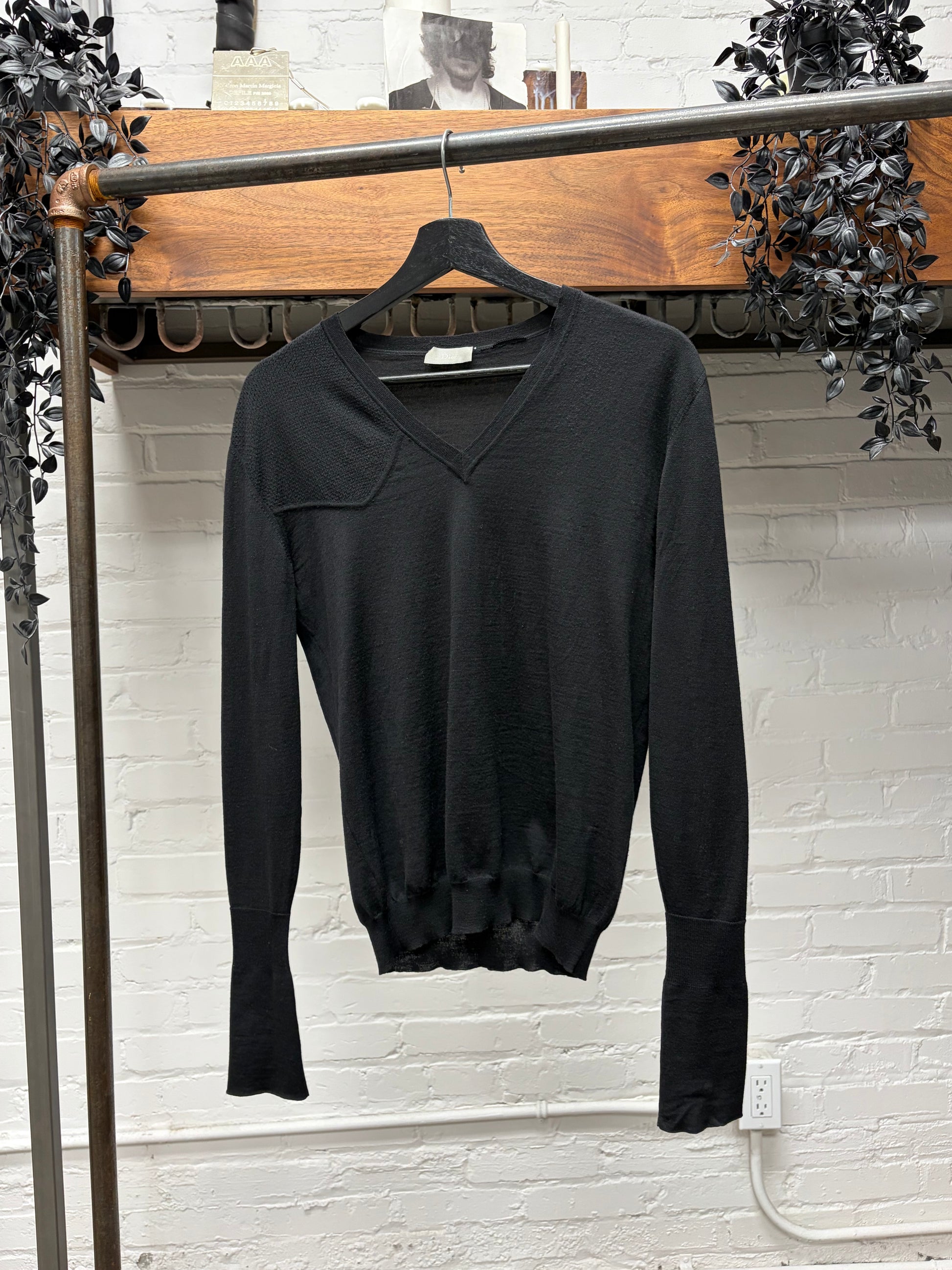 -prime era Hedi Slimane at Dior Homme, gorgeous perforated jersey style panel on the shoulder, giving the sweater some variety in textural differences.