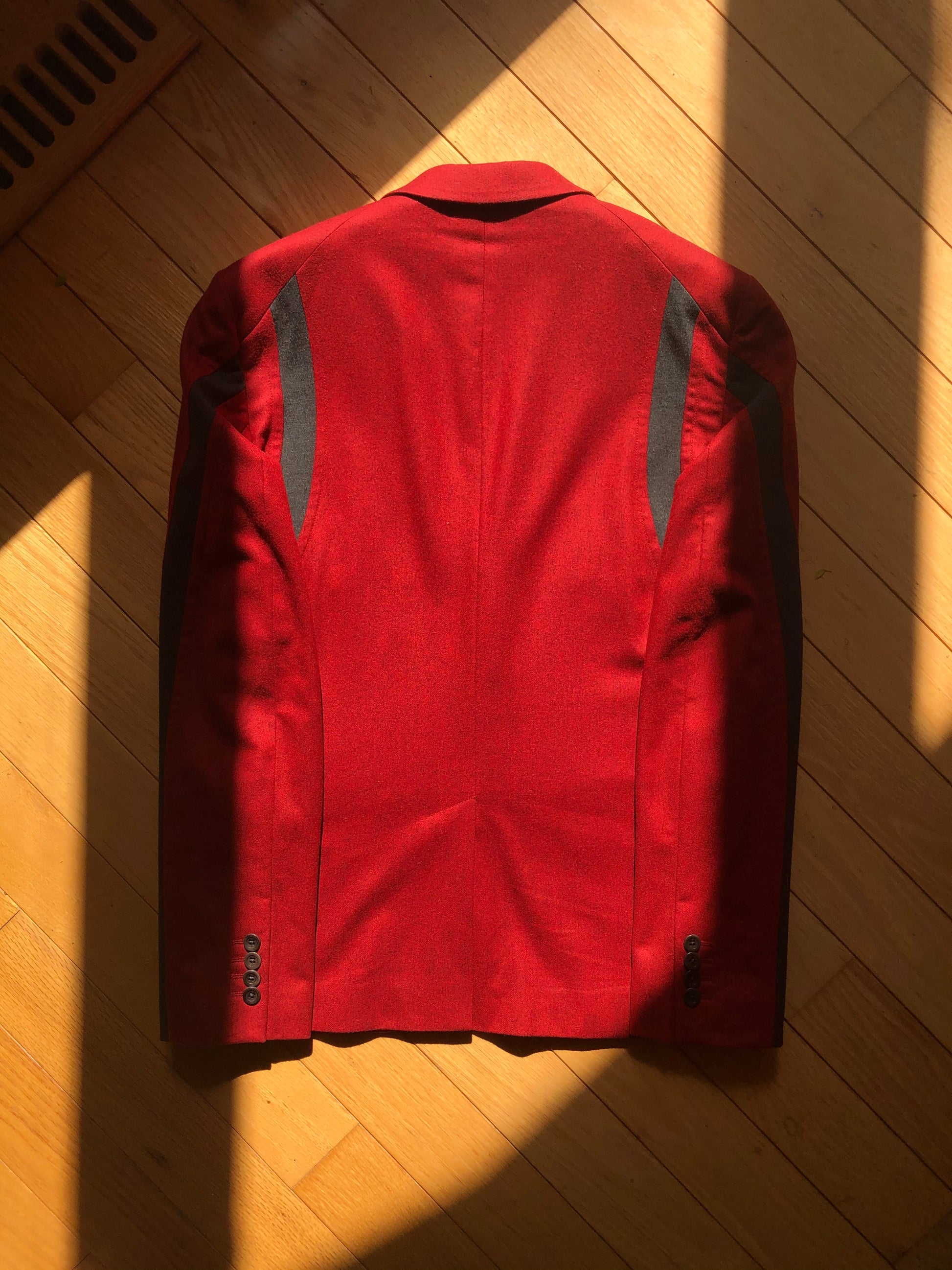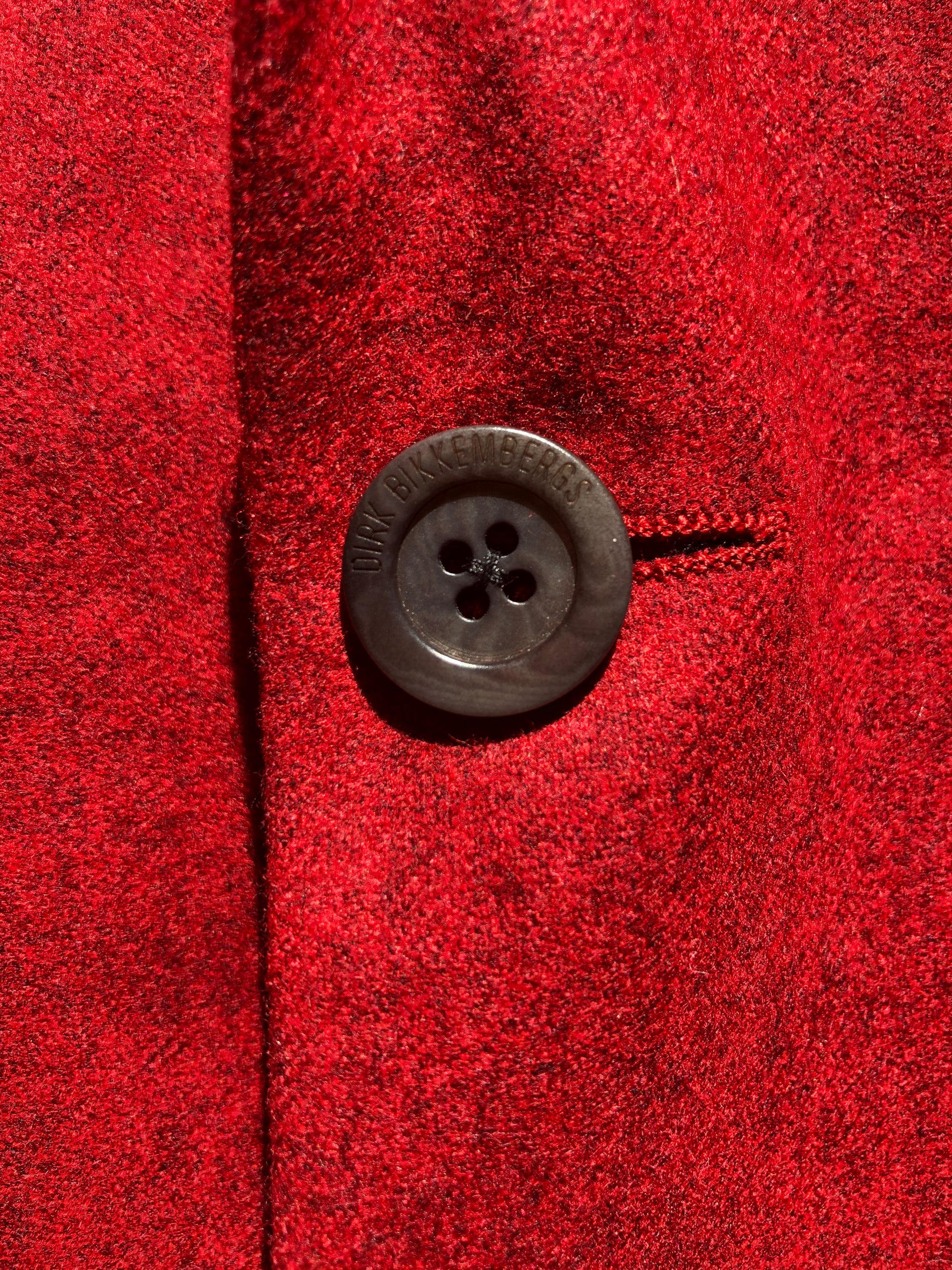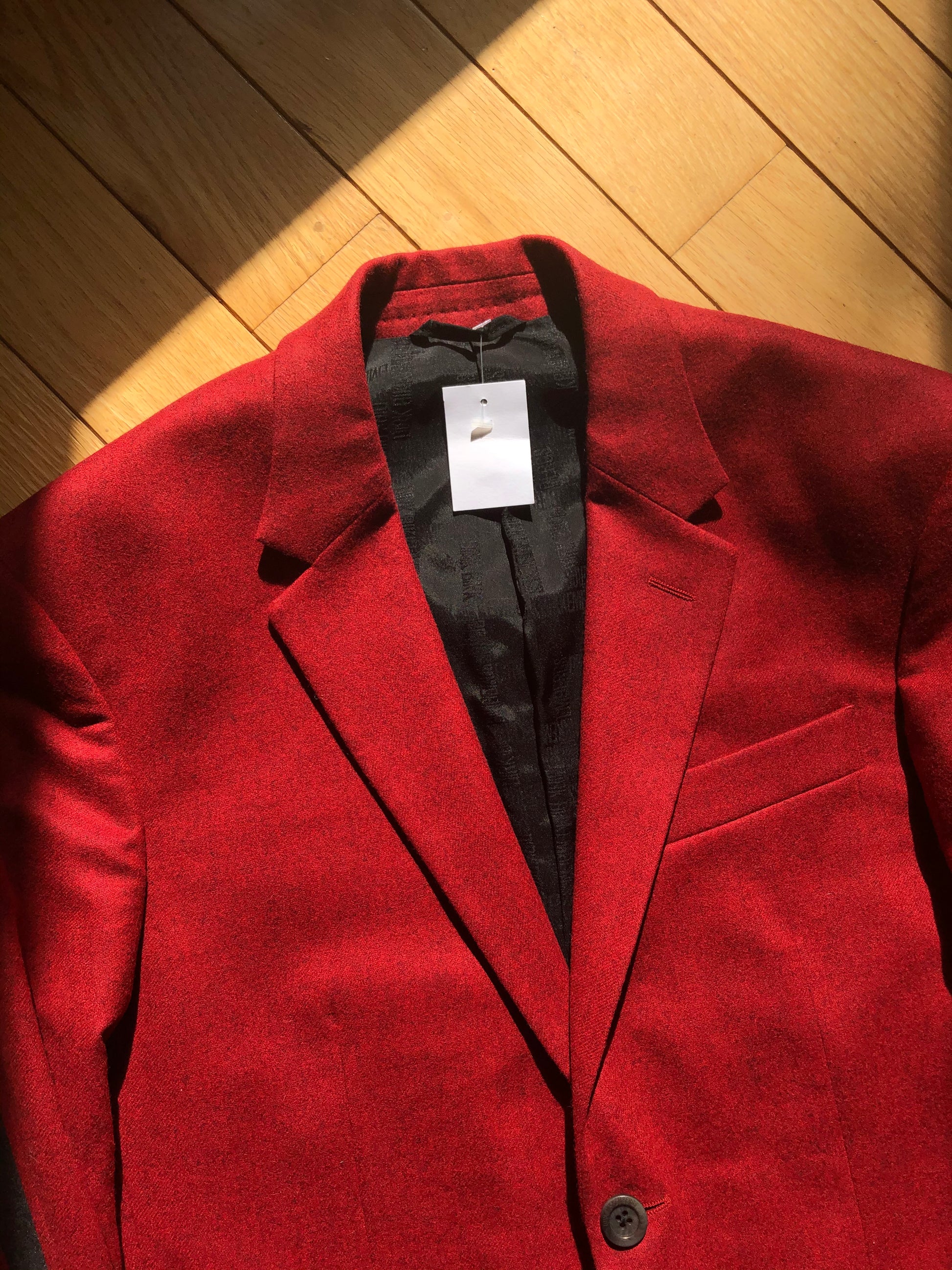 This blazer perfectly exemplifies Bikkembergs’s masterful tailoring, and attention to detail. This blazer comes in a stunning speckled red colour, with amazing charcoal black accents running throughout. With deep plunging lapels, a slanted breast pocket, double flap pockets, and a single vent back, this jacket has a timeless American style cut. This piece is a tagged size 48, and fits like a true to size medium. Retailing at €1157.00, this jacket is brand new with tags and is in perfect overall condition with no flaws whatsoever. Here is the chance to purchase a beautiful Dirk Bikkembergs pure wool blazer for a fantastic price.