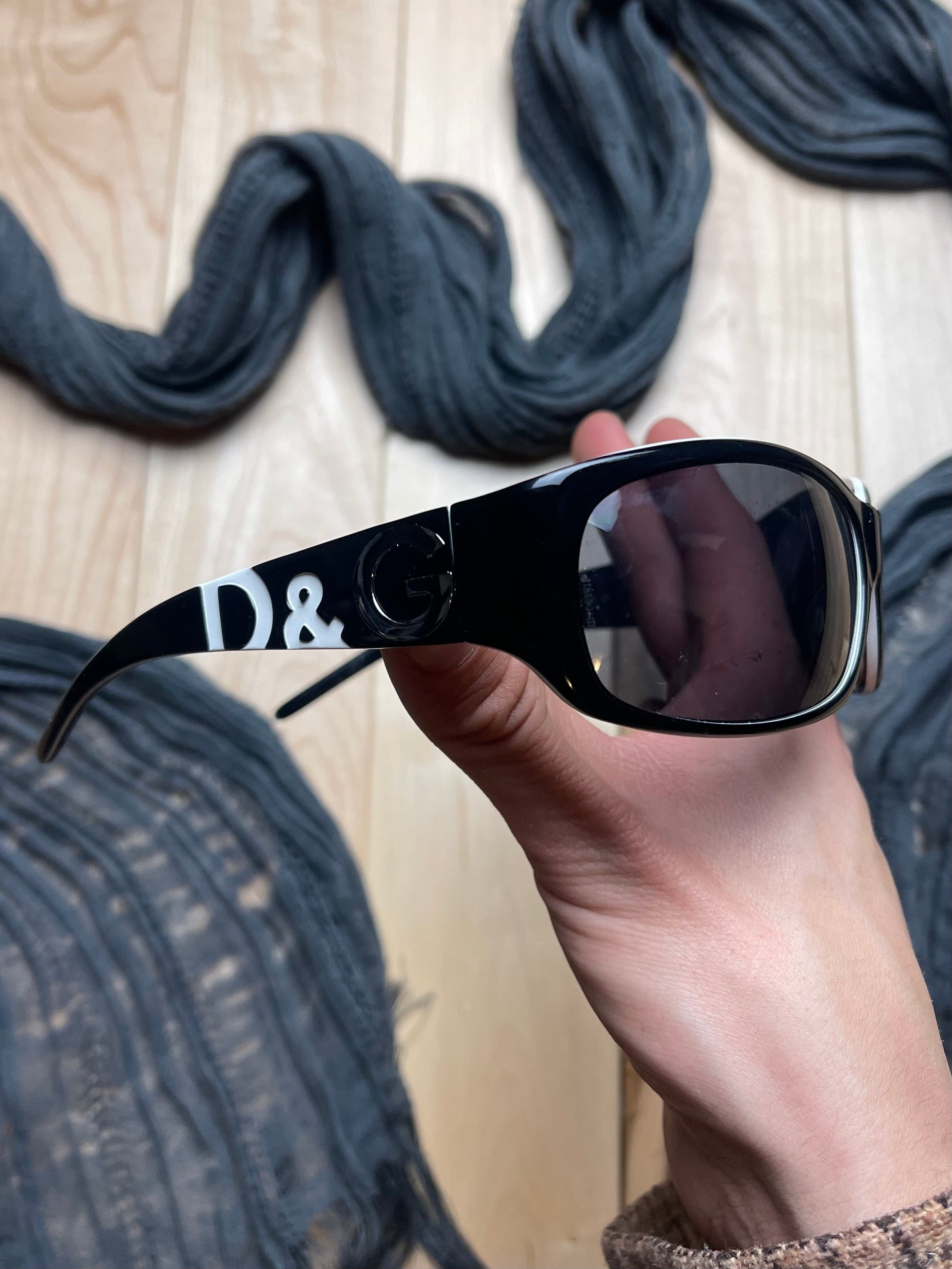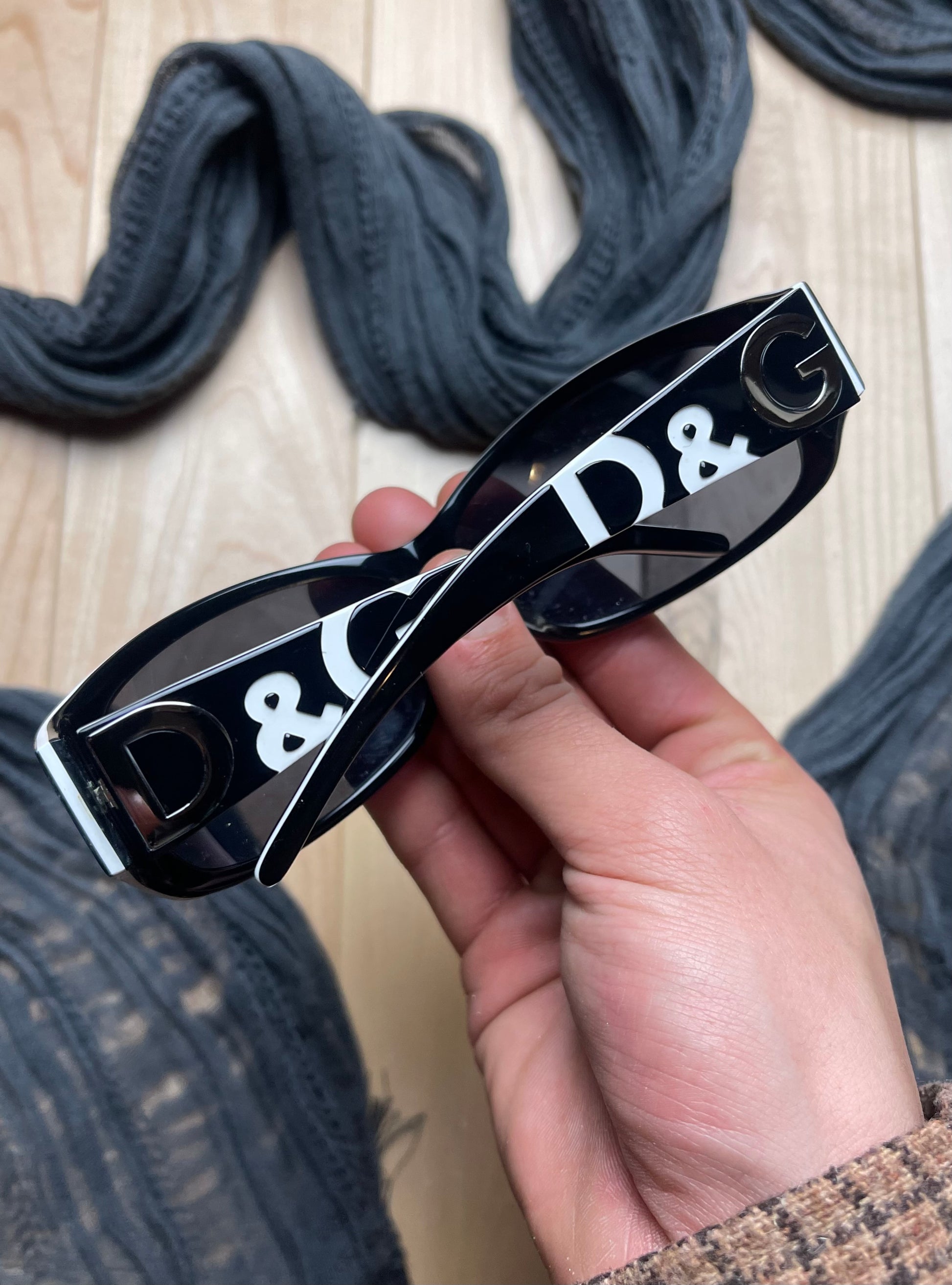 For sale is a 2000s pair of Dolce & Gabbana purple tinted D&G logo sunglasses. Featuring massive D&G branding down the side of both sleek arms, these sunglasses feature subtle purple tinted lenses. In great overall condition with minimal wear.