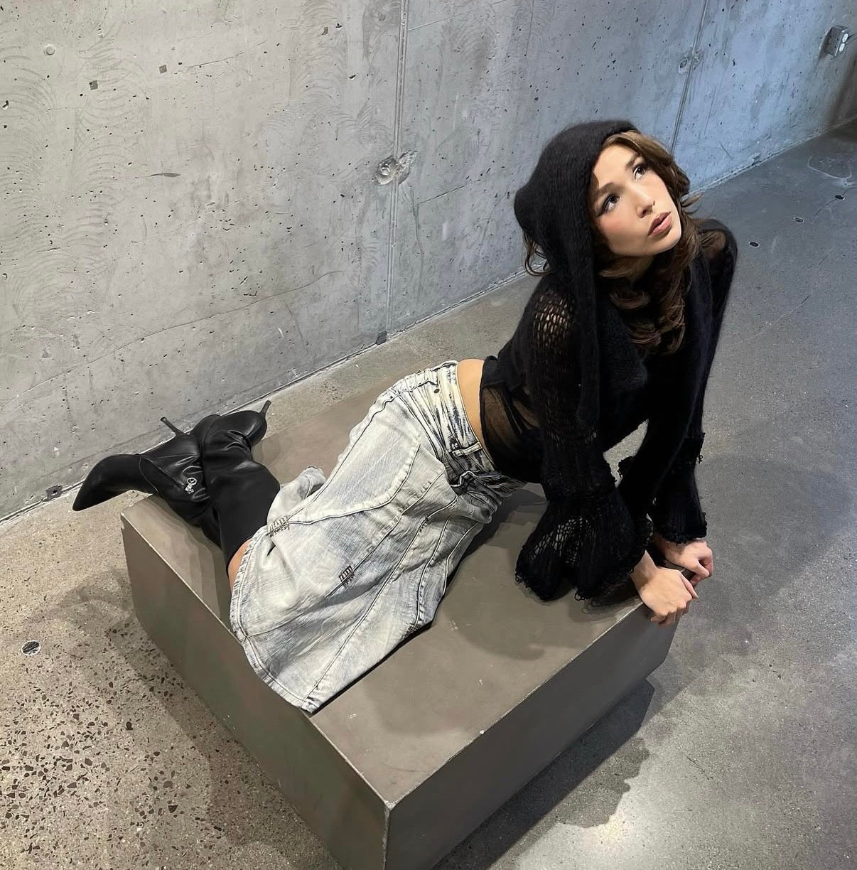 -high level of workmanship on display in this piece. Blending mohair seamlessly into the delicate mesh material, alongside pairings of glossy velvet finishes on the sleeve cuffs and some of the hems. Body is semi sheer and with layered mesh fabric, meant to sit tight to the body