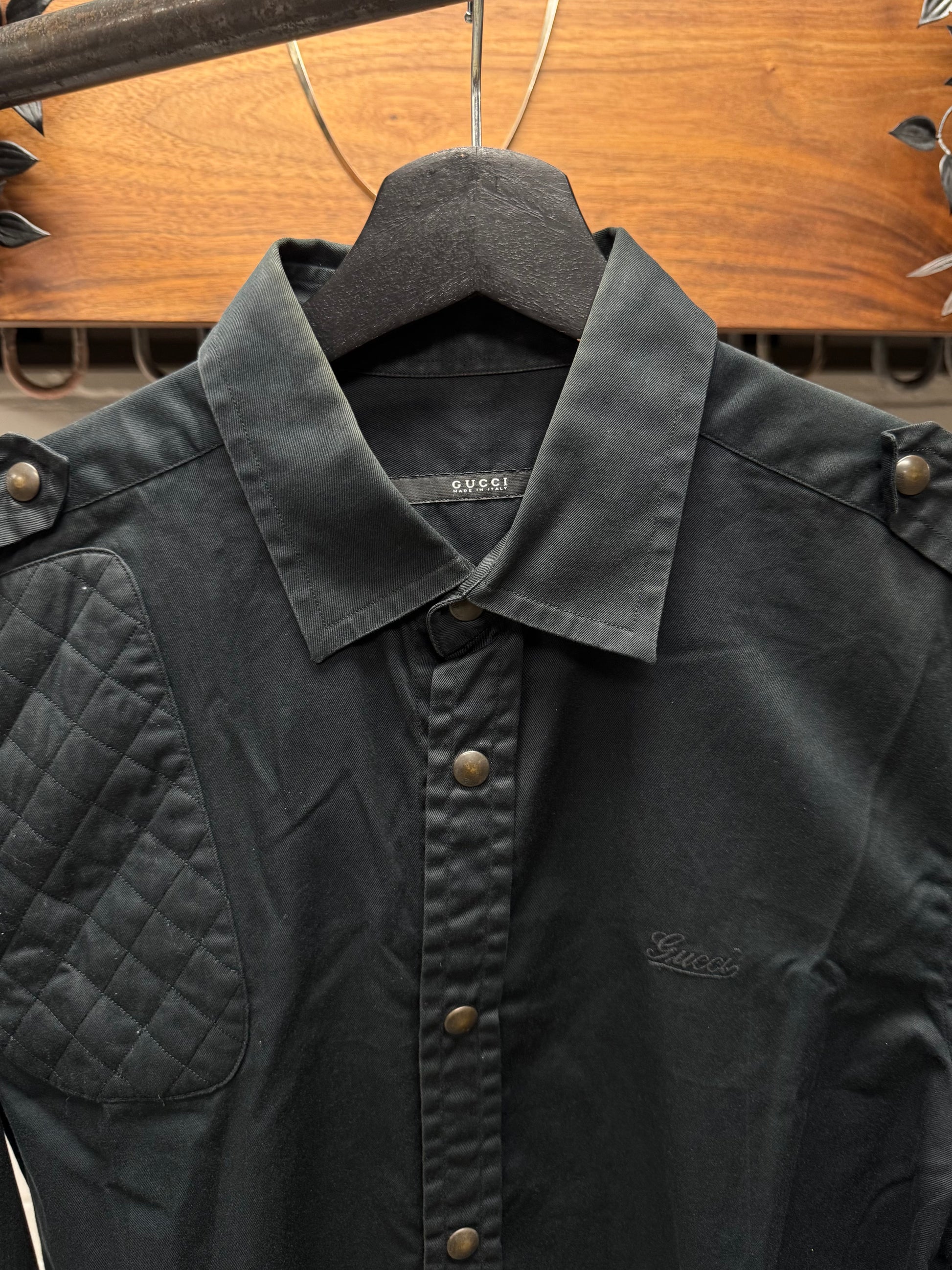 2000s Gucci Quilted Shoulder Detail Button Snap Black Military Shirt