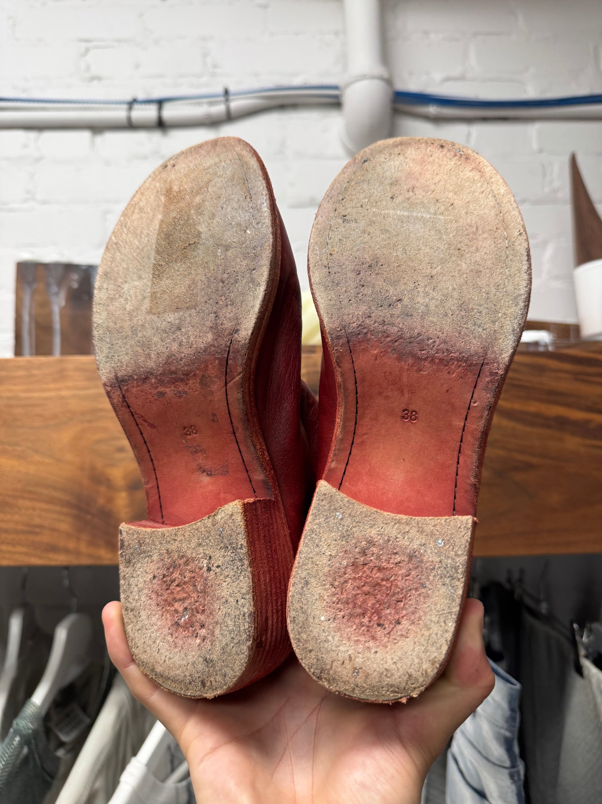 -beautifully textured and aged full grain horse leather in an oxblood red