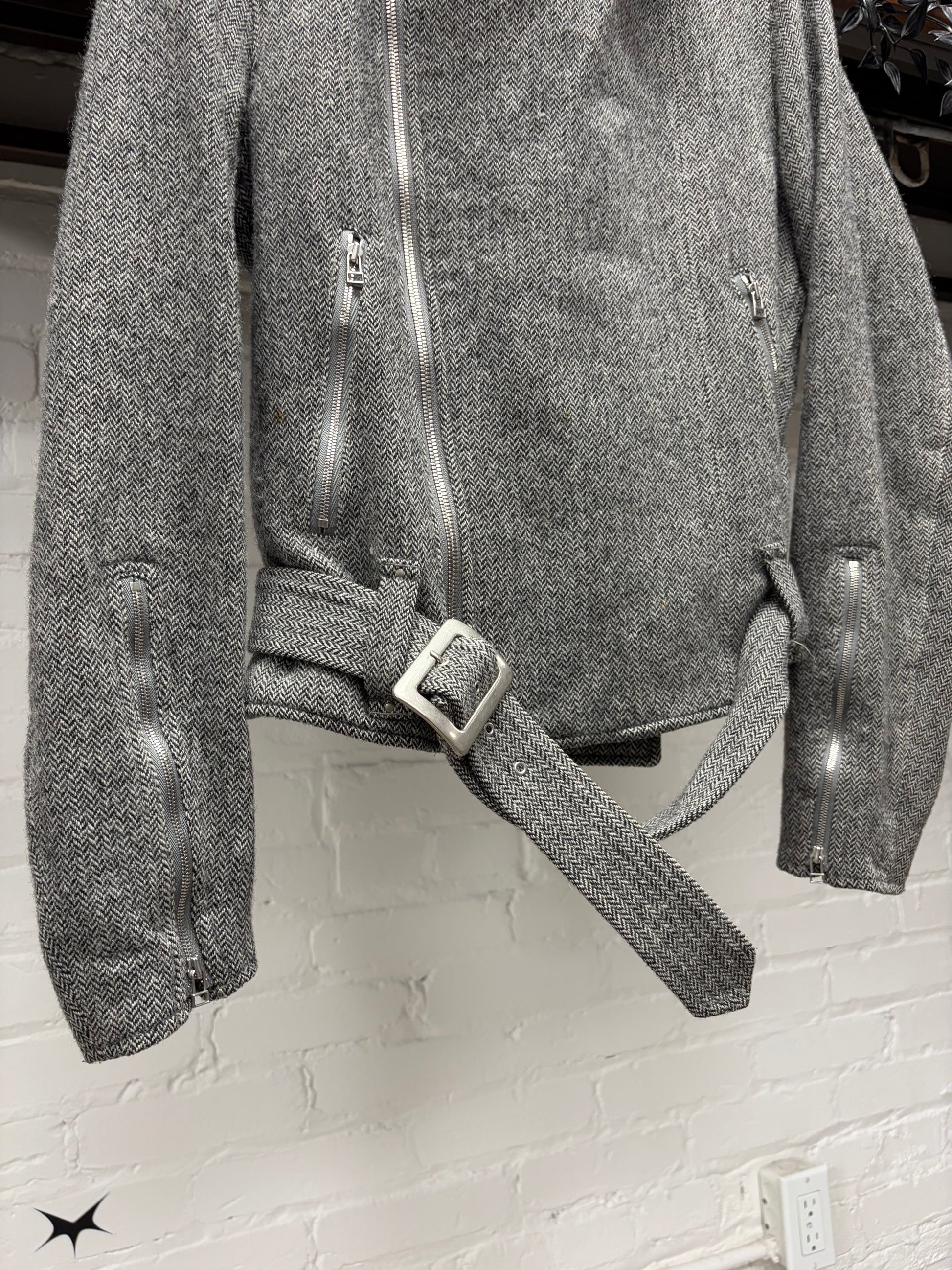 -gorgeous grey herringbone patterned wool, done on a classic perfecto zip style biker jacket. Makes for a sleek and well insulated piece of winter outerwear. Helmut Lang just does it right.