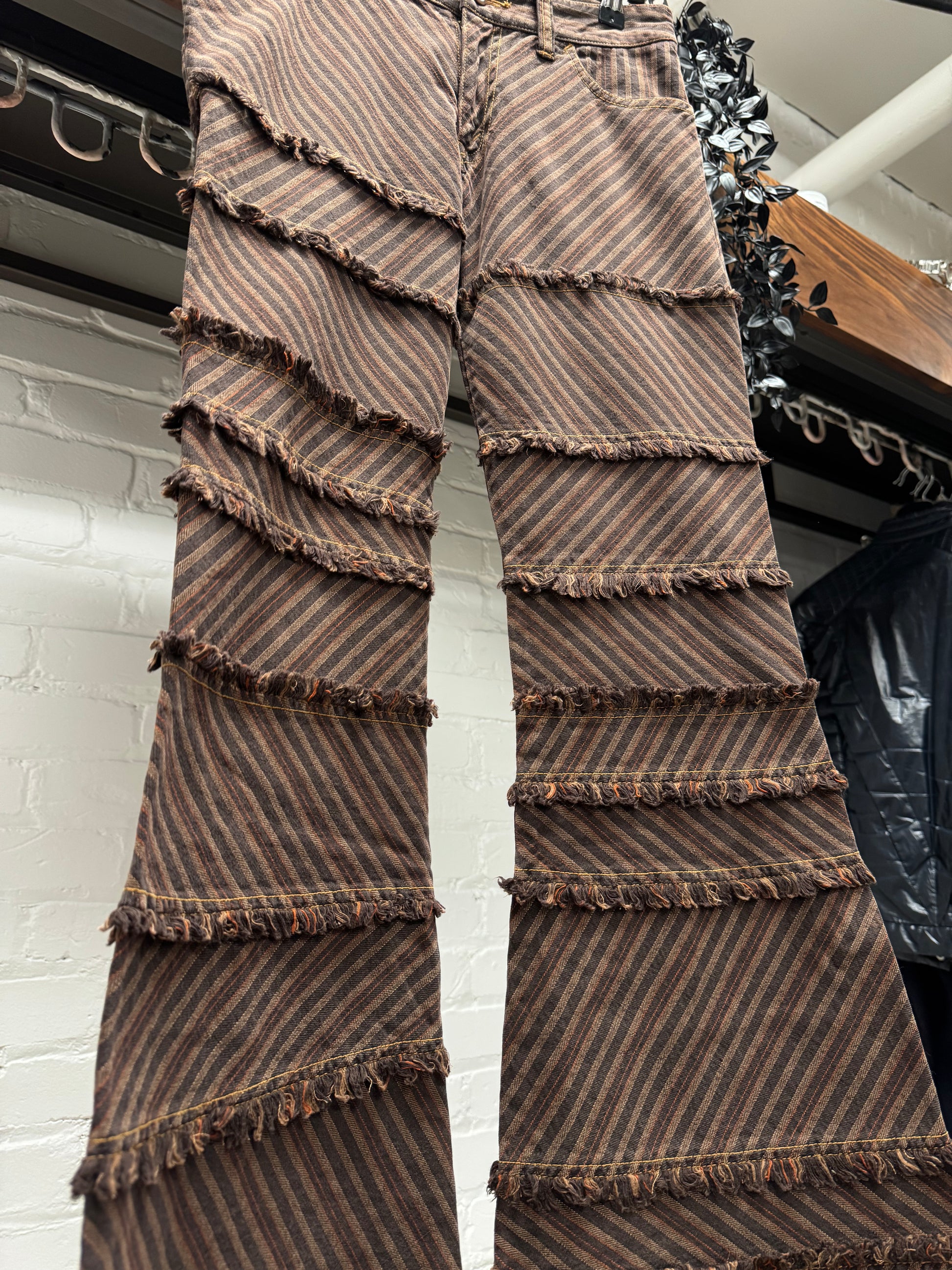 -brown striped denim with raw fringe trimming around each panel of the jeans stacking horizontally and flaring outwards in the shape of the jeans.