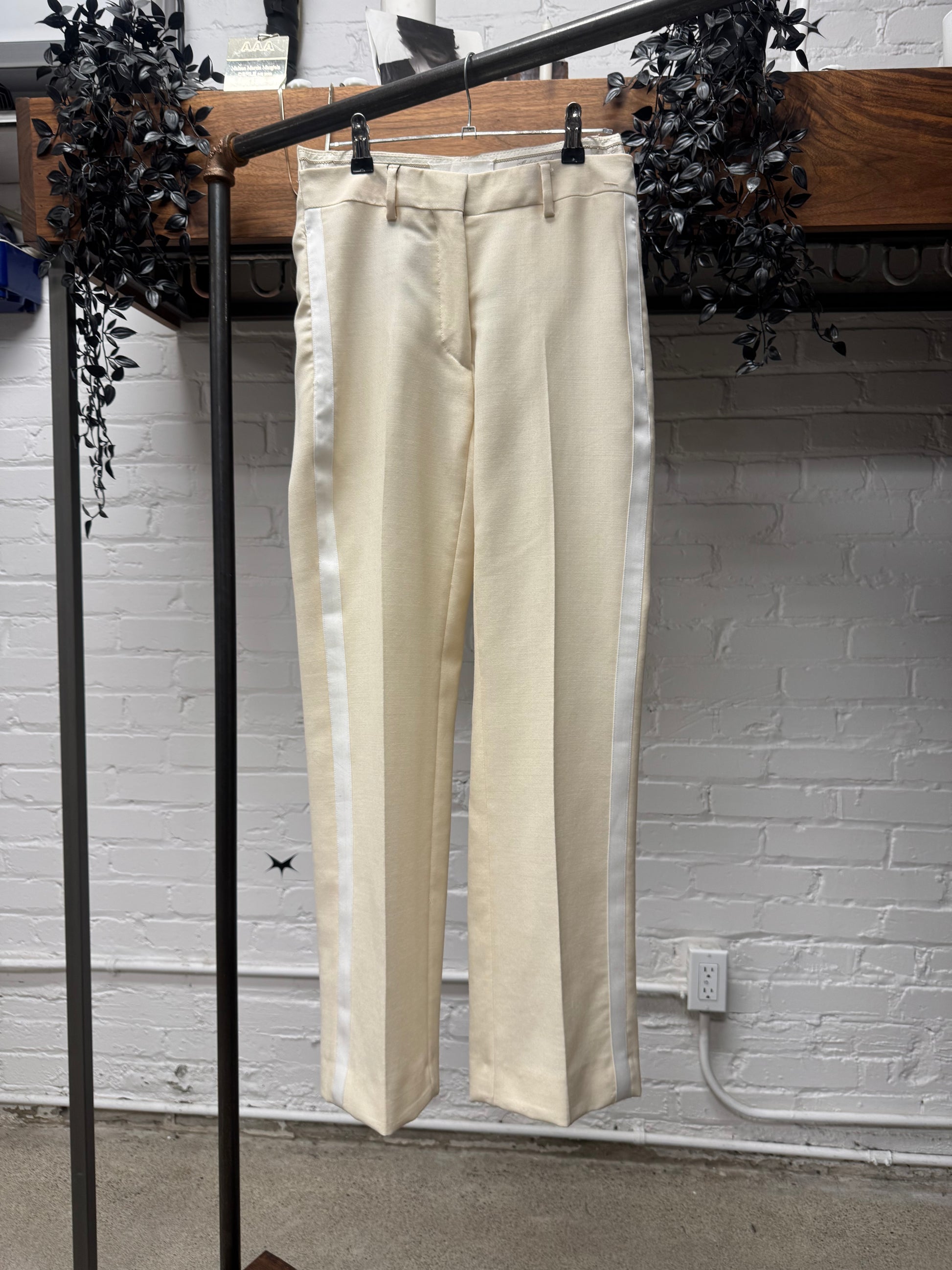 -marching band style trousers with a removed front waistband. Gives the rise a more dropped look and allows for the hips to be more exposed in a flattering manner.