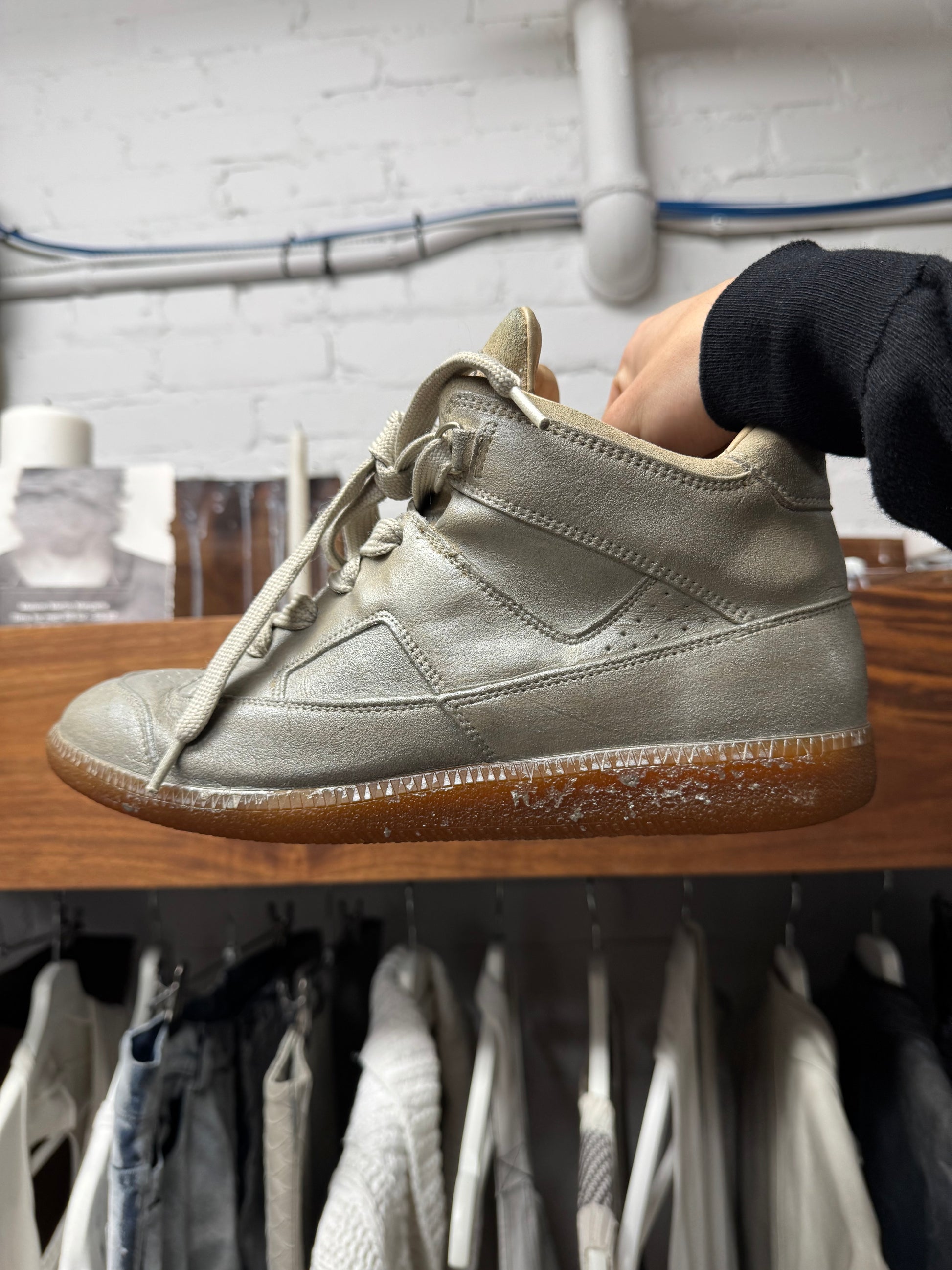 -2000s mid top pair of Maison Margiela German Army Trainers. Taupe brown leather upper paired with gum sole