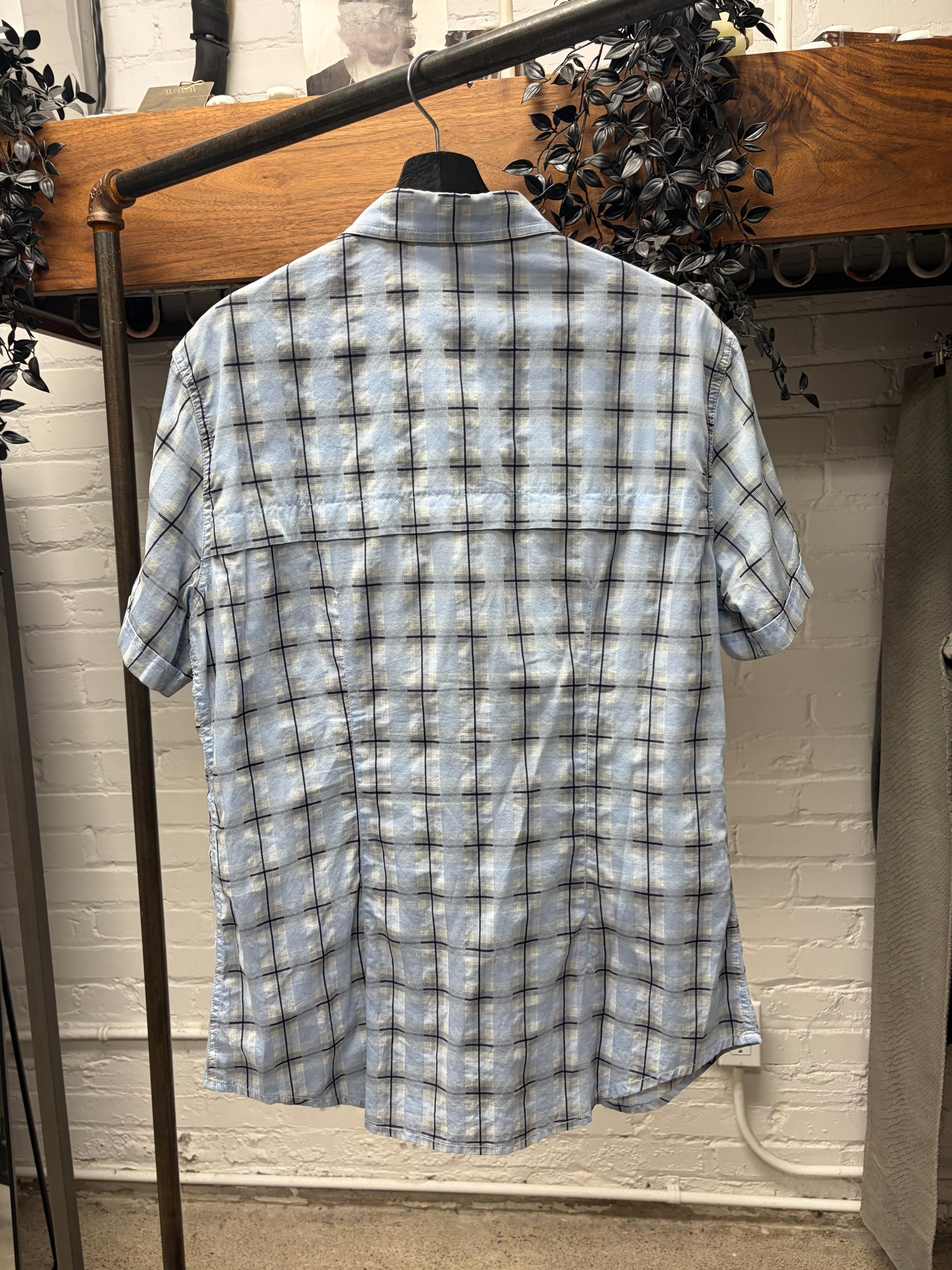 For sale is a 2000s Prada Sport Tartan Plaid Patterned Short Sleeve Zip-Up Shirt