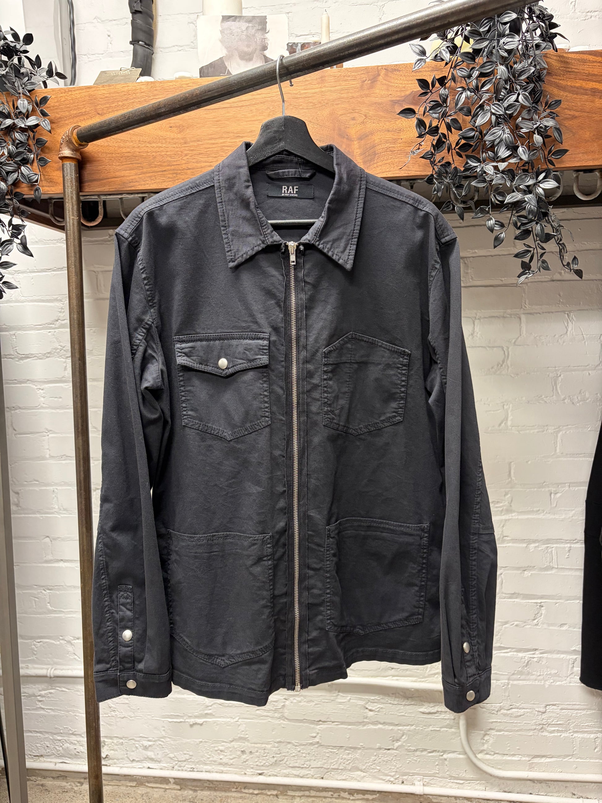 For sale is a 2000s Raf by Raf Simons Black Collared Zip-Up Work Jacket