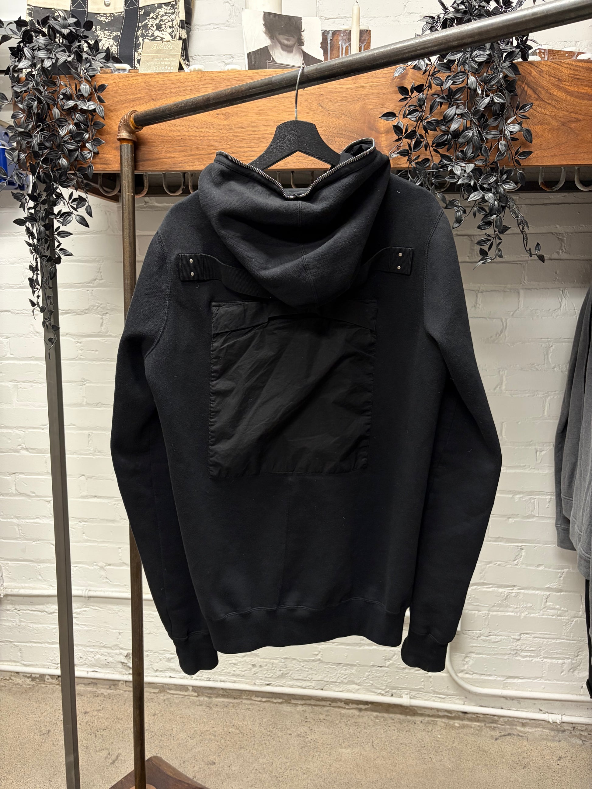 For sale is a Rick Owens ‘Gimp’ Black Patched Cargo Back Full-Zip Hoodie