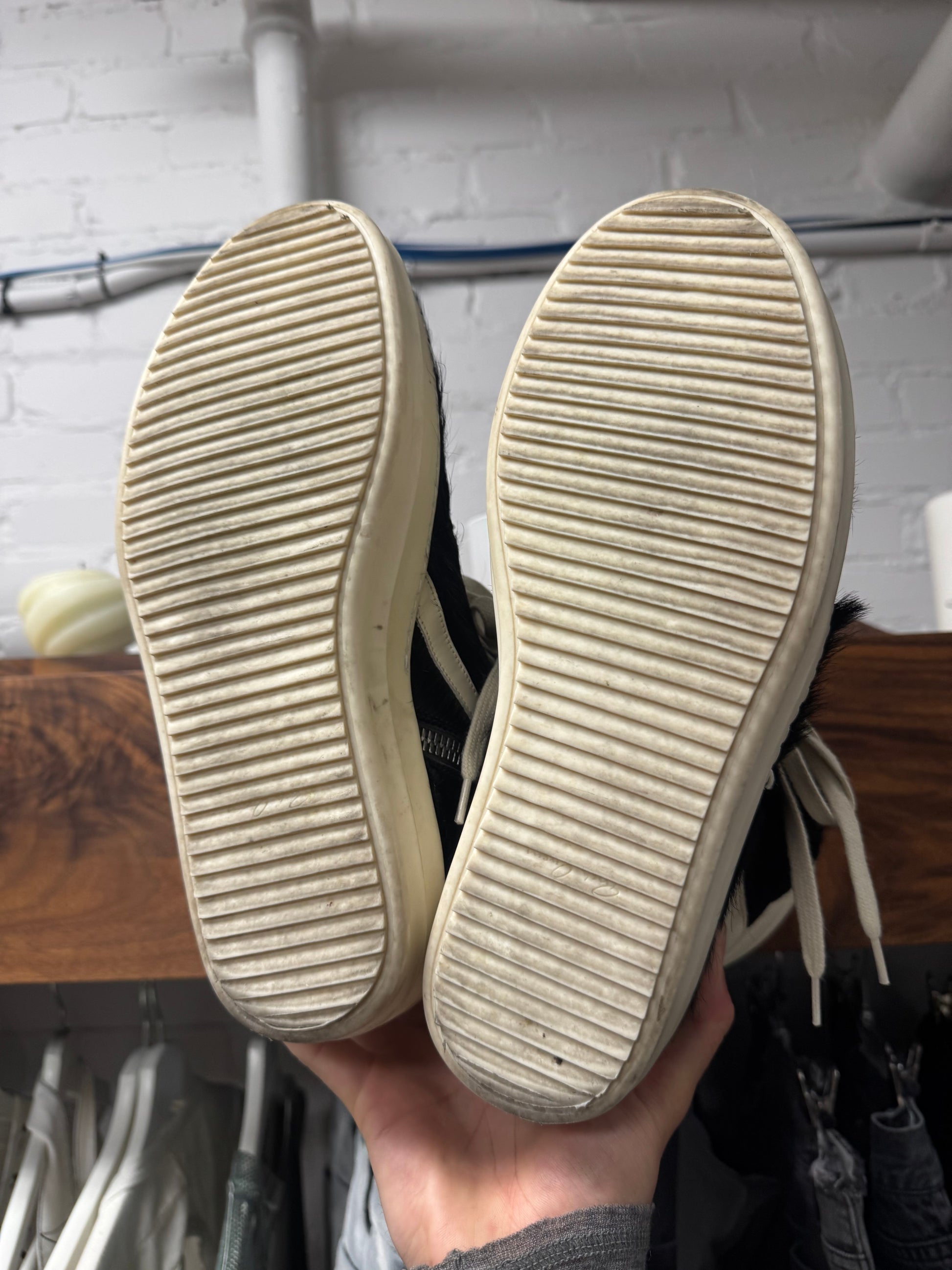 For sale is a pair of Rick Owens Black Pony-Hair ‘Geobasket’ High Top Sneakers