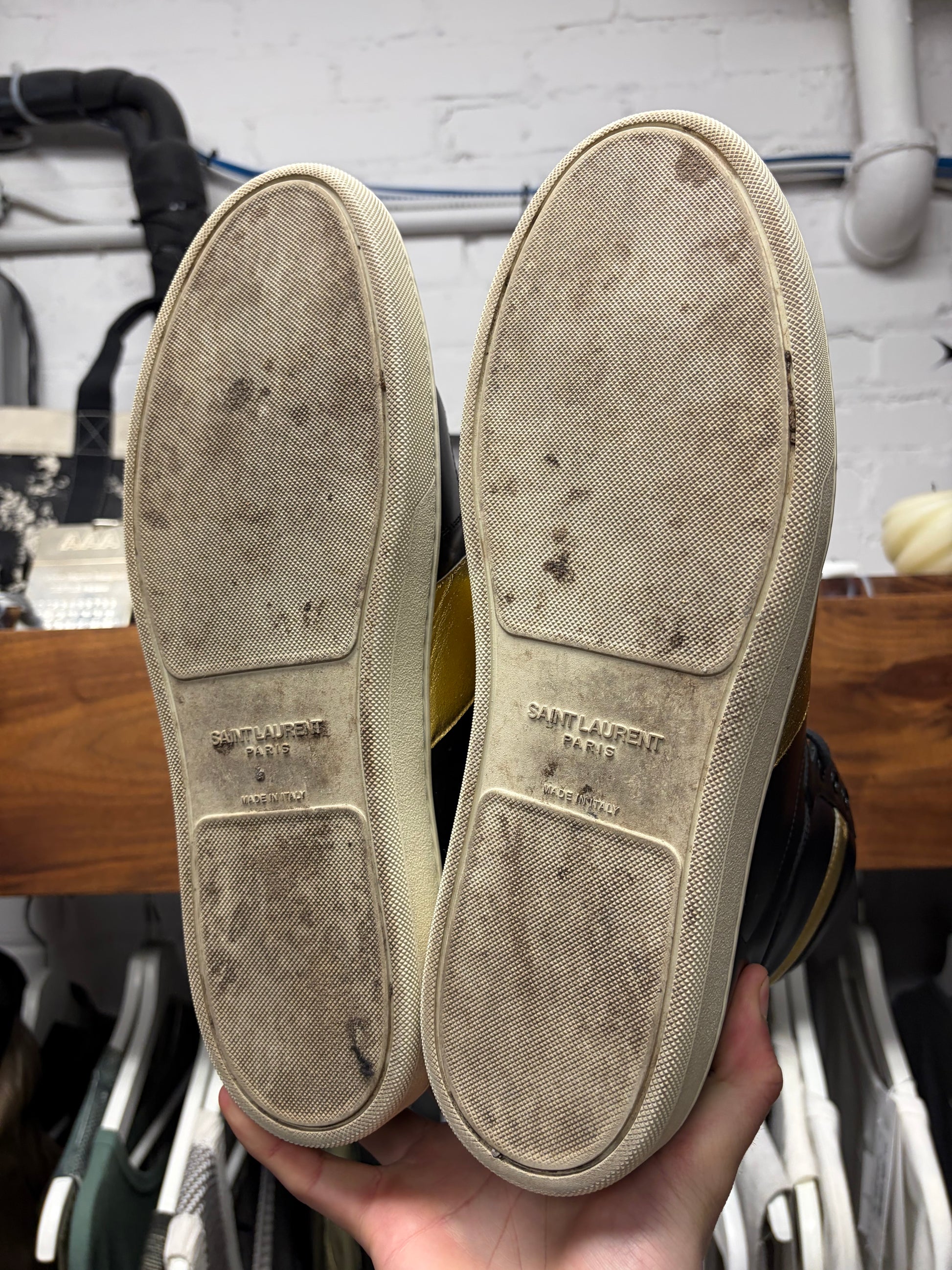 For sale is a pair of Saint Laurent ‘SL/10H’ Black/Gold Leather Court High Top Sneakers