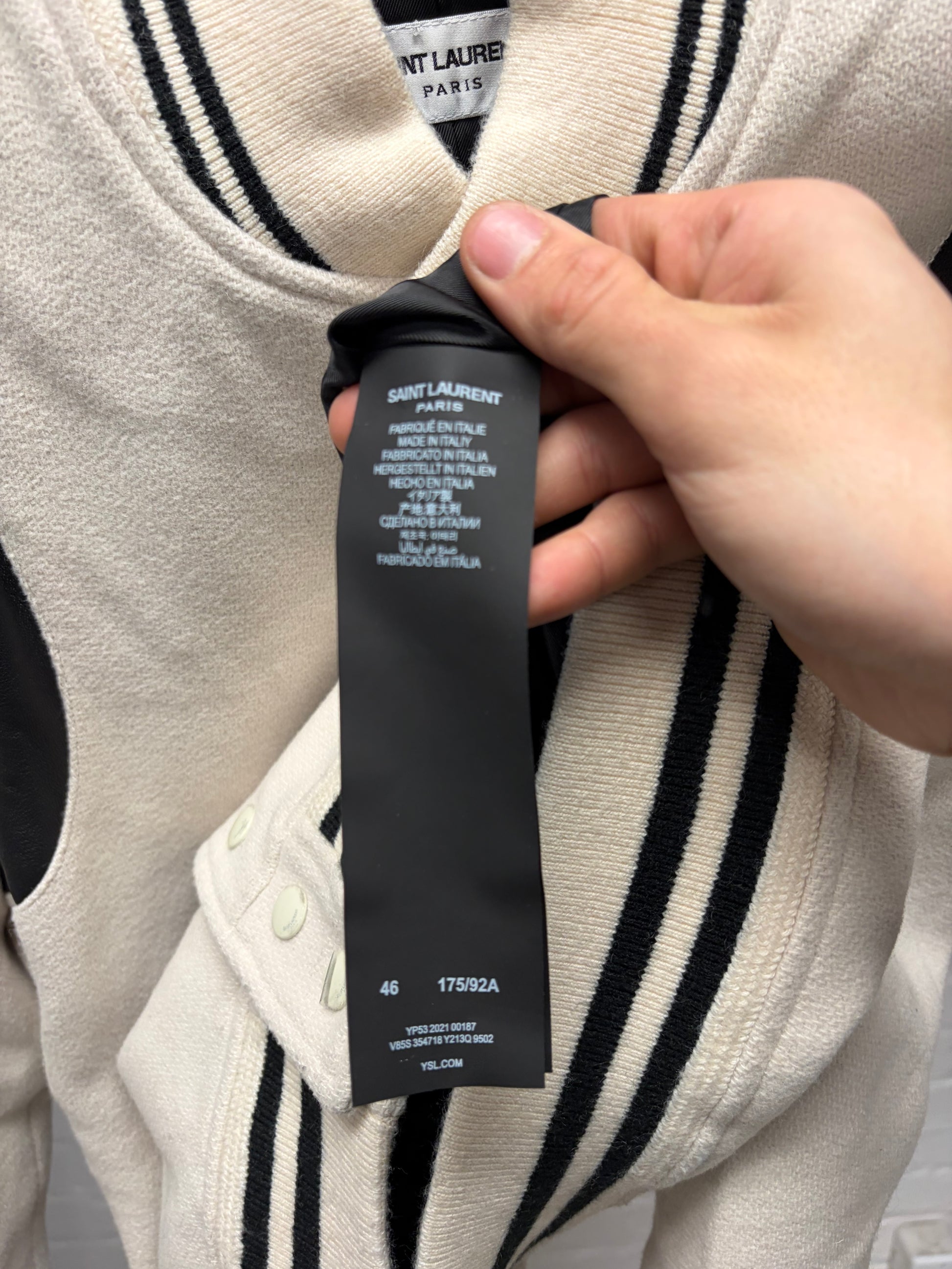 (FOR SALE) A 2021 Saint Laurent ‘Teddy’ Wool/Leather Cream White Varsity Jacket