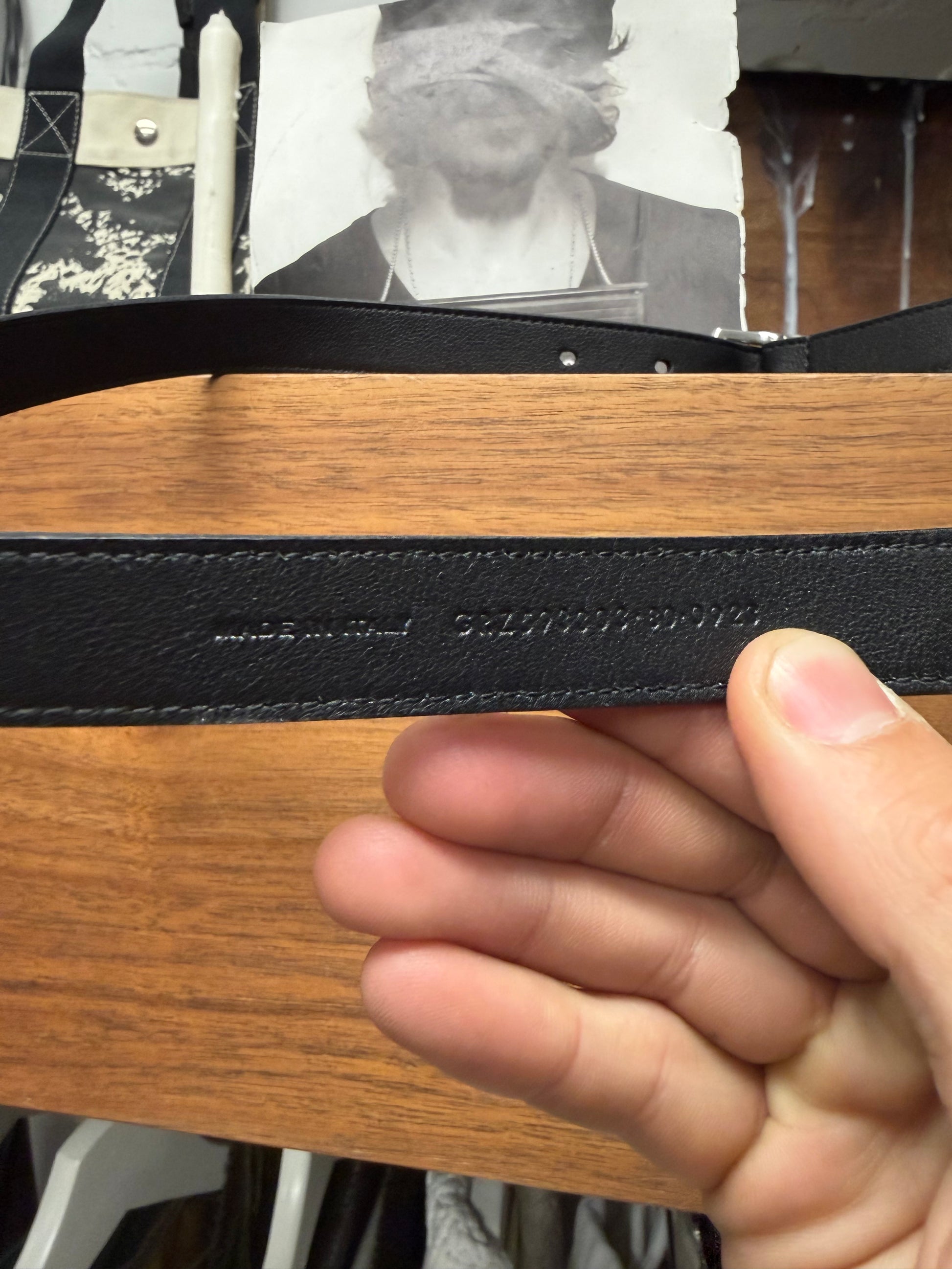 -minimalist thin leather belt with engraved Saint Laurent branding on the buckle.