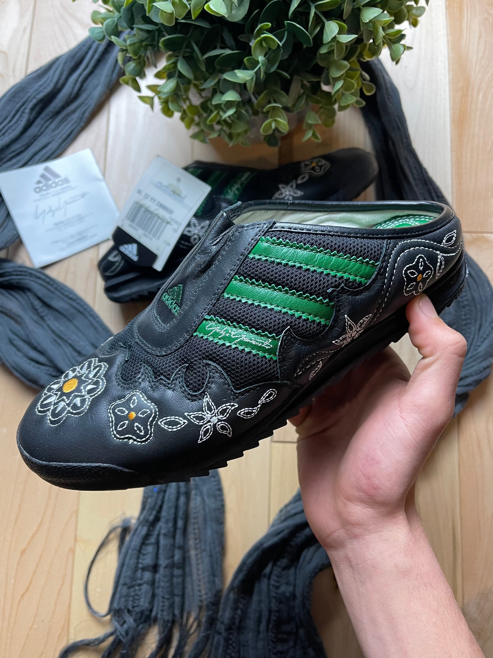 Spring Summer 2002 Yohji Yamamoto x Adidas Low Top Embroidered Floral Mules. One of the first ever Yohji Yamamoto sneakers before Y-3 was founded in 2003. Size U.S. 5 (UK 5) and comes with OG box. New with tags attached.