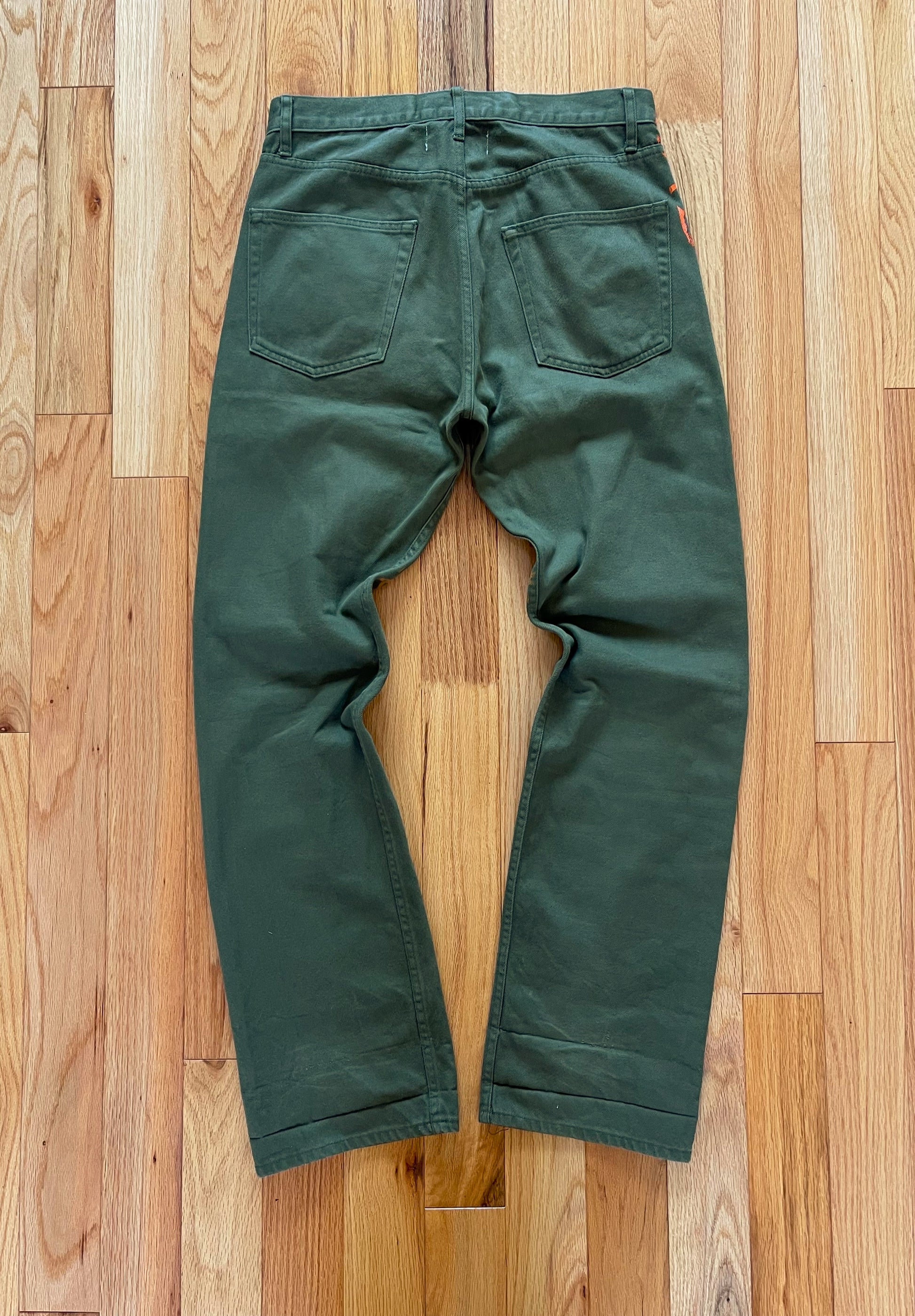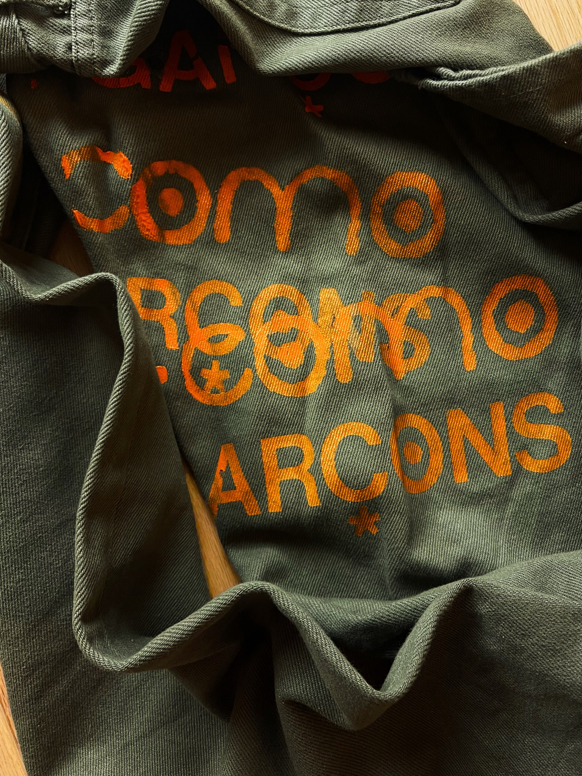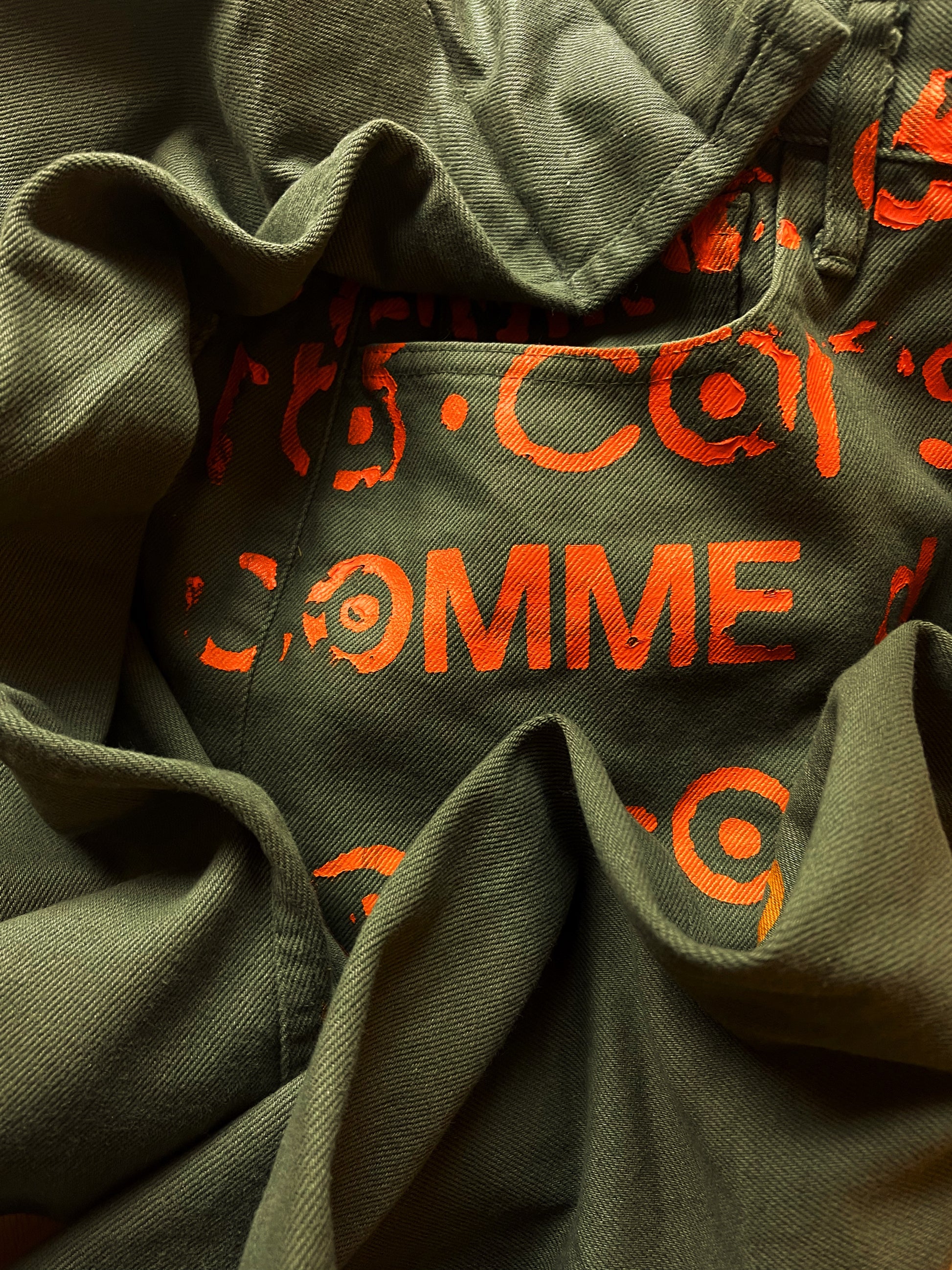 Created in collaboration with 10 Corso Como, the collaborative company is an Italian based art gallery that supports multi-disciplinary forms of expression, choosing to not only host bodies of work in their space, but to also create their own mediums such as this pair of Junya Watanabe Levi’s denim hand painted with their branding across the waist. With a gorgeous moss green wash and vibrant orange illustrations throughout, these jeans have a bootcut fit, suitable for a 32 inch waist or smaller if belted. Here is the opportunity to purchase an iconic piece from Junya Watanabe’s original Spring Summer 2003 release.