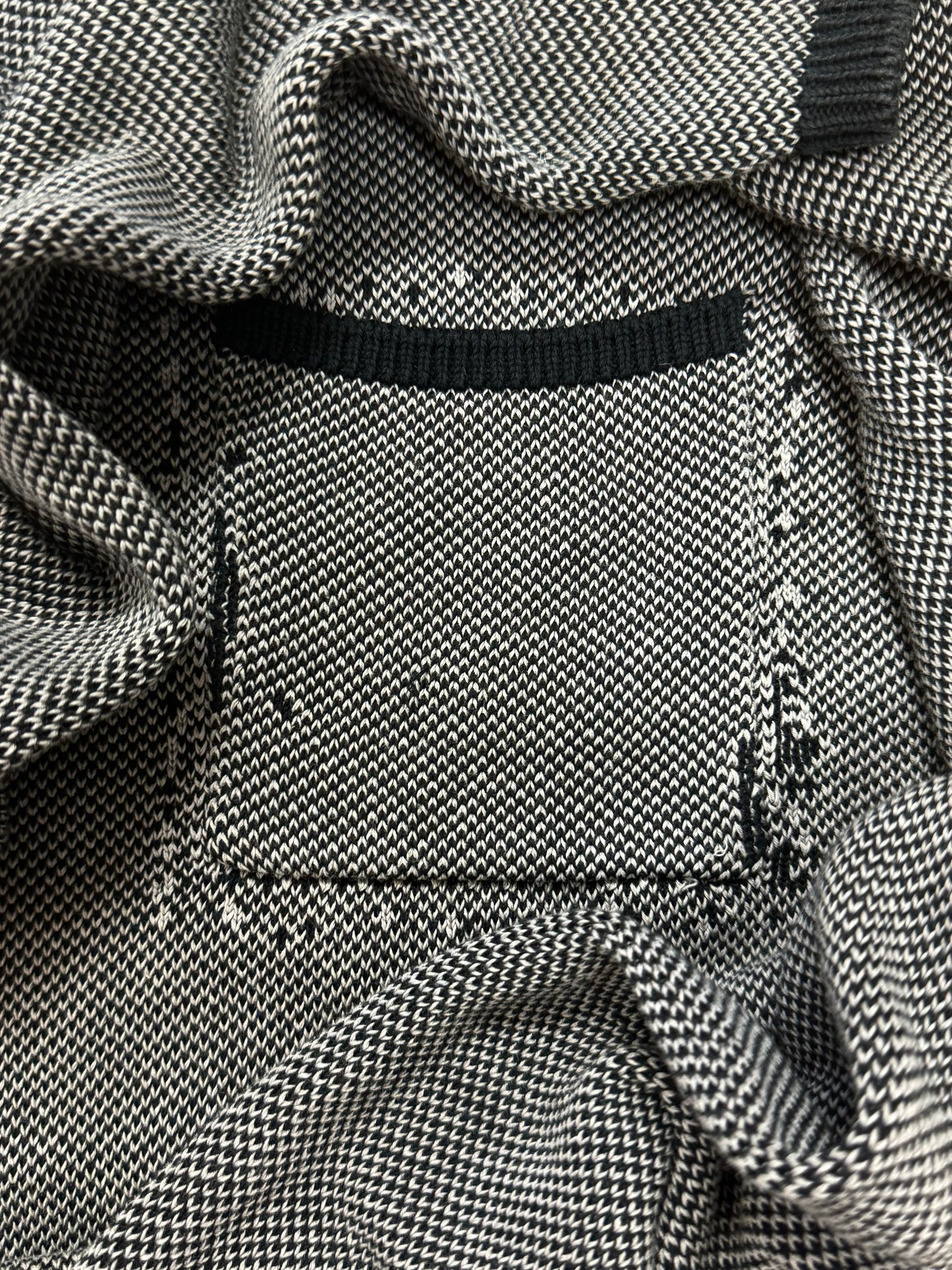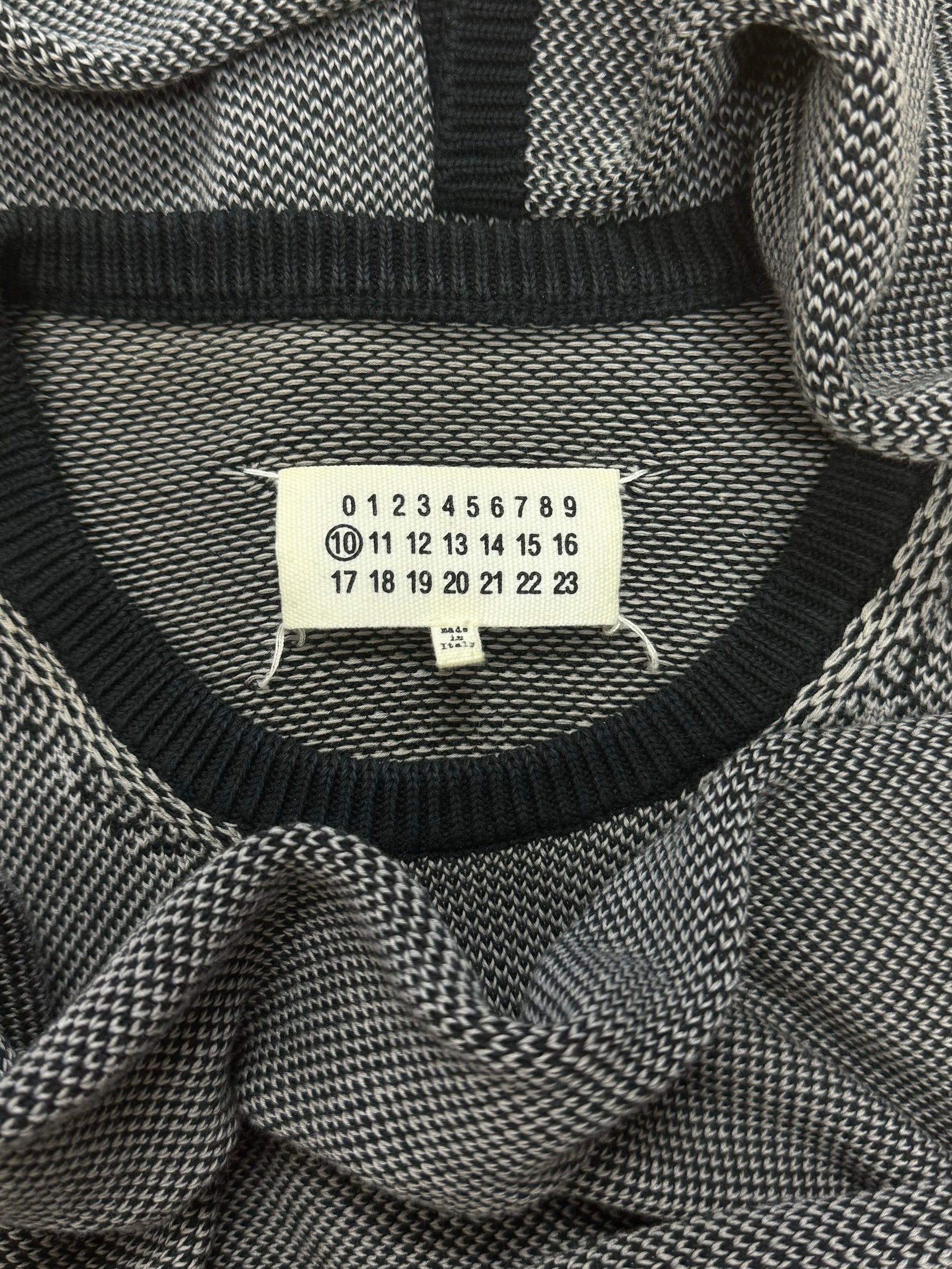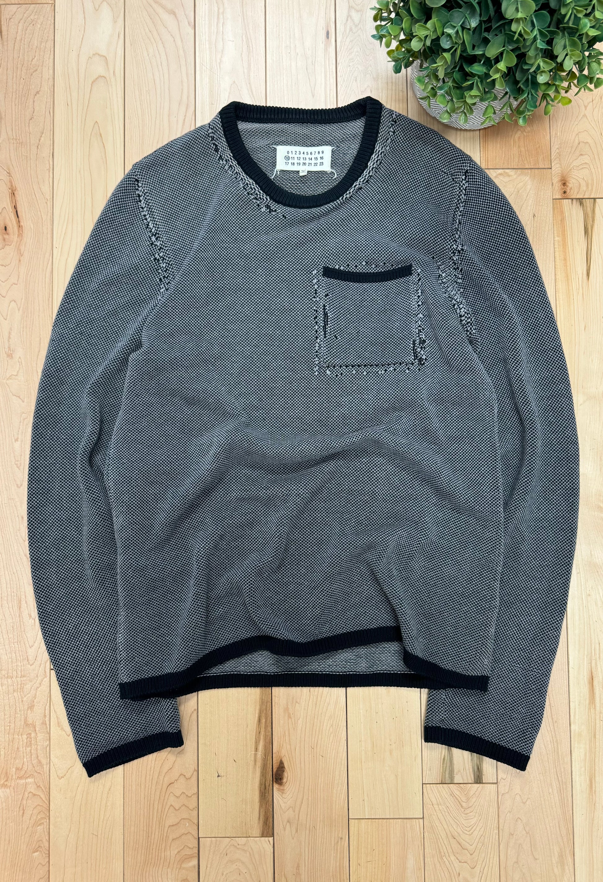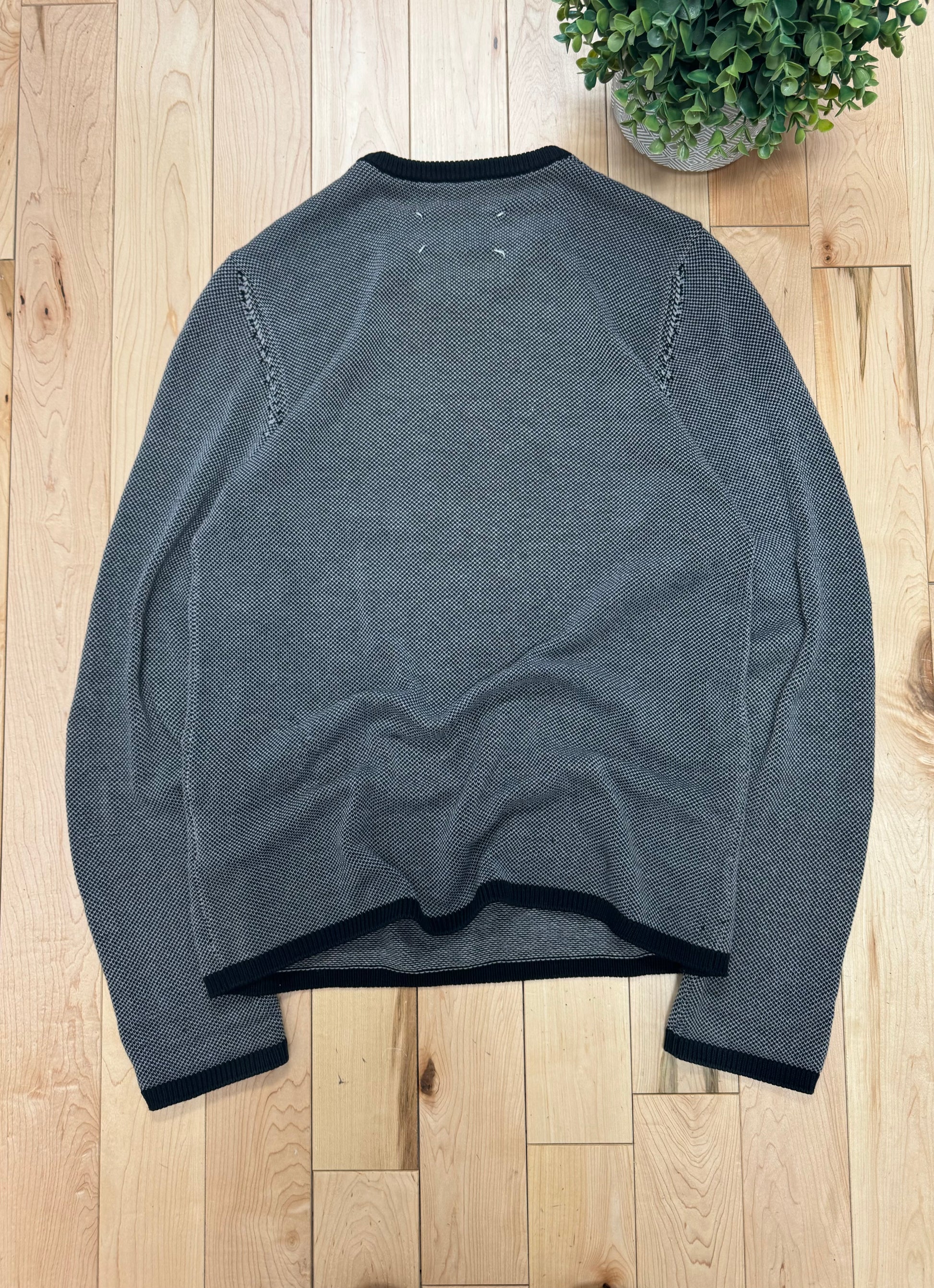 For sale is a classic Spring Summer 2015 Maison Margiela ‘Trompe L’oeil’ Distressed Knit Sweater. Utilizing illusionary black thread mixed into the otherwise sleek grey knit, this piece is designed to have the appearance of a heavily thrash distressed sweater through this optical depth trick using different thread. Best suited for a size medium, this piece is in pristine overall condition with no flaws whatsoever. Here is the opportunity to purchase a timeless Maison Margiela knit sweater for an outstanding price.