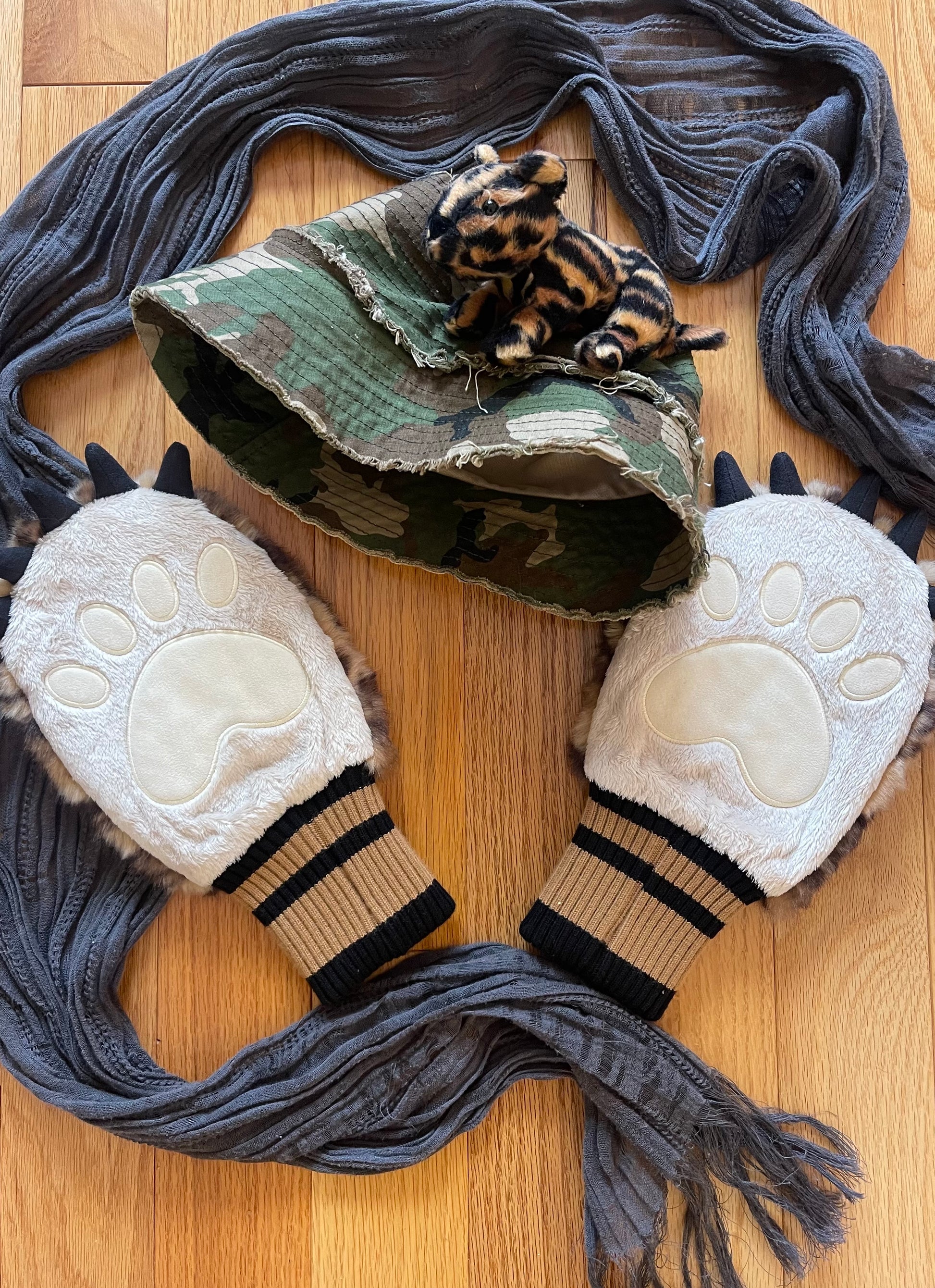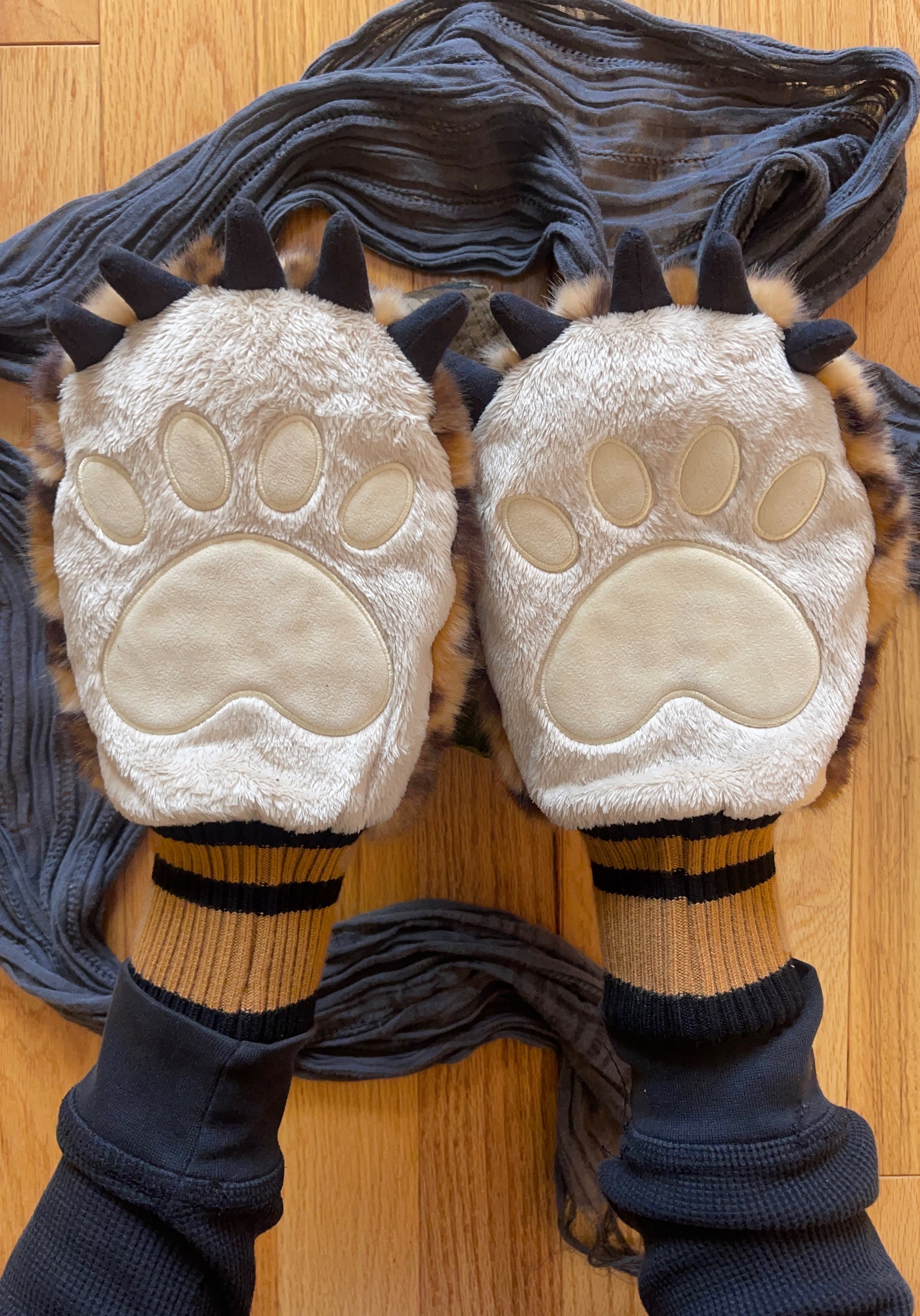For their Spring Summer 2017 collection, Dolce & Gabbana poked fun at the idea of wearing animals (ie fur/leather) by literally having their models wearing animals. From polar bear back packs to leopard stuffed animals dangling off bucket hats, D&G did not shy away from being outstated for this presentation. These particular mittens feature paw marks on the interior side with claws poking out at the fingertips. In perfect overall condition with no flaws, here is the opportunity to purchase a rare pair of Dolce & Gabbana leopard paw gloves.