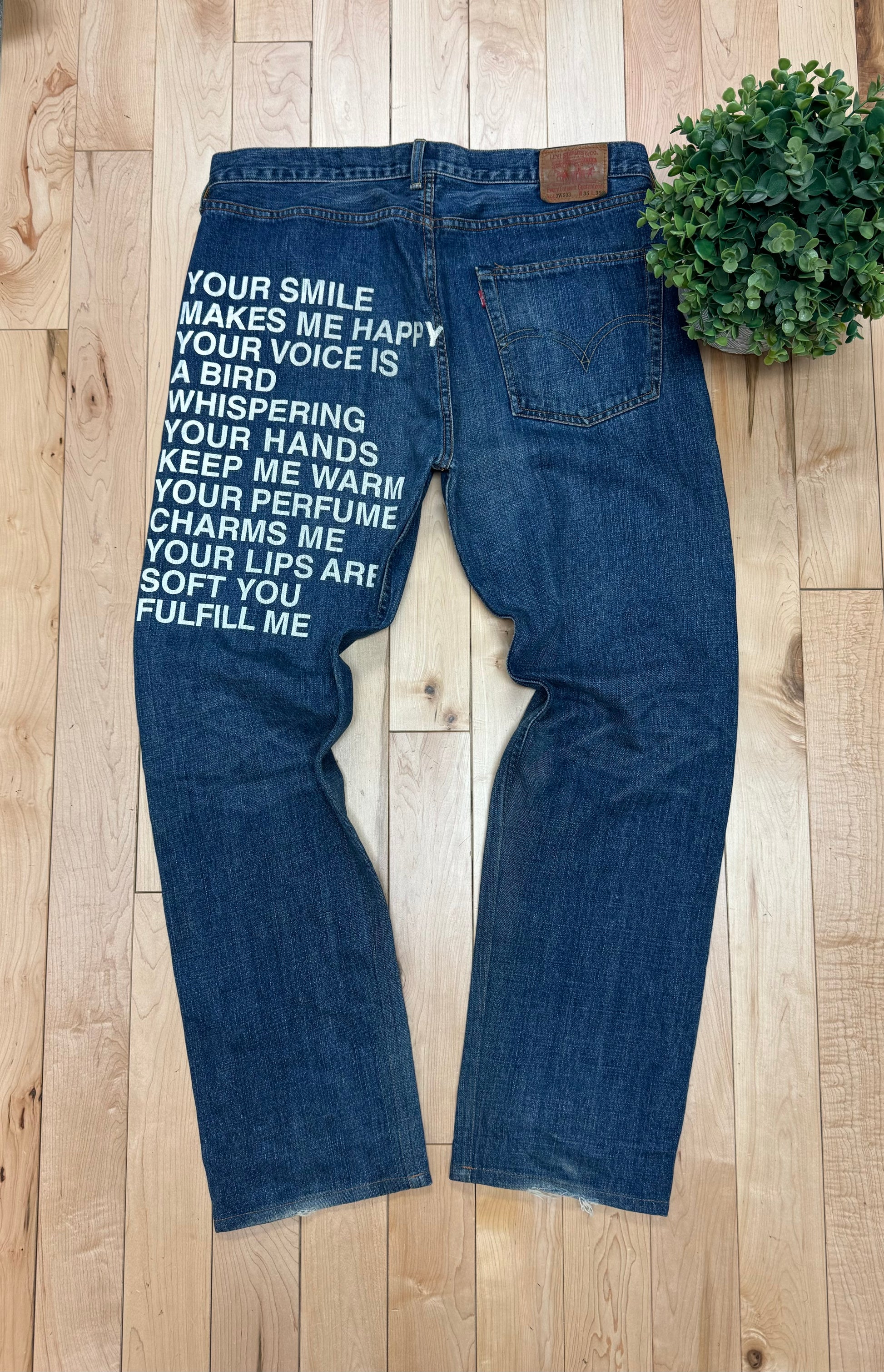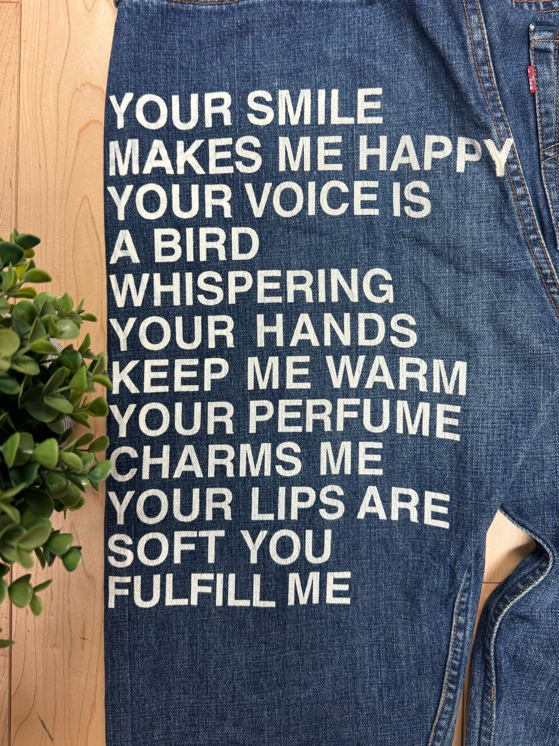 For sale is the most iconic pair of Spring Summer 2002 Junya Watanabe x Levi’s ‘Poem’ Denim. For Junya Watanabe’s debut menswear collection, Watanabe asked his staff to write poems on their perception of what love means. Coming in a rare size large, this piece is a size 35 waist and is in pristine overall condition with minimal wear, the print which is in great shape. Here is the opportunity to purchase a true collectors grail from Junya Watanabe’s Spring Summer 2002 debut menswear collection.