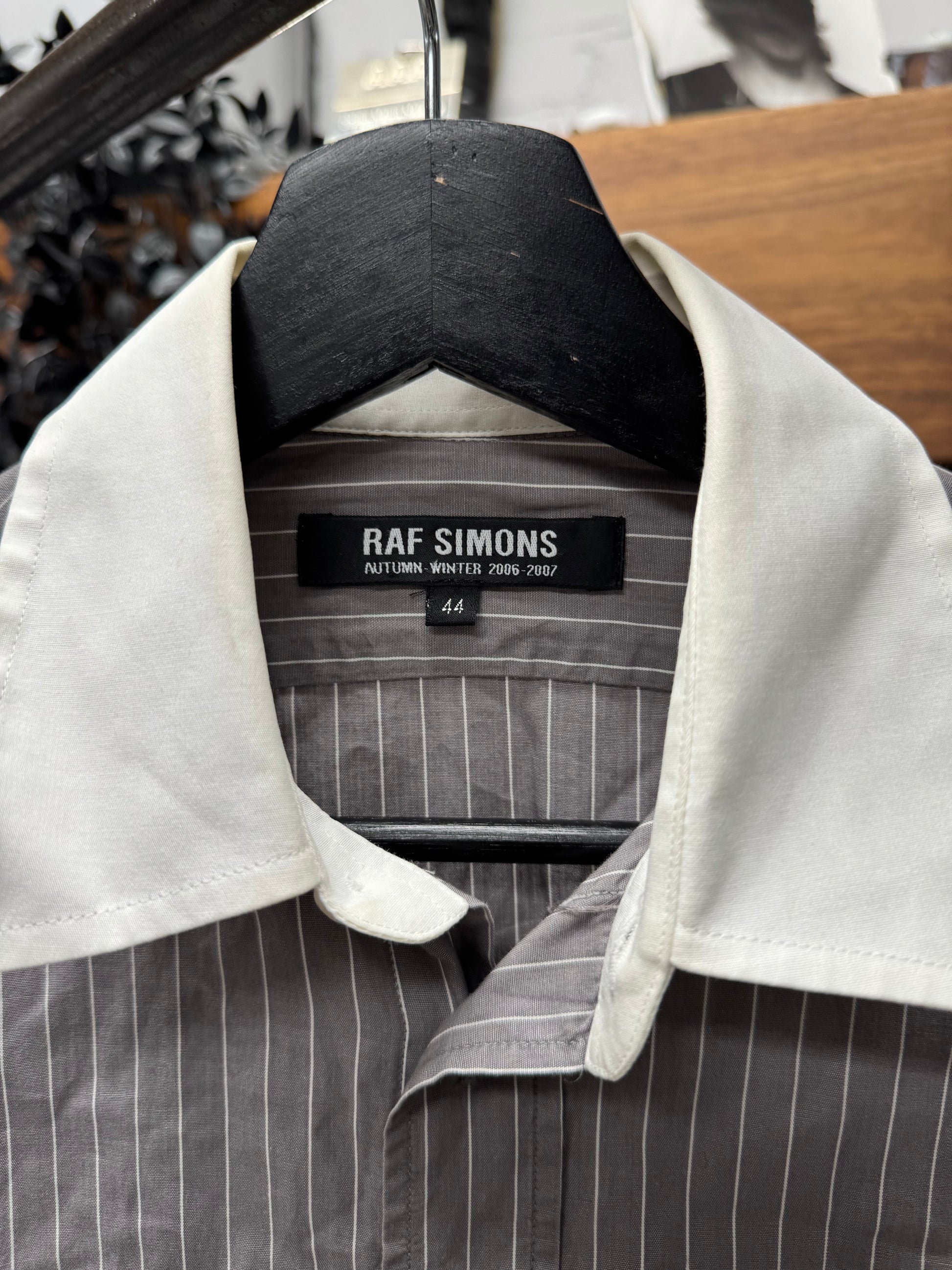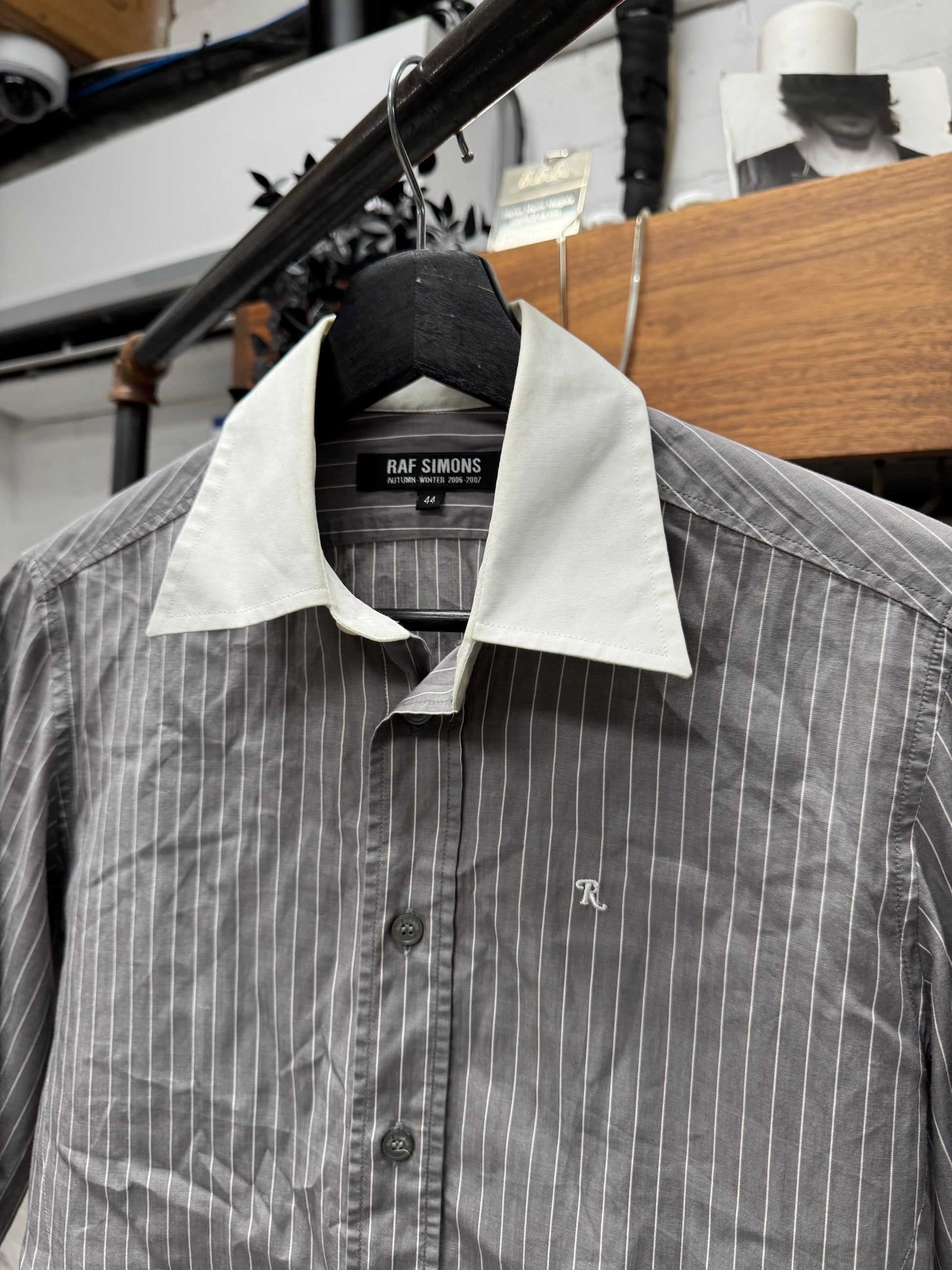 -From Raf Simon’s SS2006 menswear collection, featuring a cursive R logo branded on the chest with pinstripe pattern print and solid white collar/cuffs