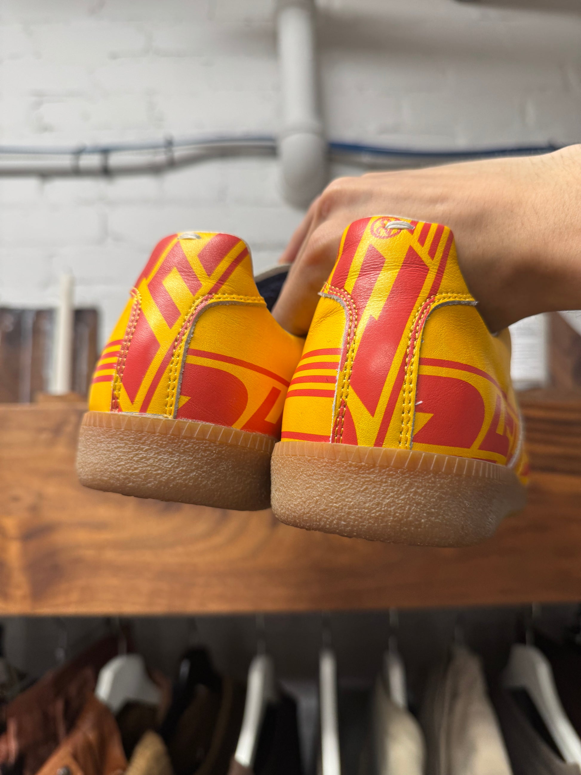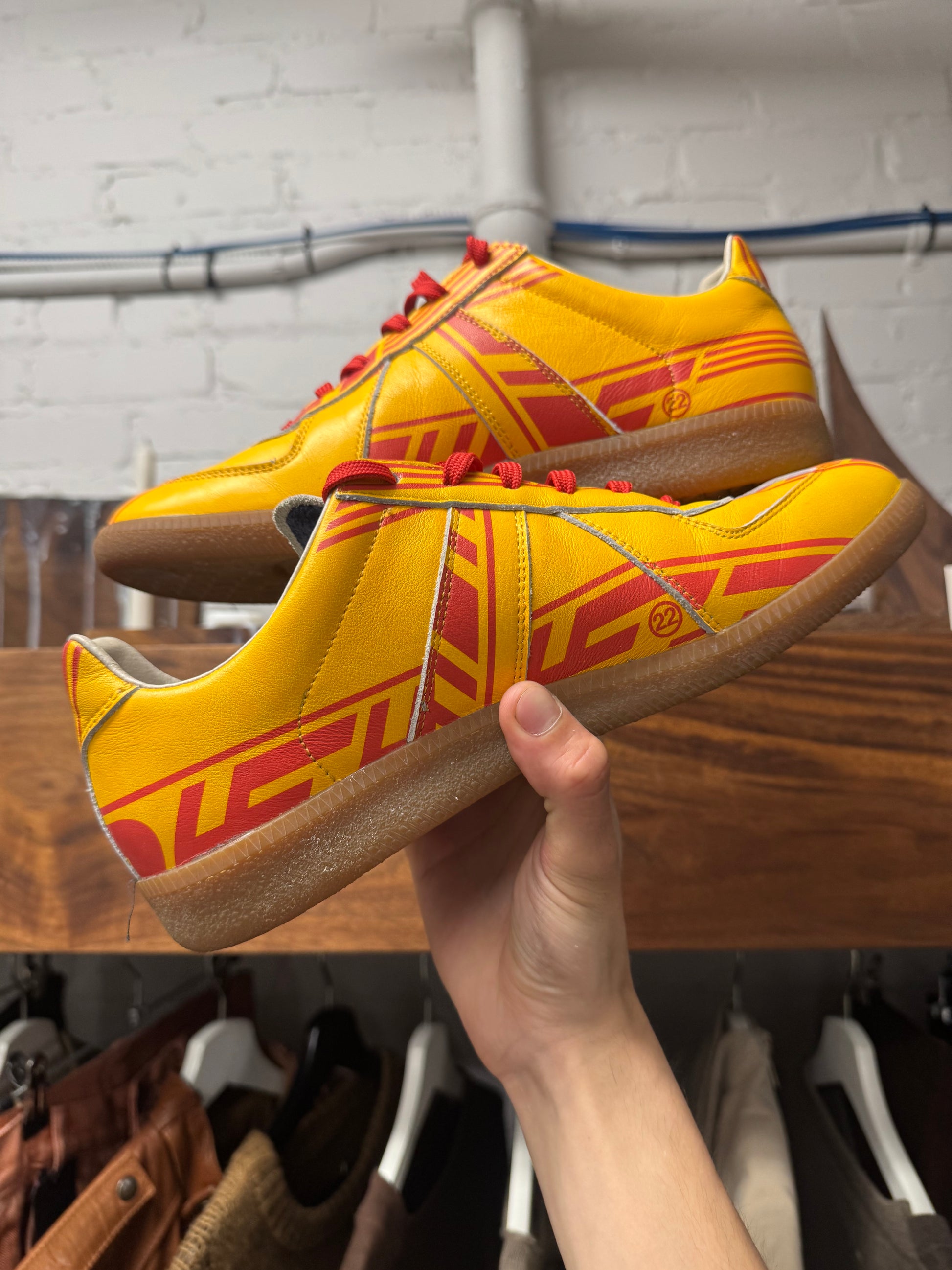 -limited release pair of Maison Margiela German Army Trainers, made with a leather upper and design intended to replicate the look of the multinational shipping and logistics company.