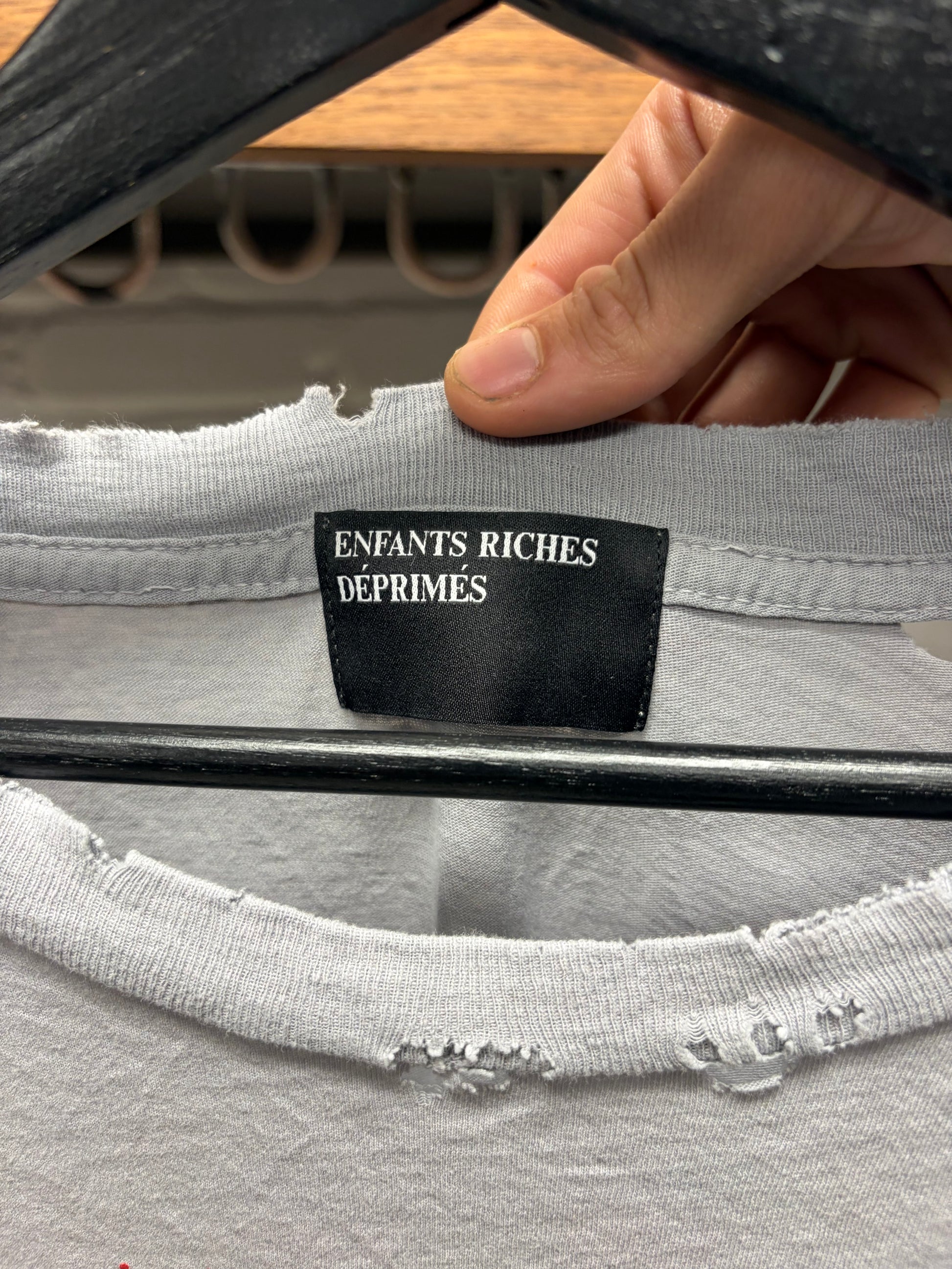 For sale is a SS2025 Enfants Riches Deprimes ‘Checkered Fan’ Distressed Grey Cotton T-Shirt