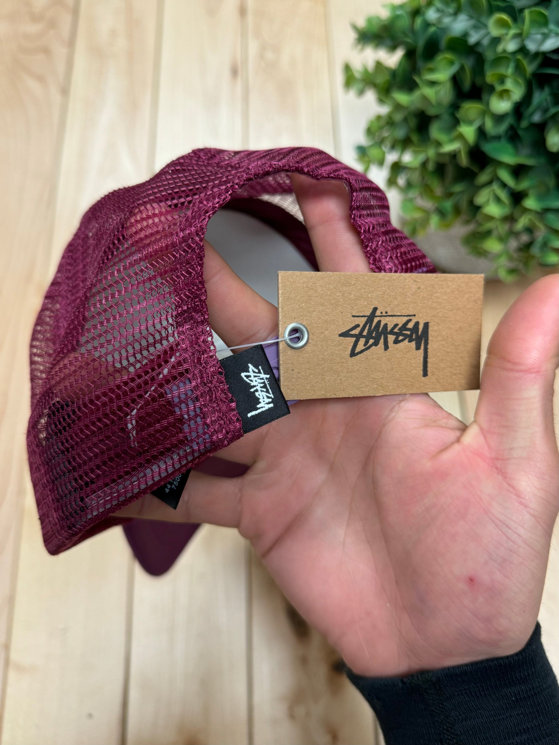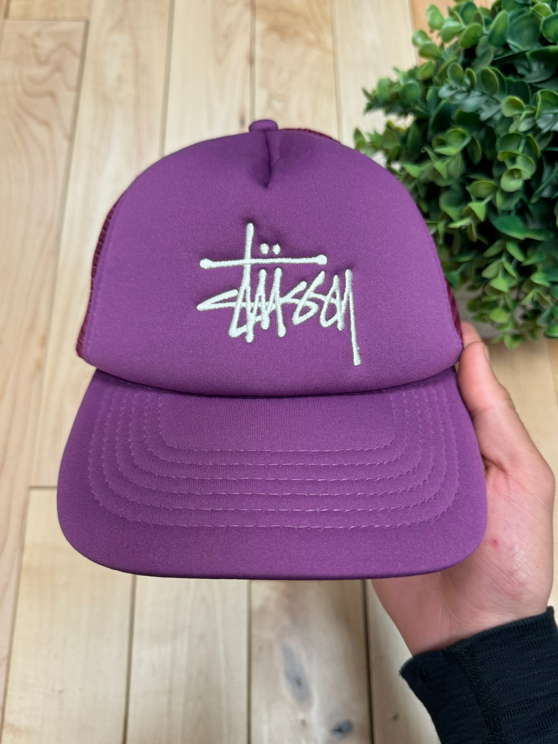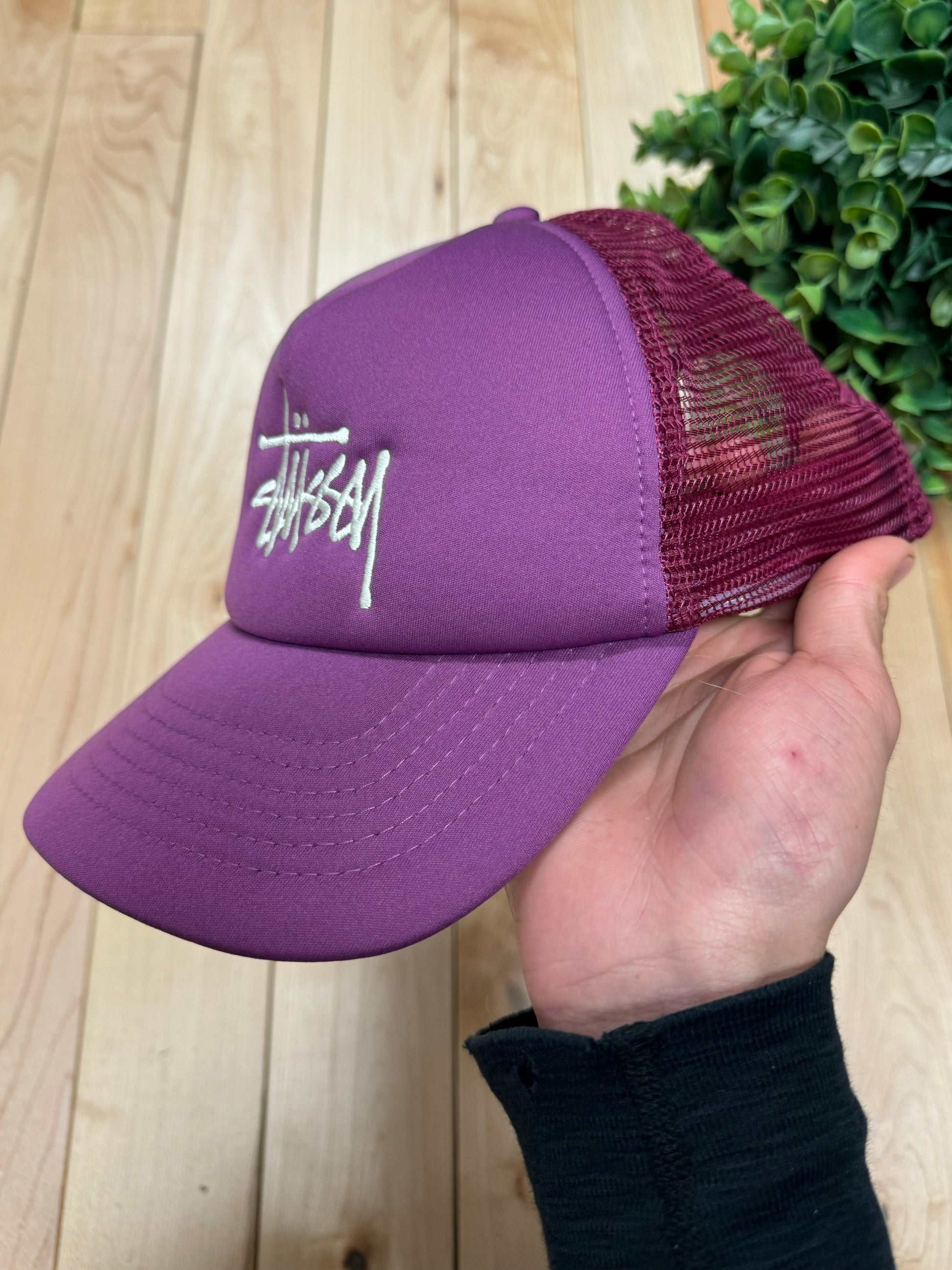 For sale is a classic Stussy Purple/White Logo Mesh Trucker Hat. Featuring the signature Stussy logo embroidered across the front panel, this hat comes new with tags attached and is in pristine overall condition with no flaws. Here is the opportunity to purchase a timeless Stussy trucker hat for a fantastic price.