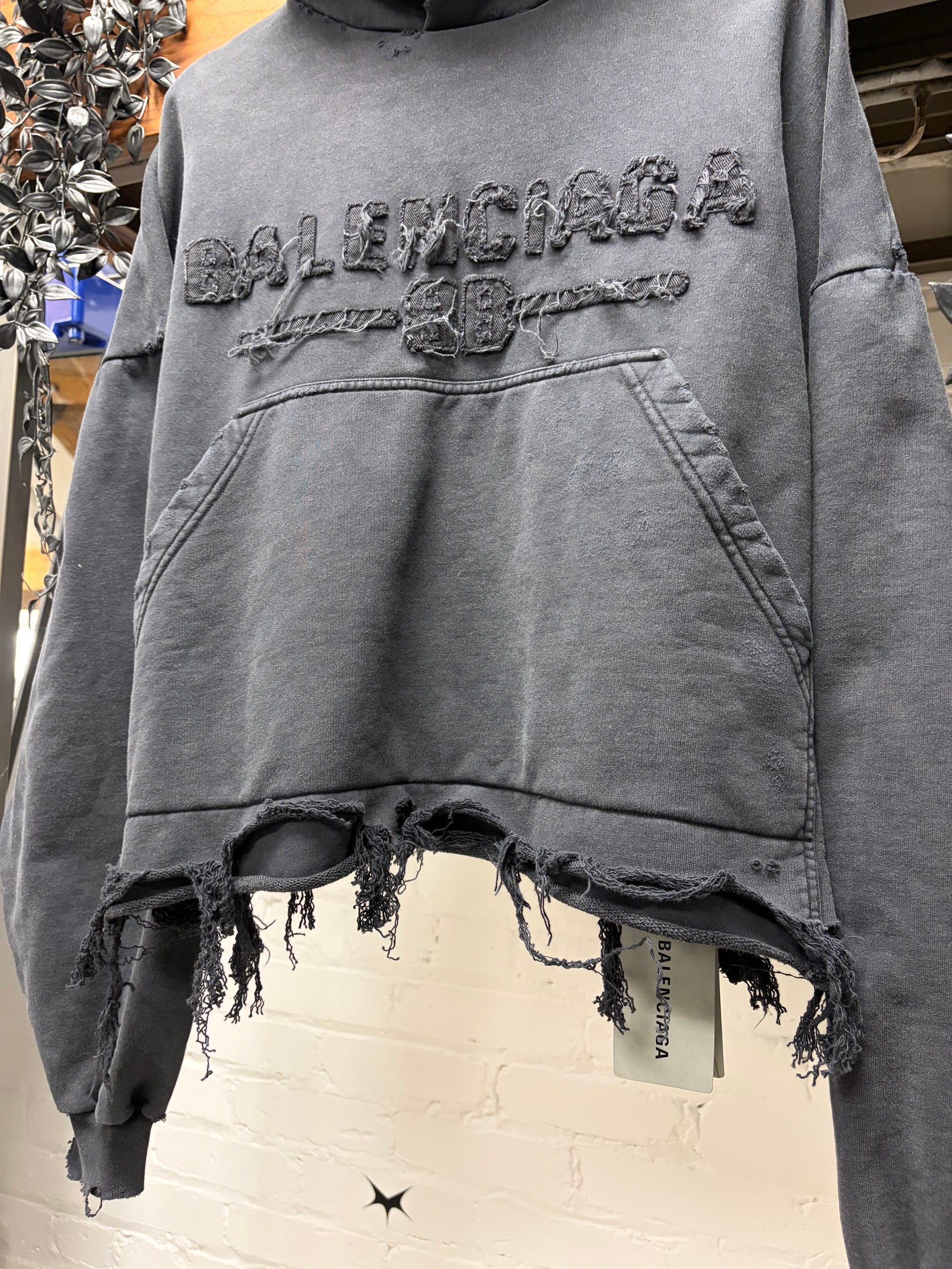 SS2025 Balenciaga Destroyed Distressed Cropped Black Heavy Cotton Logo Hoodie